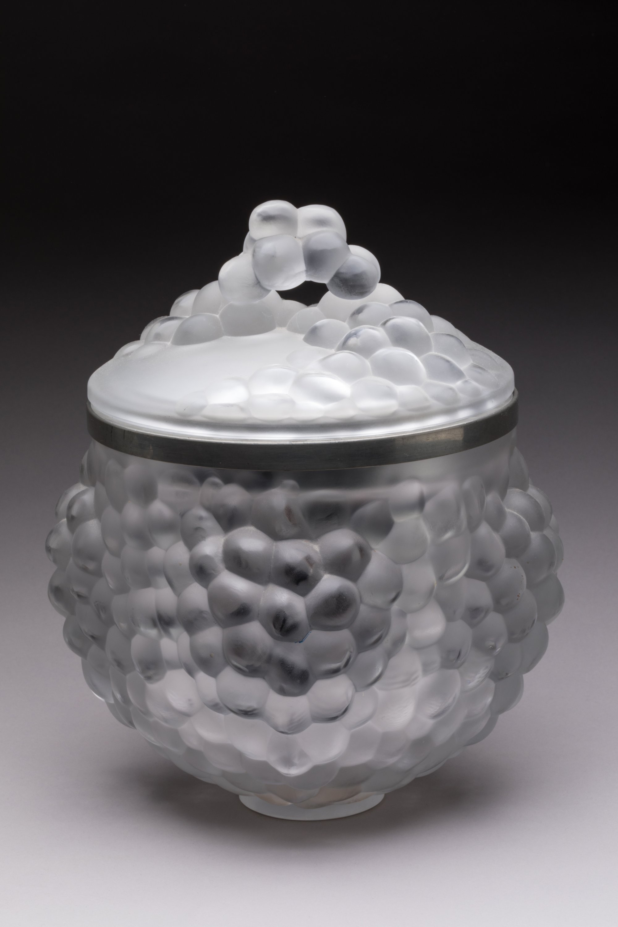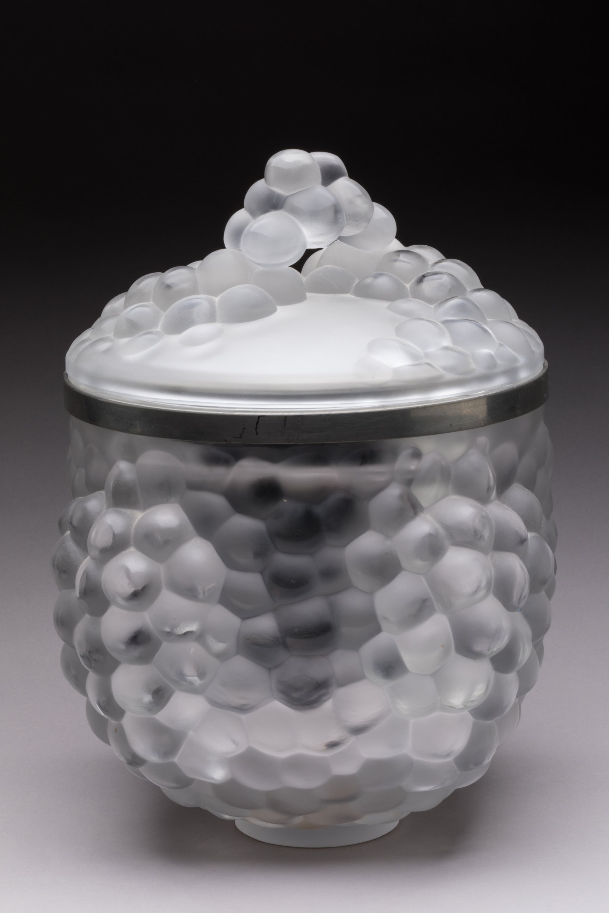 en cristal moulé satiné à décor de grappes de raisin. Cuve en métal argenté. Signature au stylet.