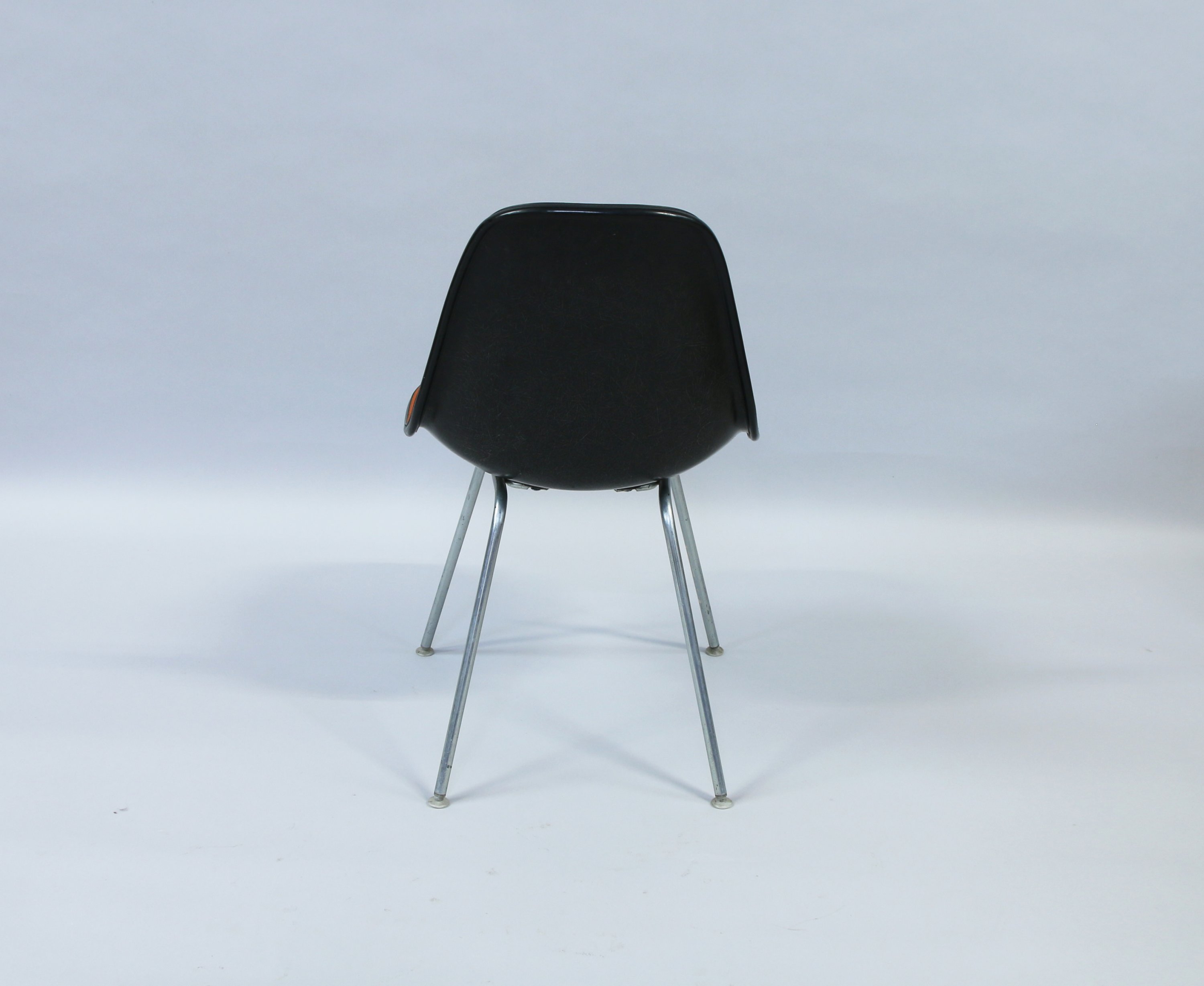 La coque en fibre de verre habillée de mousse et recouverte d'un tissu orangé. Le piétement tubulaire en métal.