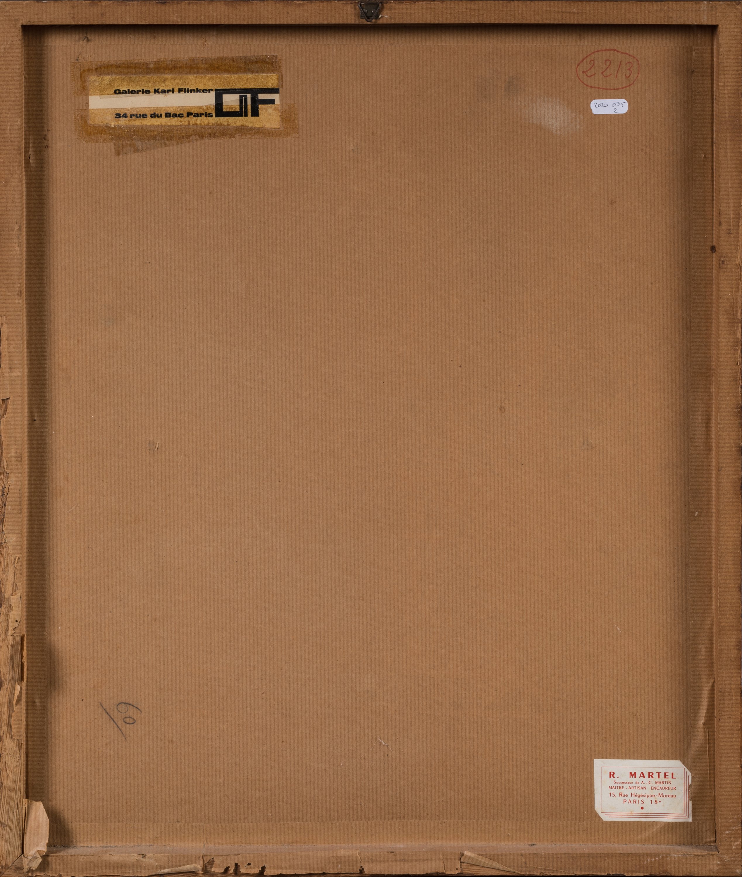 Étiquette scotchée au dos de l'encadrement de la galerie Karl Flinker à Paris.