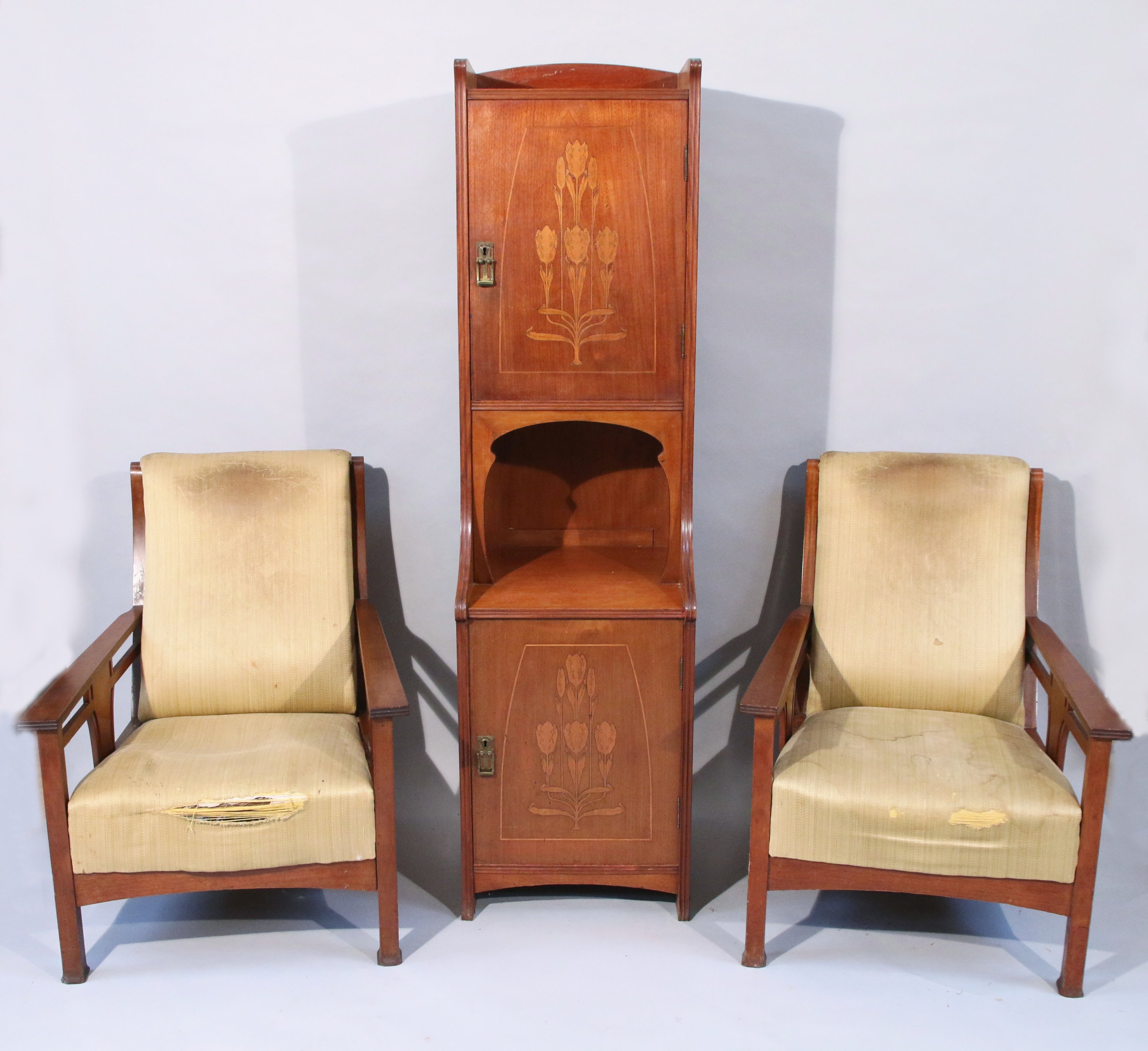 - MEUBLE D'ENTRE DEUX ouvrant par une porte en partie haute en retrait et une en partie basse séparée par une niche. Les portes à décor marqueté de tulipes stylisées dans un encadrement de filets.