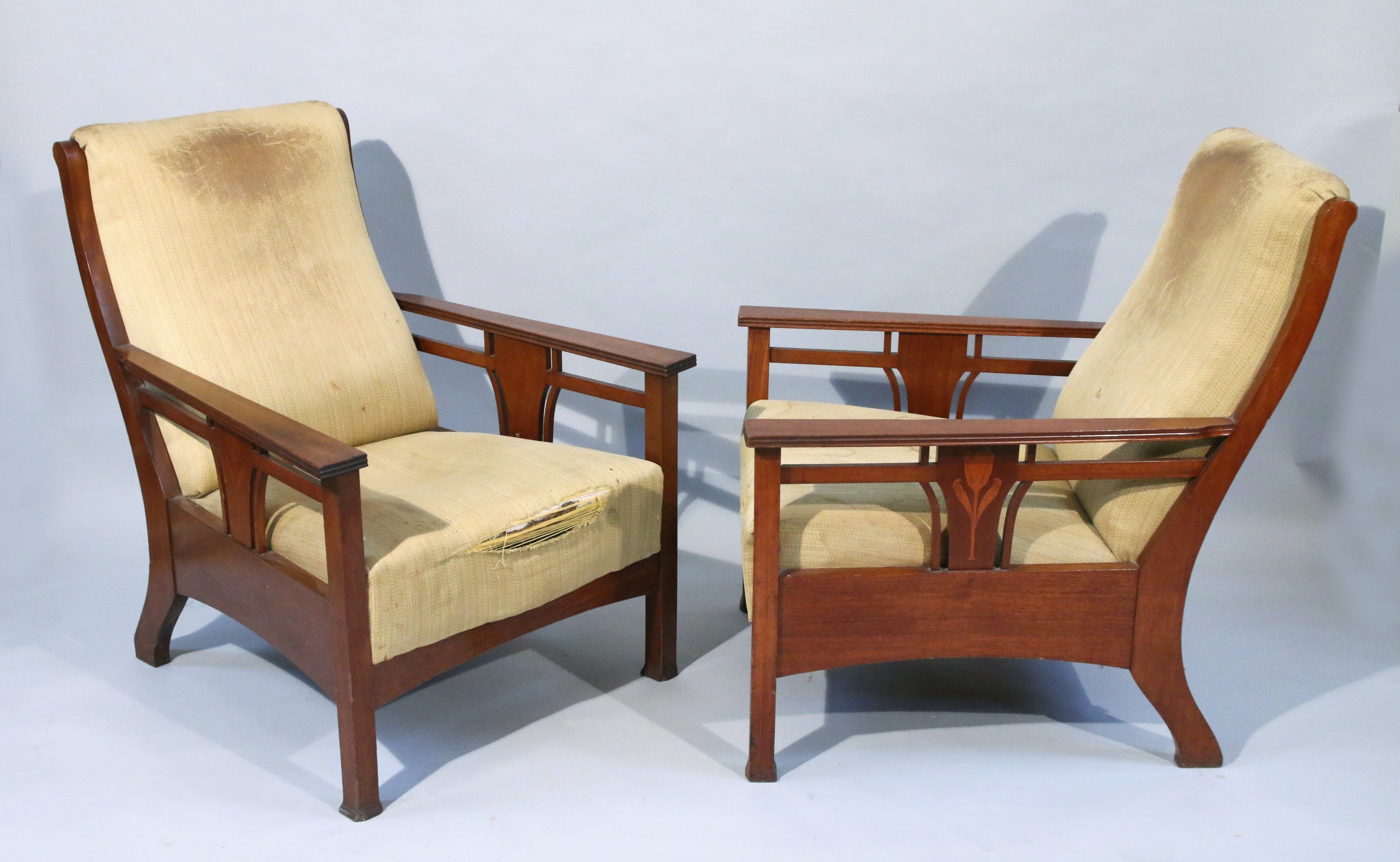 - PAIRE de FAUTEUILS à dossier légèrement renversé, les accotoirs moulurés et ajourés à décor marqueté d'une tulipe.