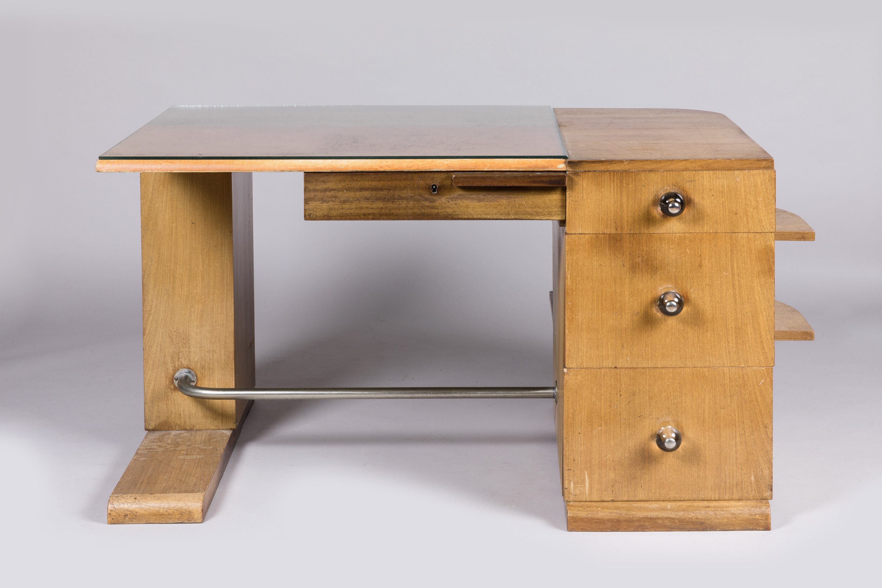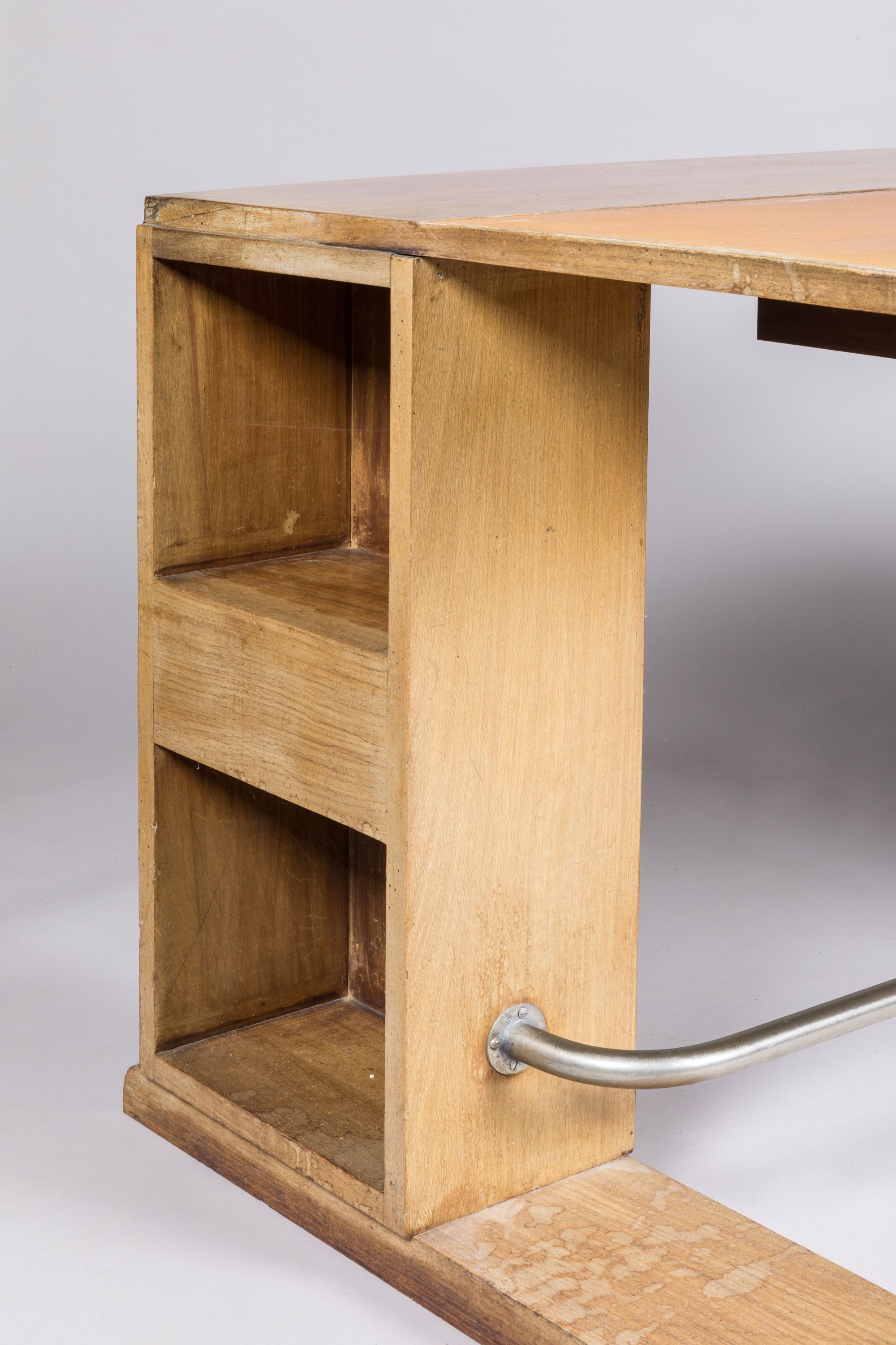 de forme rectangulaire en placage de bois clair. Du côté droit, il est muni d'un caisson présentant trois tiroirs à poignées de verre enrichis de deux étagères. Du côté gauche, un montant accueille deux niches. Il ouvre par un tiroir en ceinture. Le plateau en partie foncé d'une toile enduite. Repose-pieds constitué d'une barre tubulaire. Pieds patins.