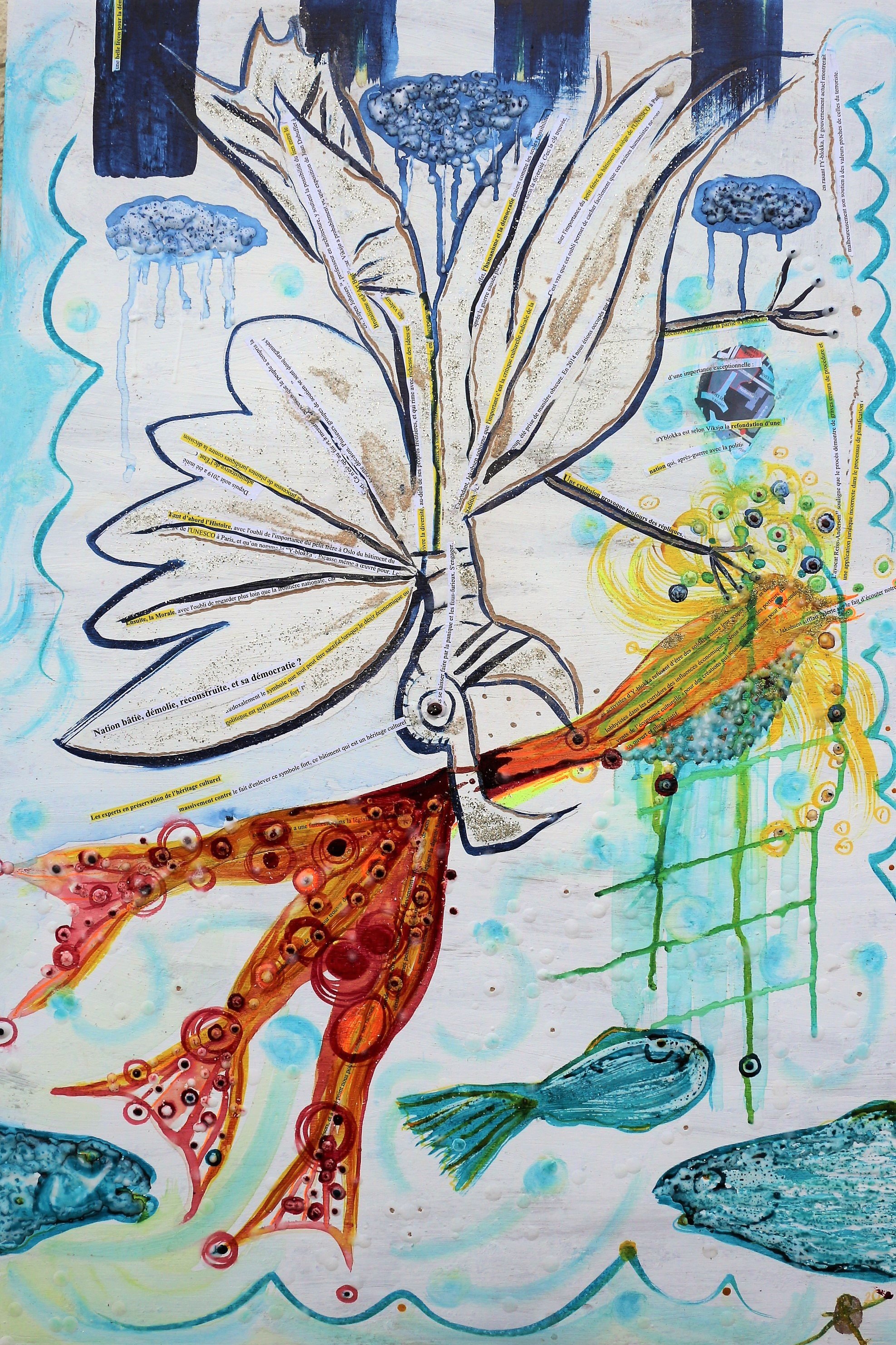 Techniques mixtes, collage, stearine, encre et gravures sur bois.