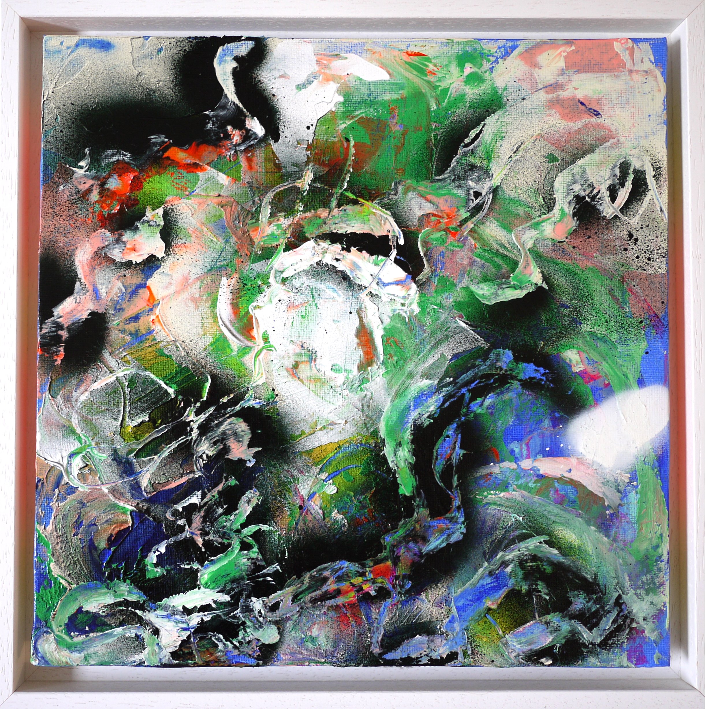 Peinture acrylique et acrylique en spray sur carton toilé encadré dans caisse américaine.