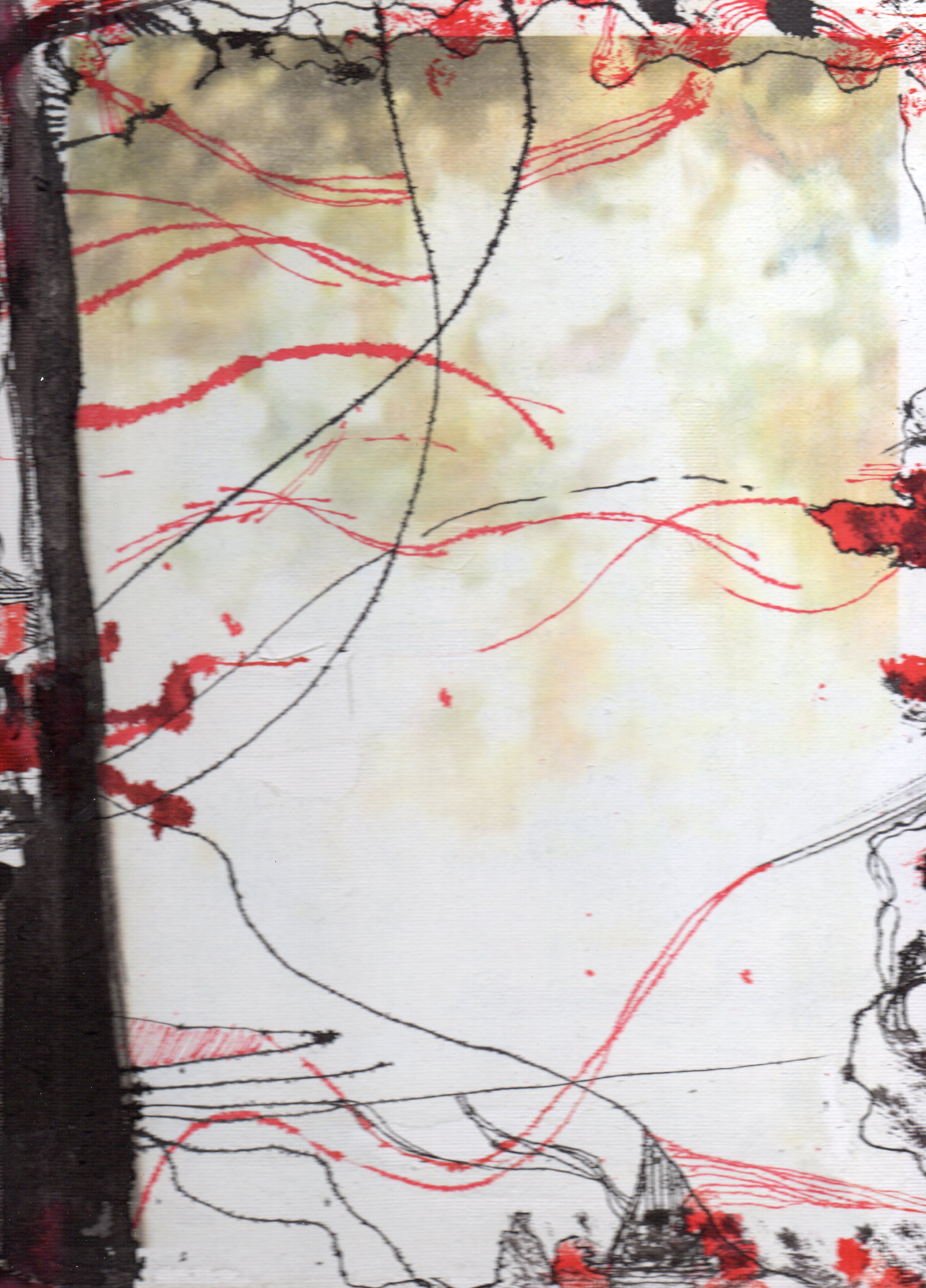 Transfert photogrpahique et dessin à l'encre sur châssis sur toile.