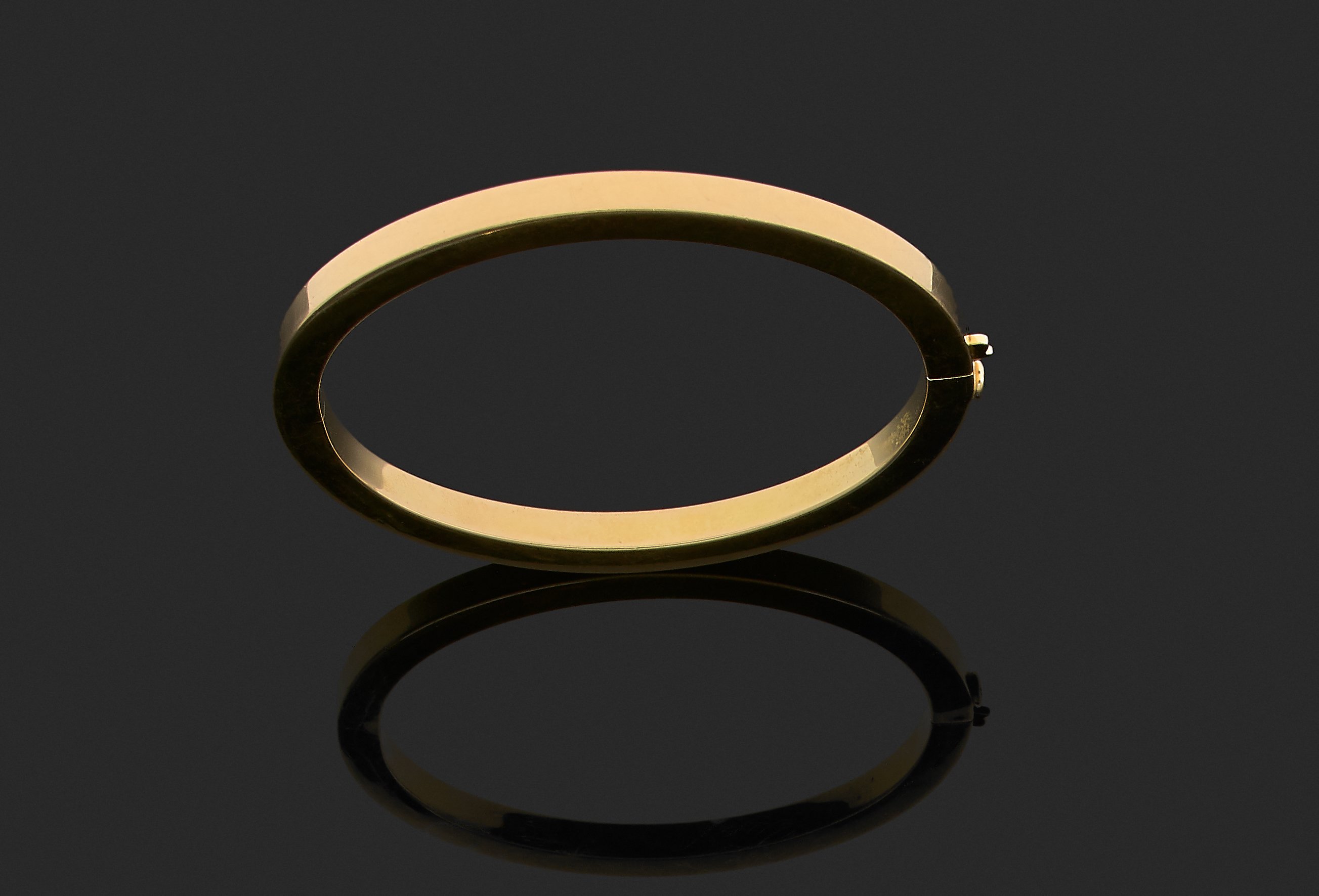 BRACELET rigide ouvrant, en or jaune 750 millièmes uni, le fermoir orné d'un diamant rond de taille brillant.