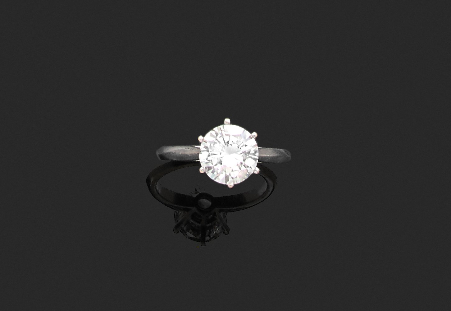Accompagnée de la copie d'une attestation de garantie de la CCIP n° 099900 du 17/05/1984, précisant masse : 1,69 ct ; couleur : H, pureté : SI1 ; fluorescence : aucune ; dimensions : 7,70 x 7,86 x 4,48 mm.
