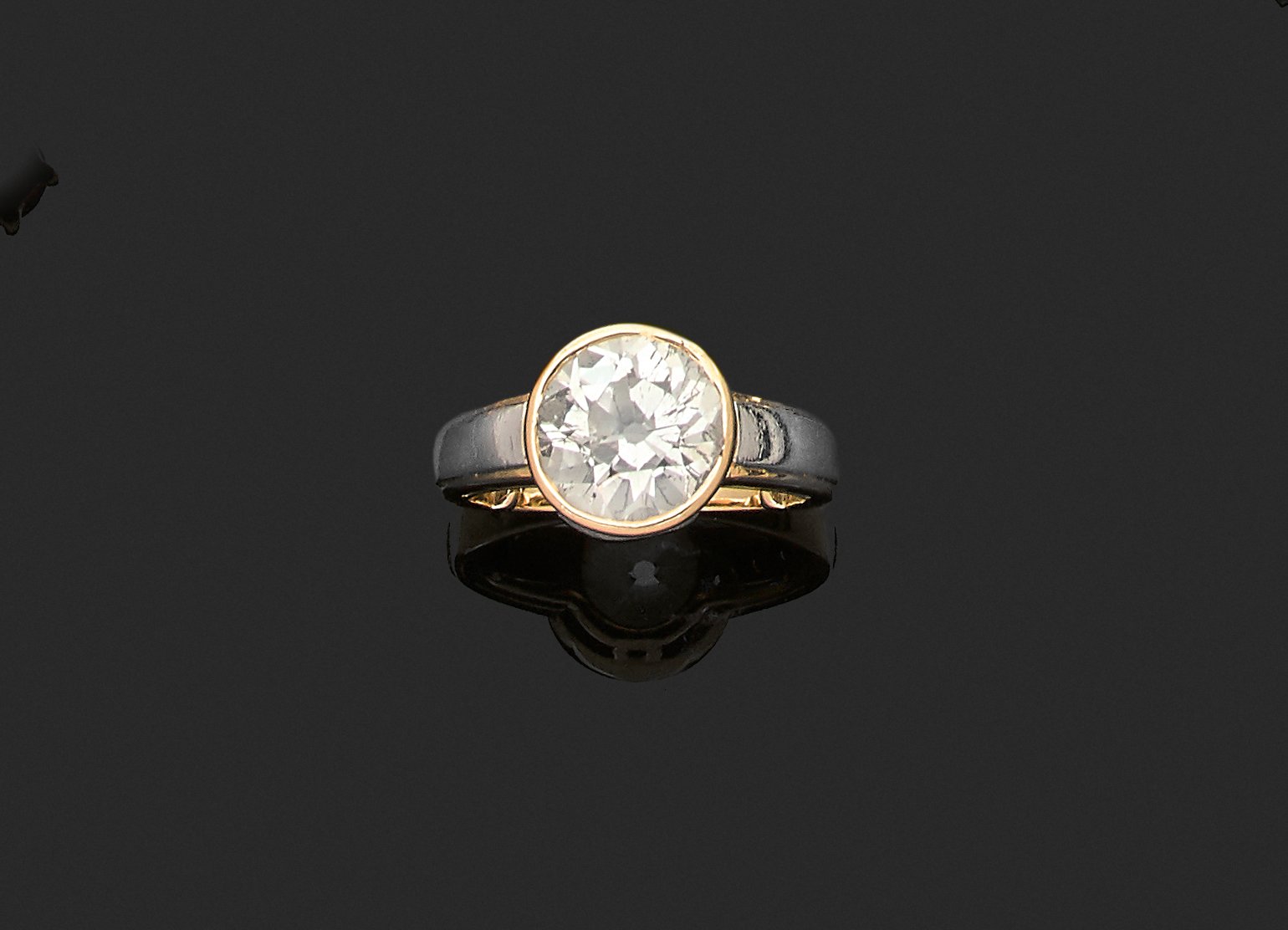 BAGUE en or jaune 750 millièmes et platine 850 millièmes, ornée d'un diamant rond de taille ancienne serti clos.