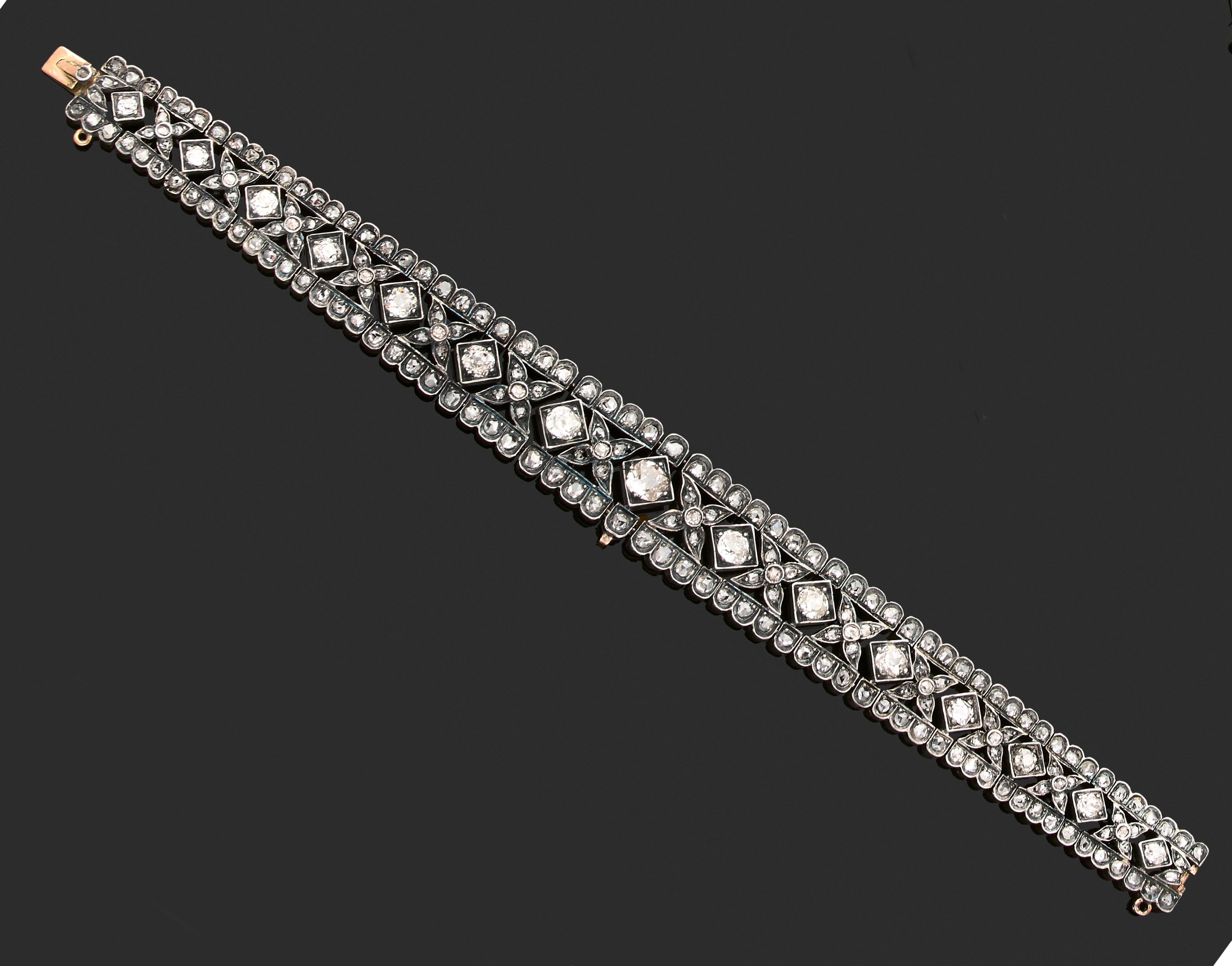 BRACELET articulé en or 750 millièmes et argent 925 millièmes, décoré de motifs fleurettes en chute ornées de diamants taillés en rose et de taille ancienne, certains plus importants, entre deux lignes de diamants également taillés en rose.