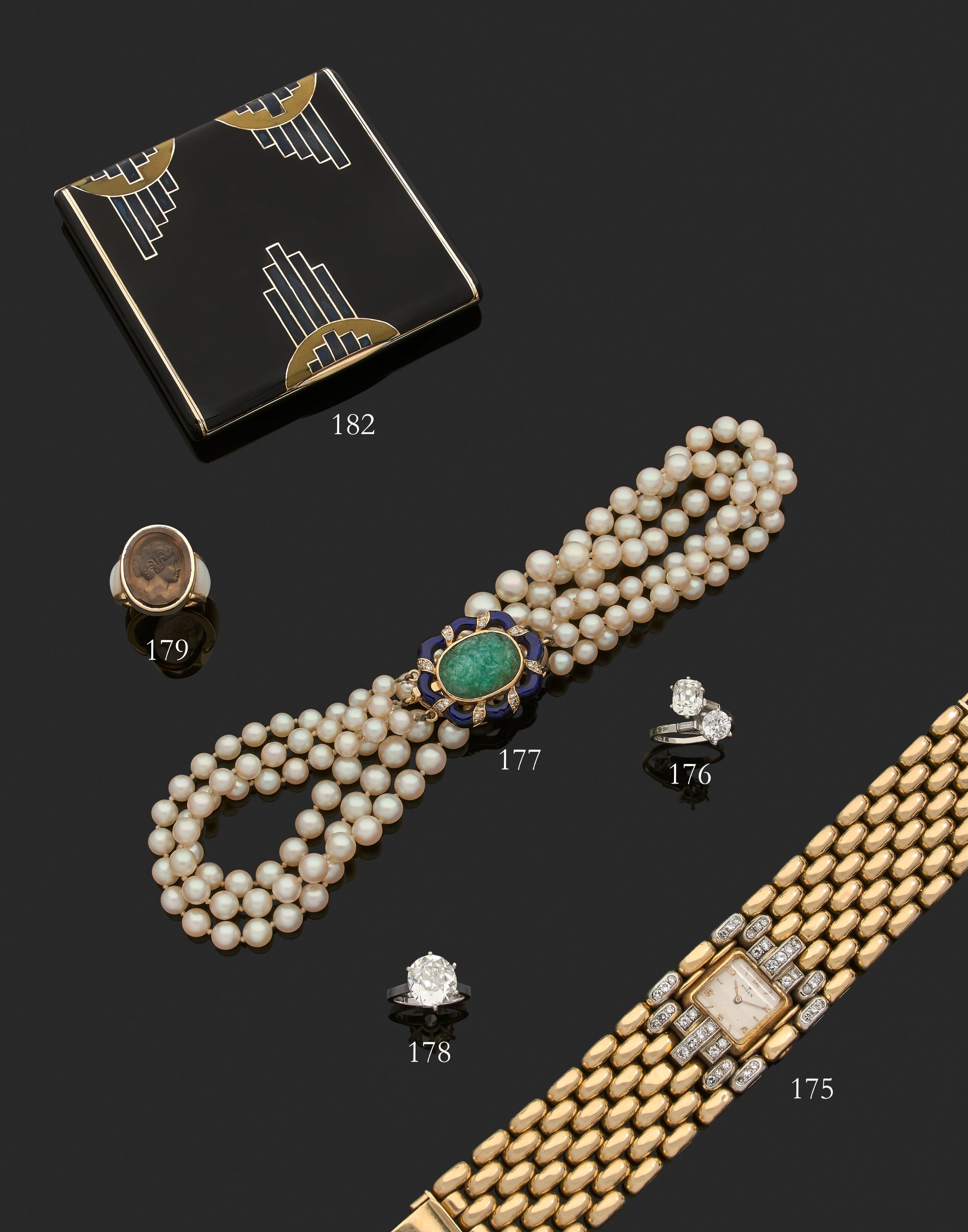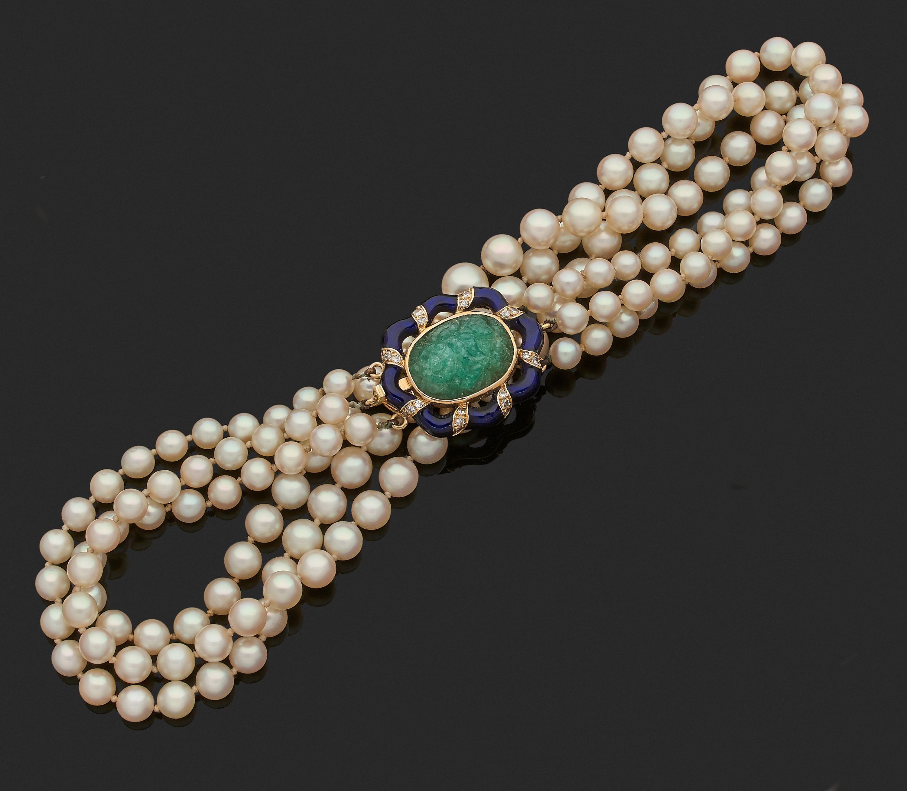 COLLIER de cinquante et une, quarante-sept et quarante-cinq PERLES de culture blanches en chute, le fermoir en or jaune 750 millièmes polylobé, émaillé bleu translucide orné de lignes torsadées de petits diamants, le centre serti d'une émeraude cabochon gravée à décor de fleurs.