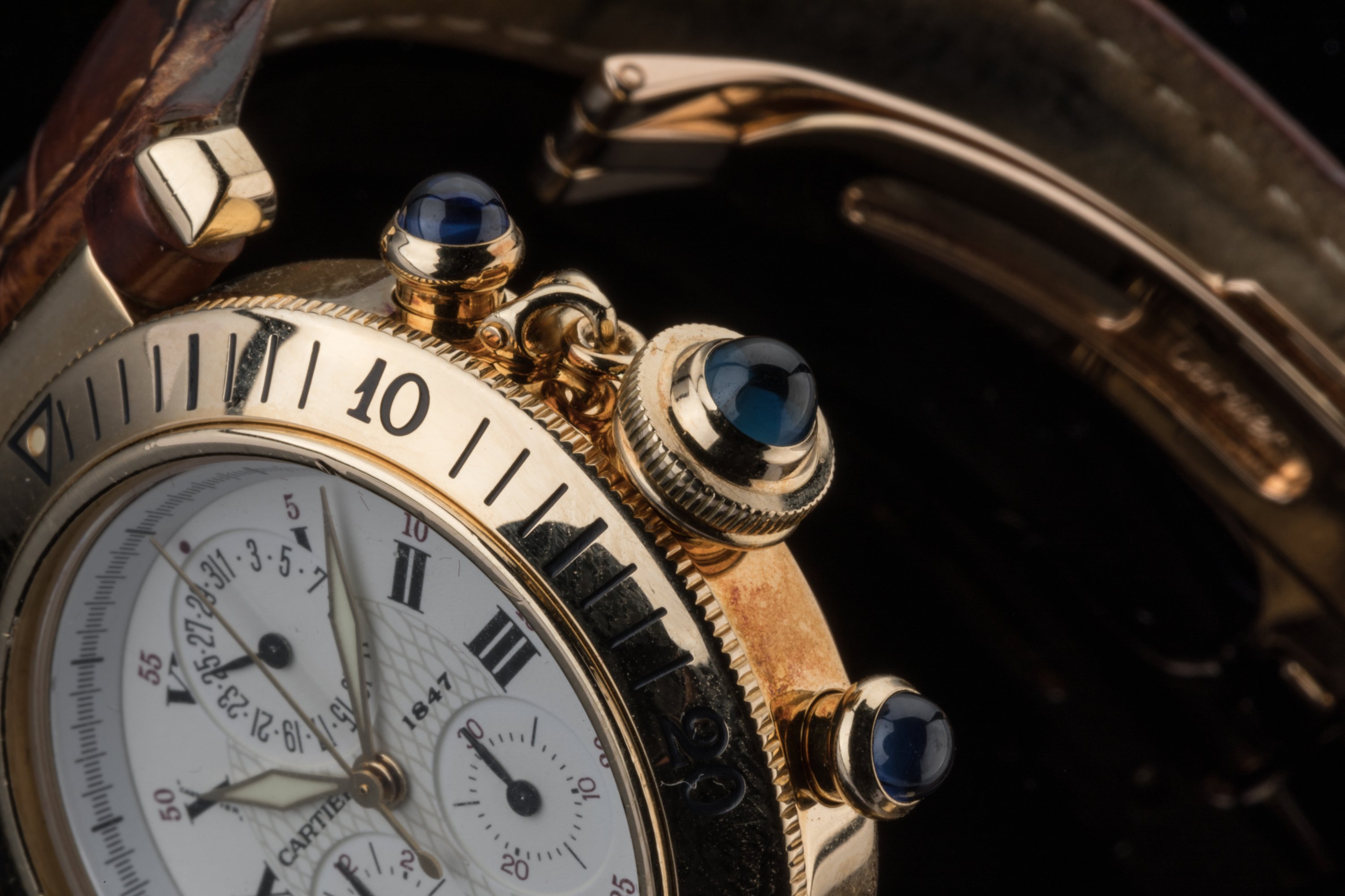 en or jaune 750 millièmes, à lunette tournante unidirectionnelle, cadran blanc à trois compteurs figurant les heures en chiffres romains et les minutes en chiffres arabes. Le cadran à 12h donnant la date, les aiguilles de forme glaive. Marquée au centre Cartier 1847 et " L cur C Swiss " dans un losange à 6h, en référence à Louis Cartier fondateur de l'entreprise.
