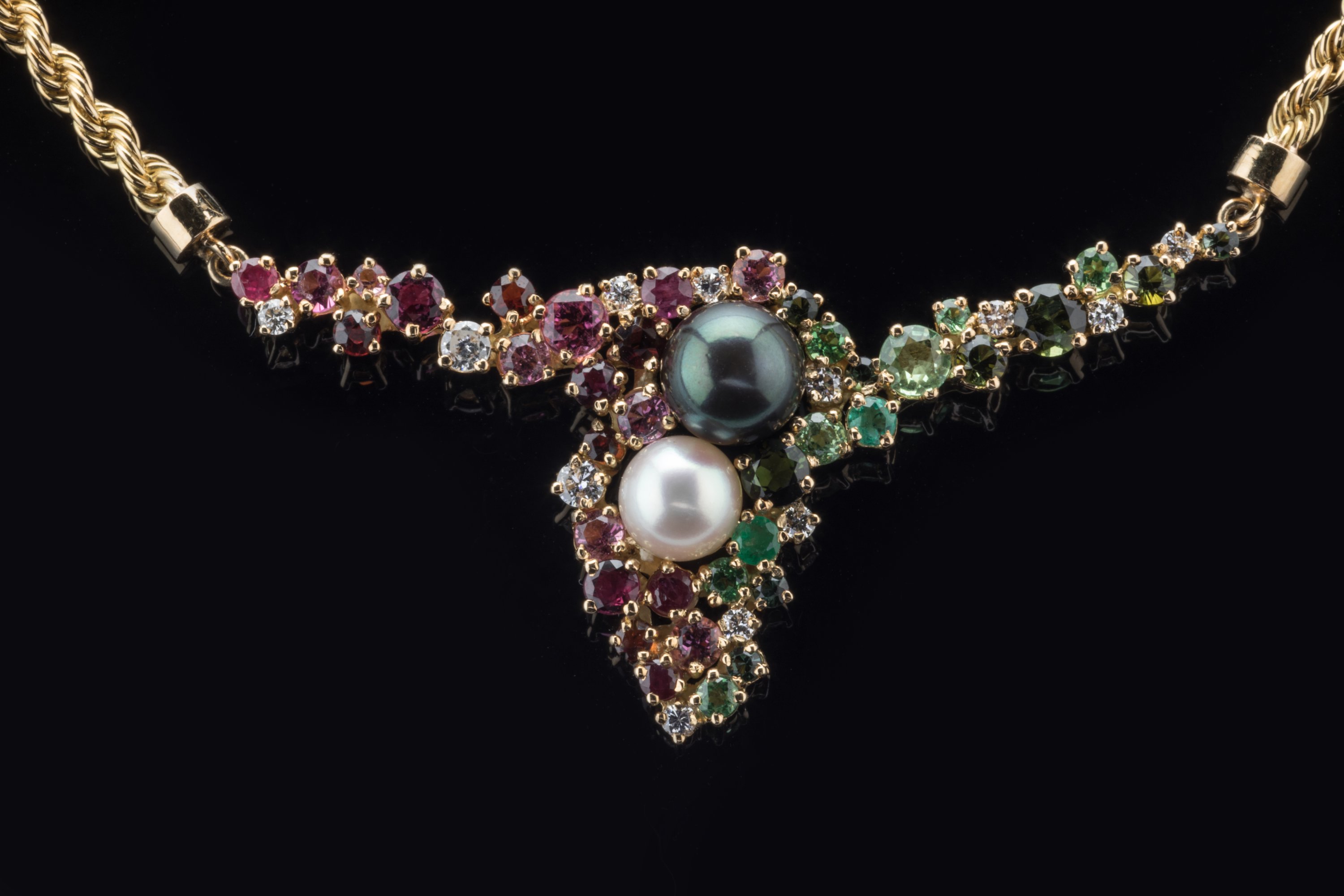 COLLIER en or jaune 750 millièmes, chaine corde, perle de culture Tahiti et perle de culture Akoya, orné de quarante-neuf diamants, pierres précieuses et pierres fines dont : onze diamants, sept rubis, sept tourmalines roses, six grenats rouges, quatre grenats verts Tsavorites, neuf tourmalines vertes, six émeraudes.