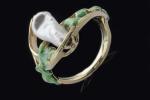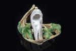 BAGUE en or jaune 750 millièmes, ornée de feuilles stylisées en émail vert grand feu et d'une perle baroque. Elle prend la forme d'un fruit sortant une branche feuillagée.