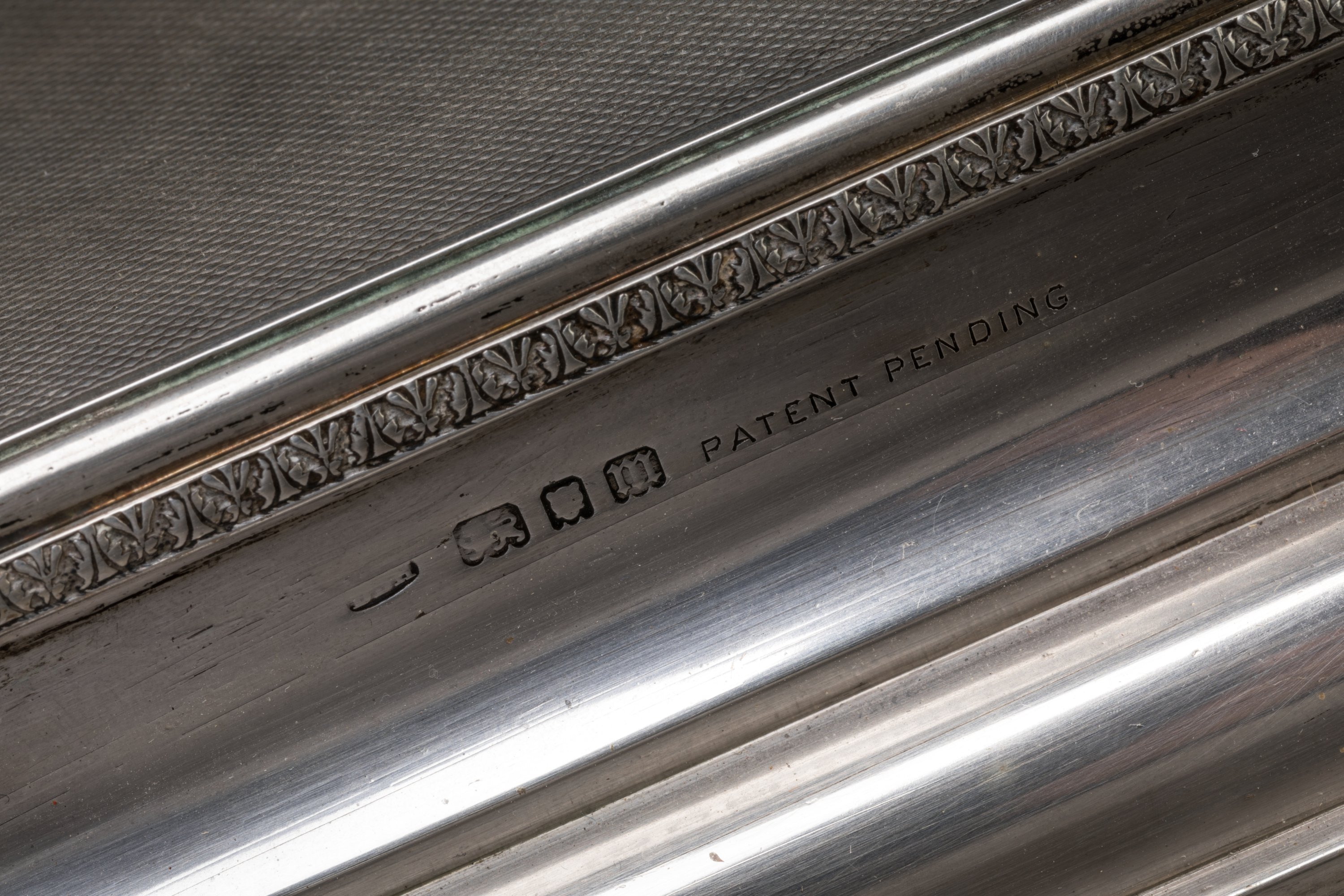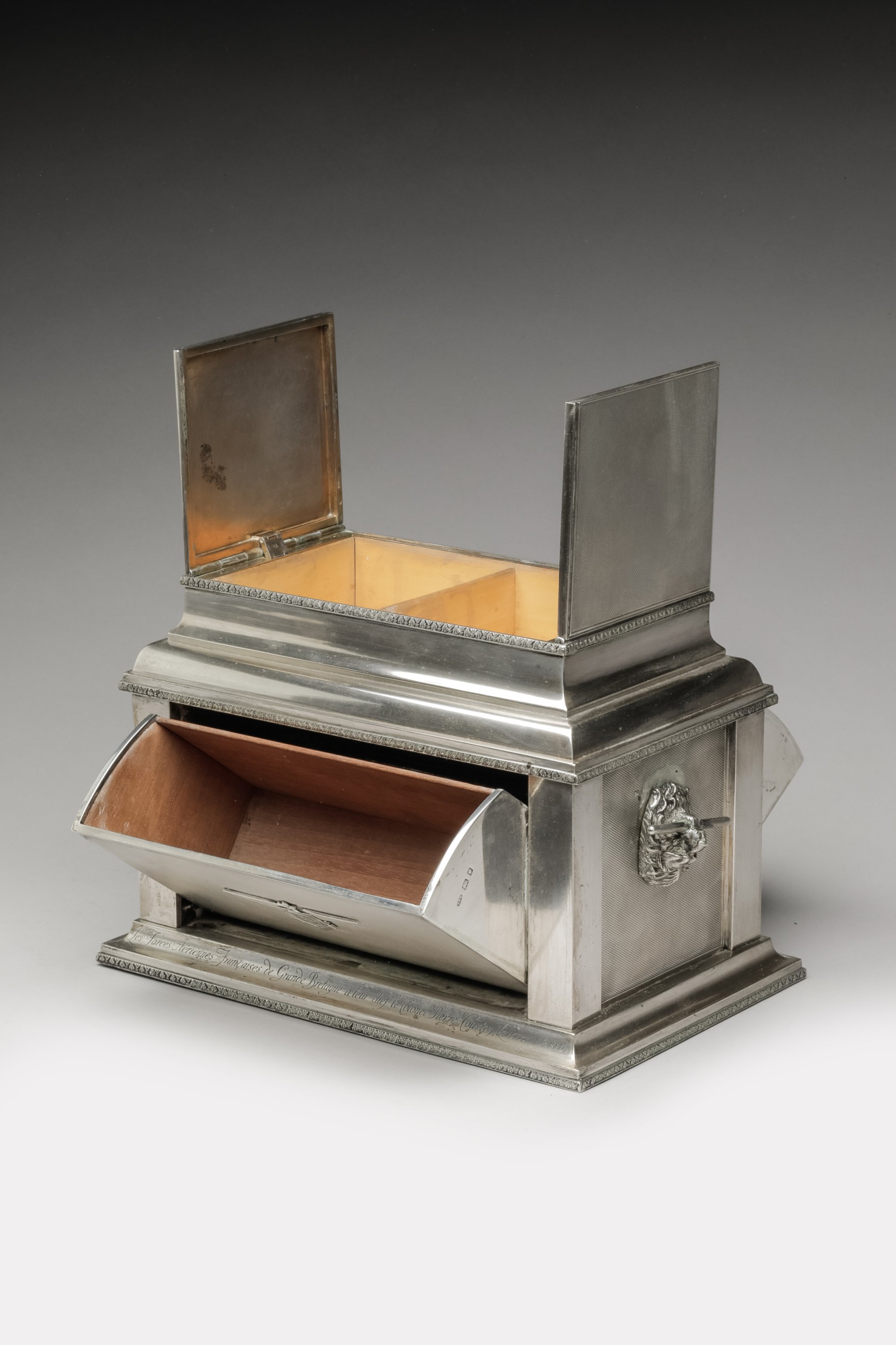 en argent guilloché à fond en amati, frises florales. De forme parallélépipédique à double doucines, il ouvre par un mécanisme pivotant actionné sur les côtés par deux têtes de lion retenant dans leurs gueules une barre. Il dévoile quatre réceptacles gainés de bois, sur le couvercle et les longueurs.