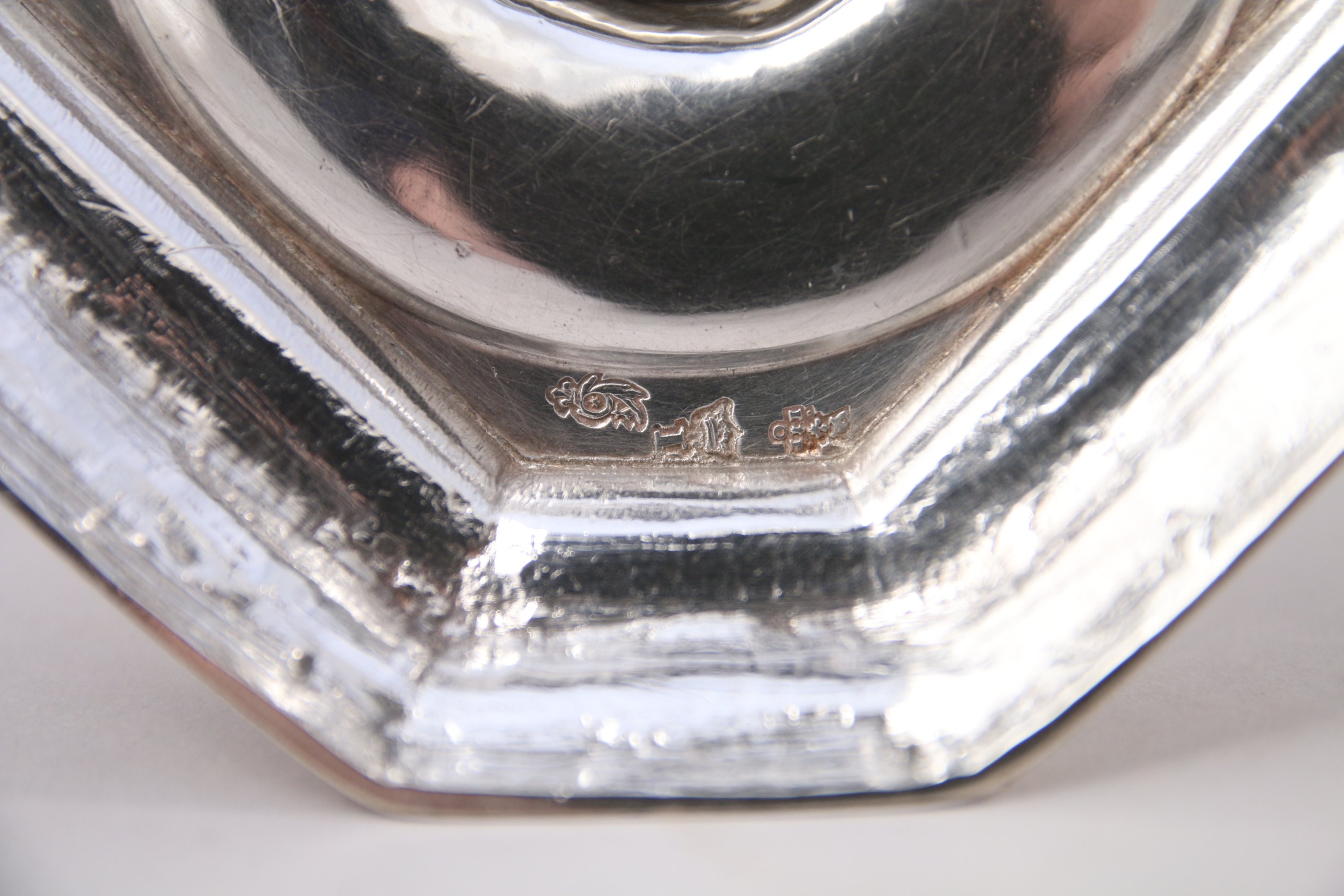 en argent. Fût balustre à pans coupés, base à doucine à huit pans.