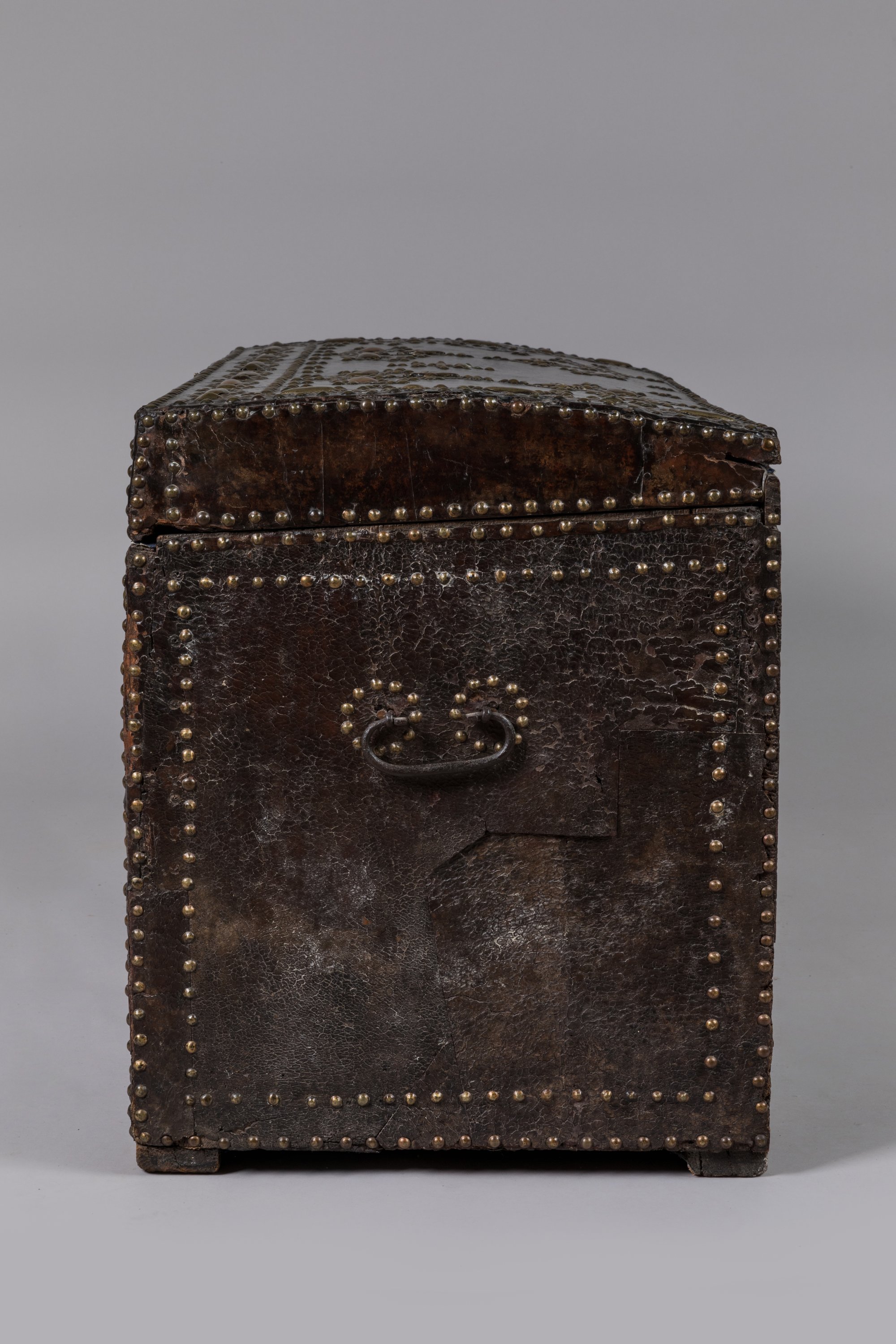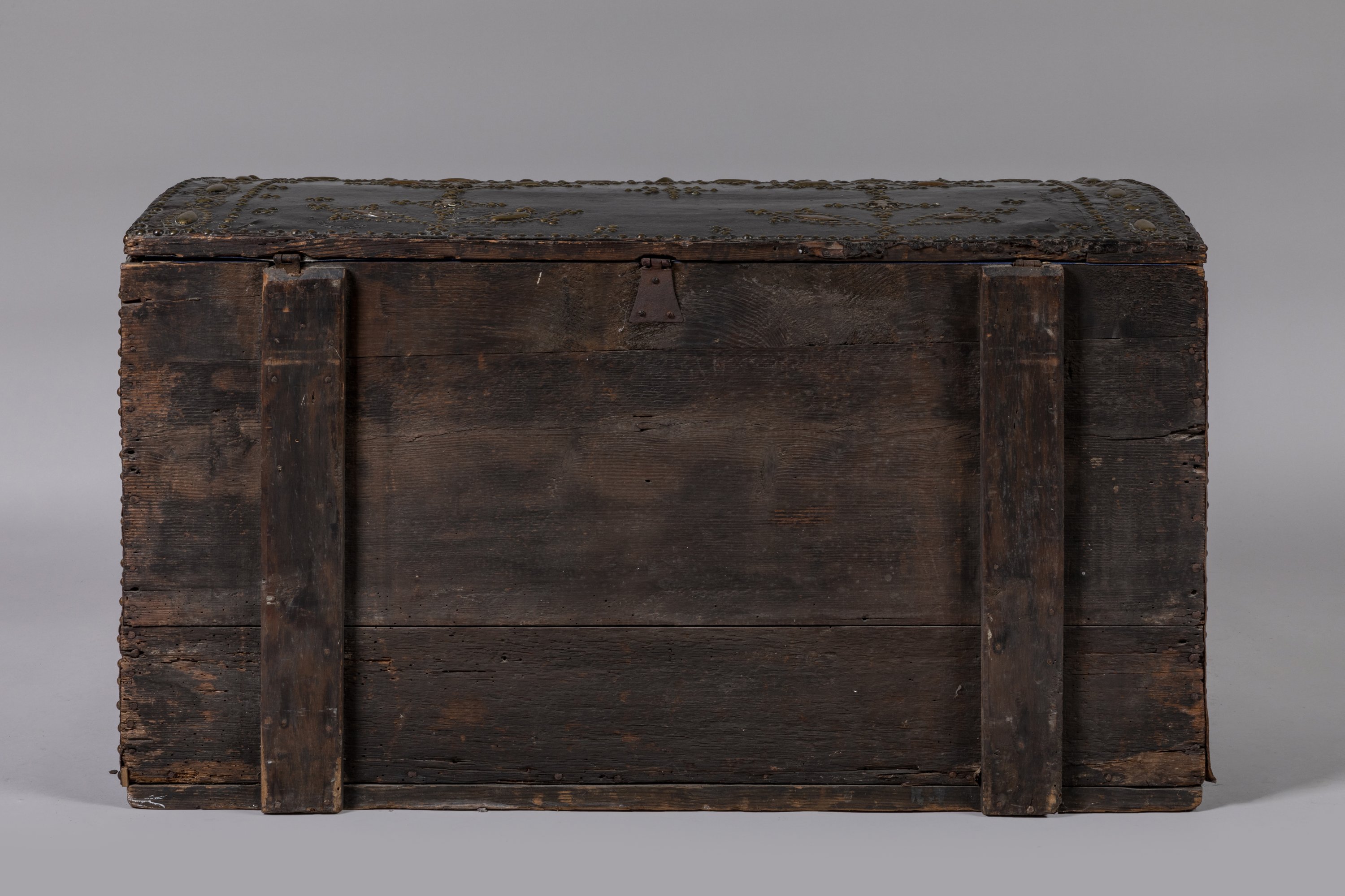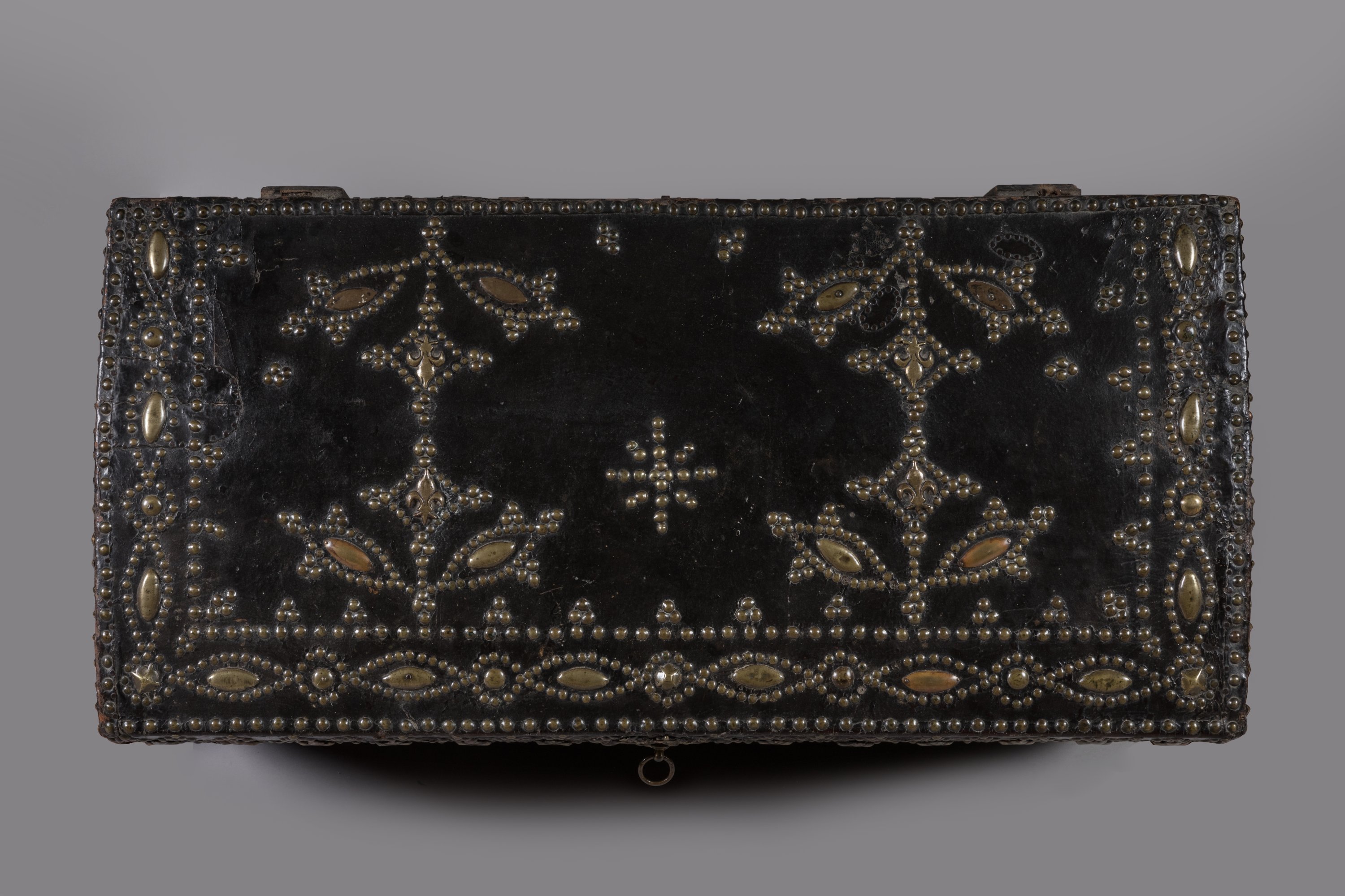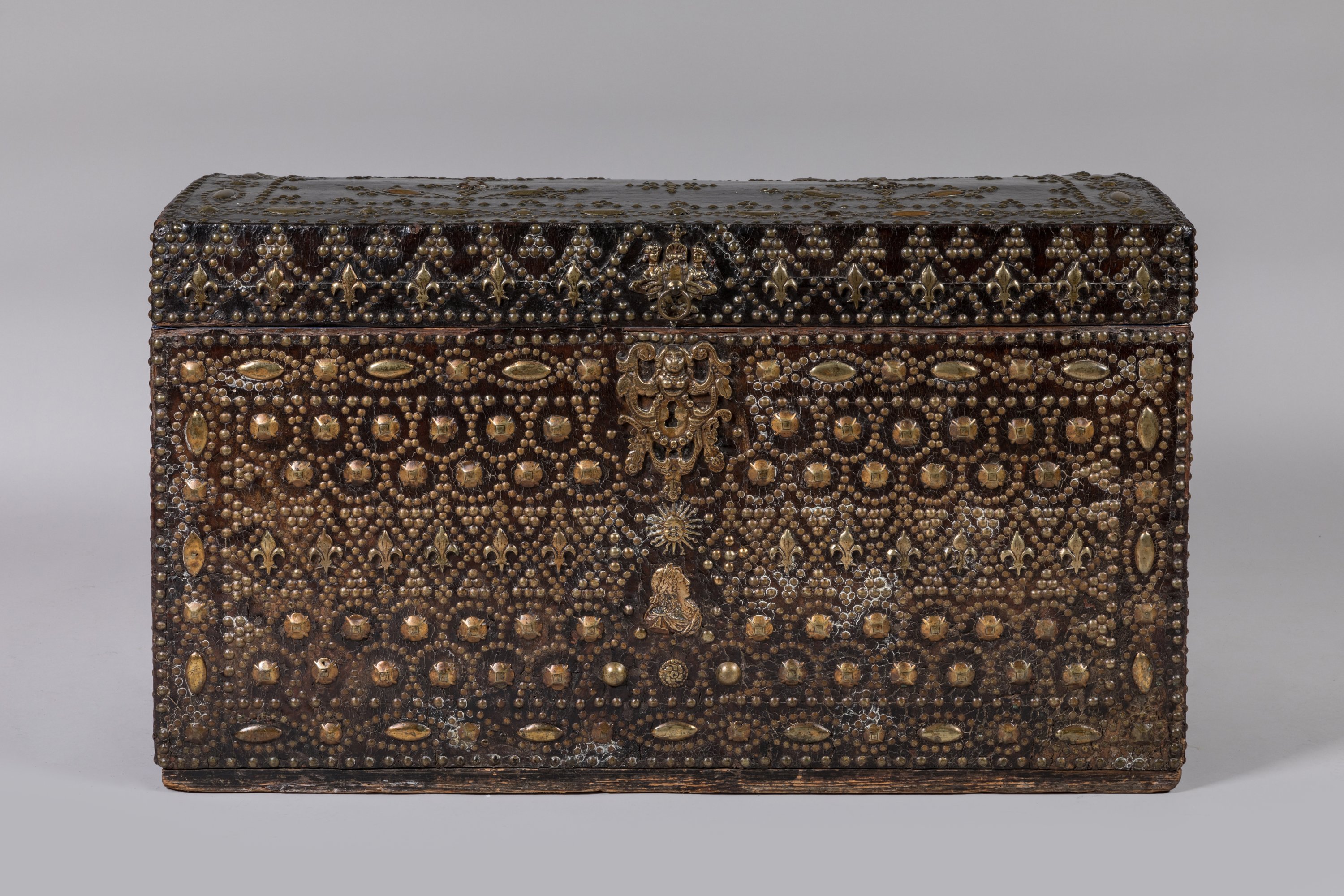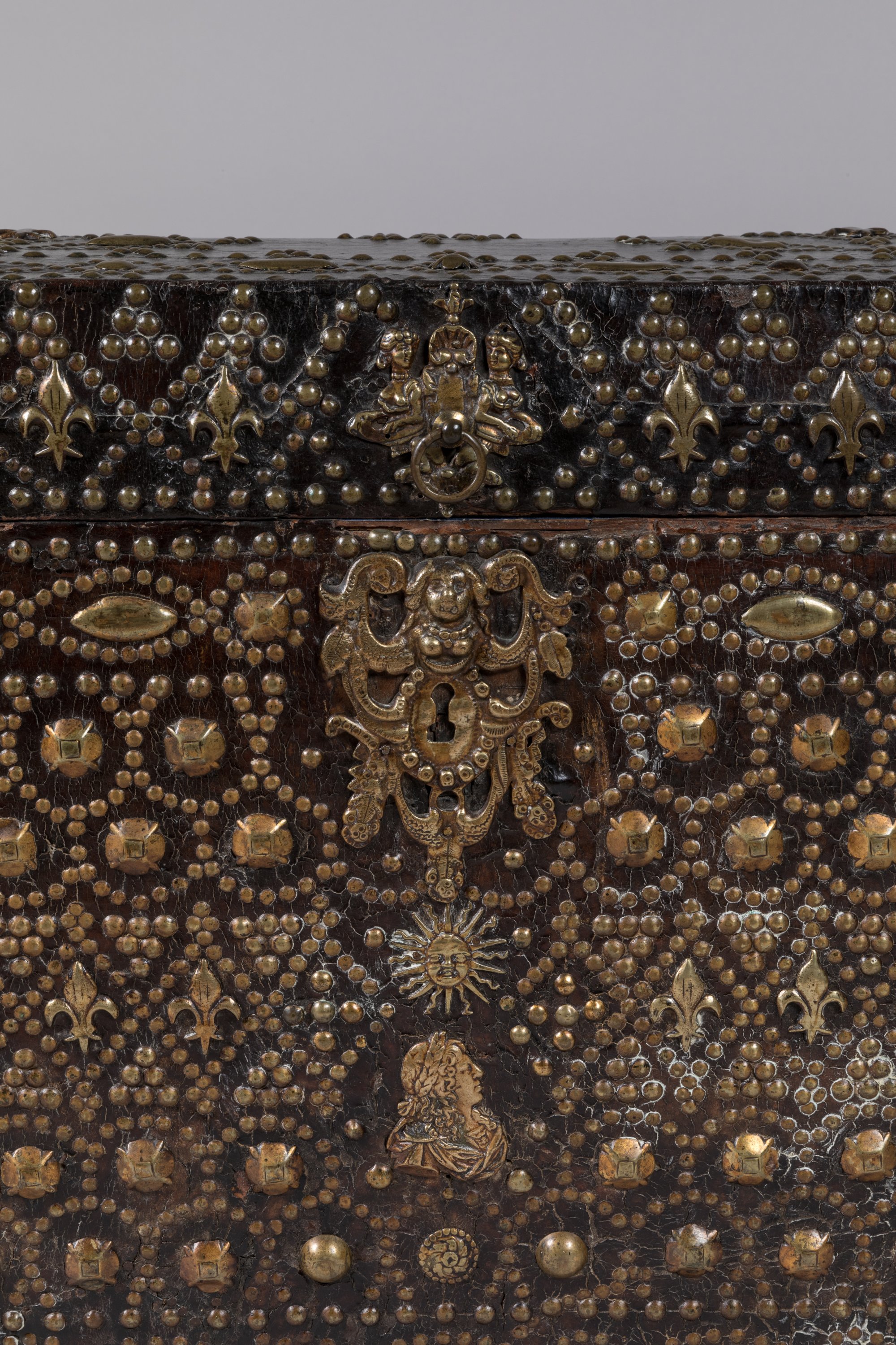 Sur une âme en bois gainé d'un cuir, prend place un décor cloué en laiton et bronze de rangs de fleurs de lys, cabochons et de motifs géométriques. Prise annulaire aux bustes de femmes accolés et entrée de serrure figurant un grotesque, surmontant l'astre solaire et le profil de Louis XIV. Poignées latérales en fer forgé.