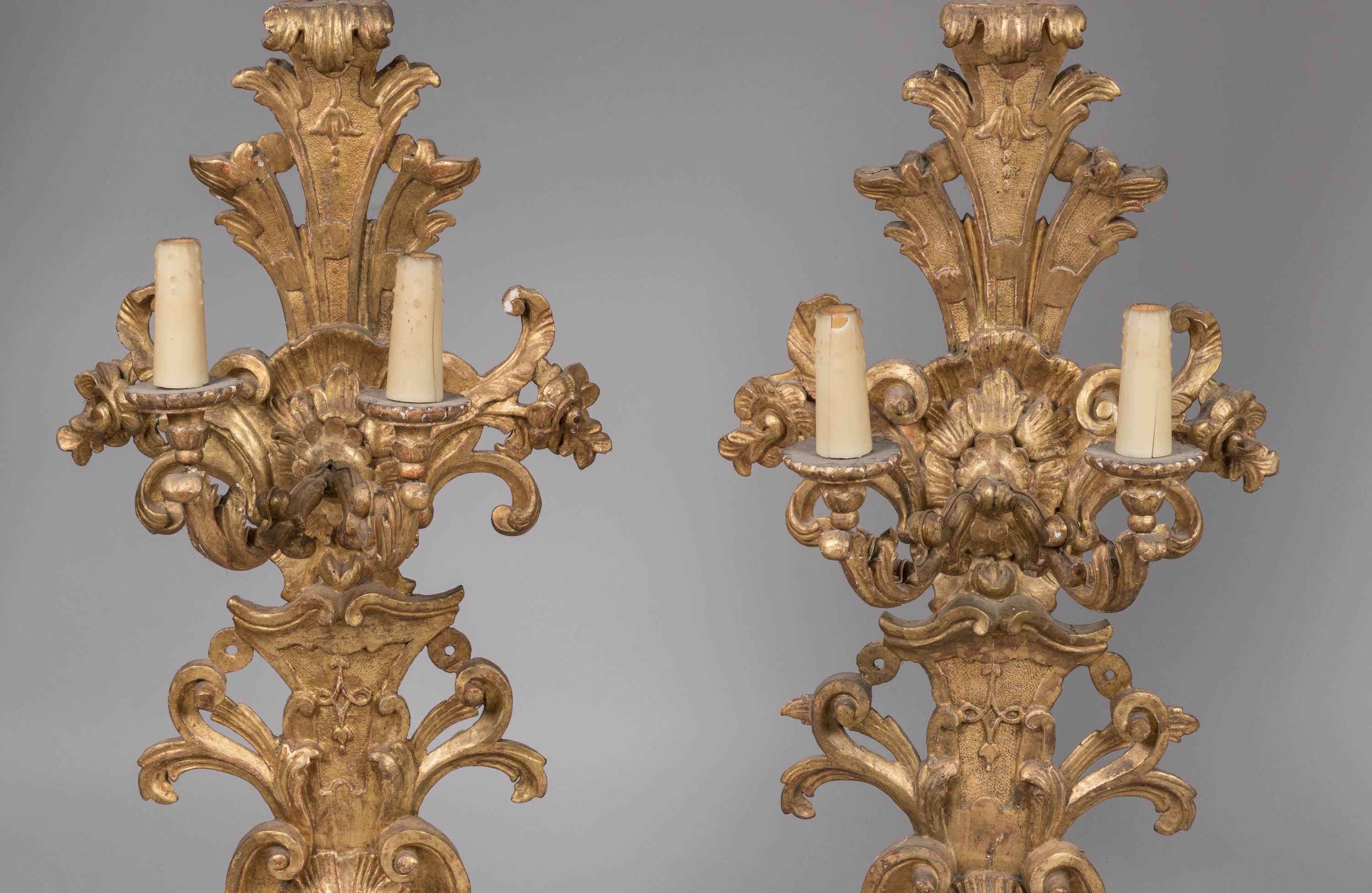 Pair of large carved wooden sconces. Italian work from the mid-18th century.
