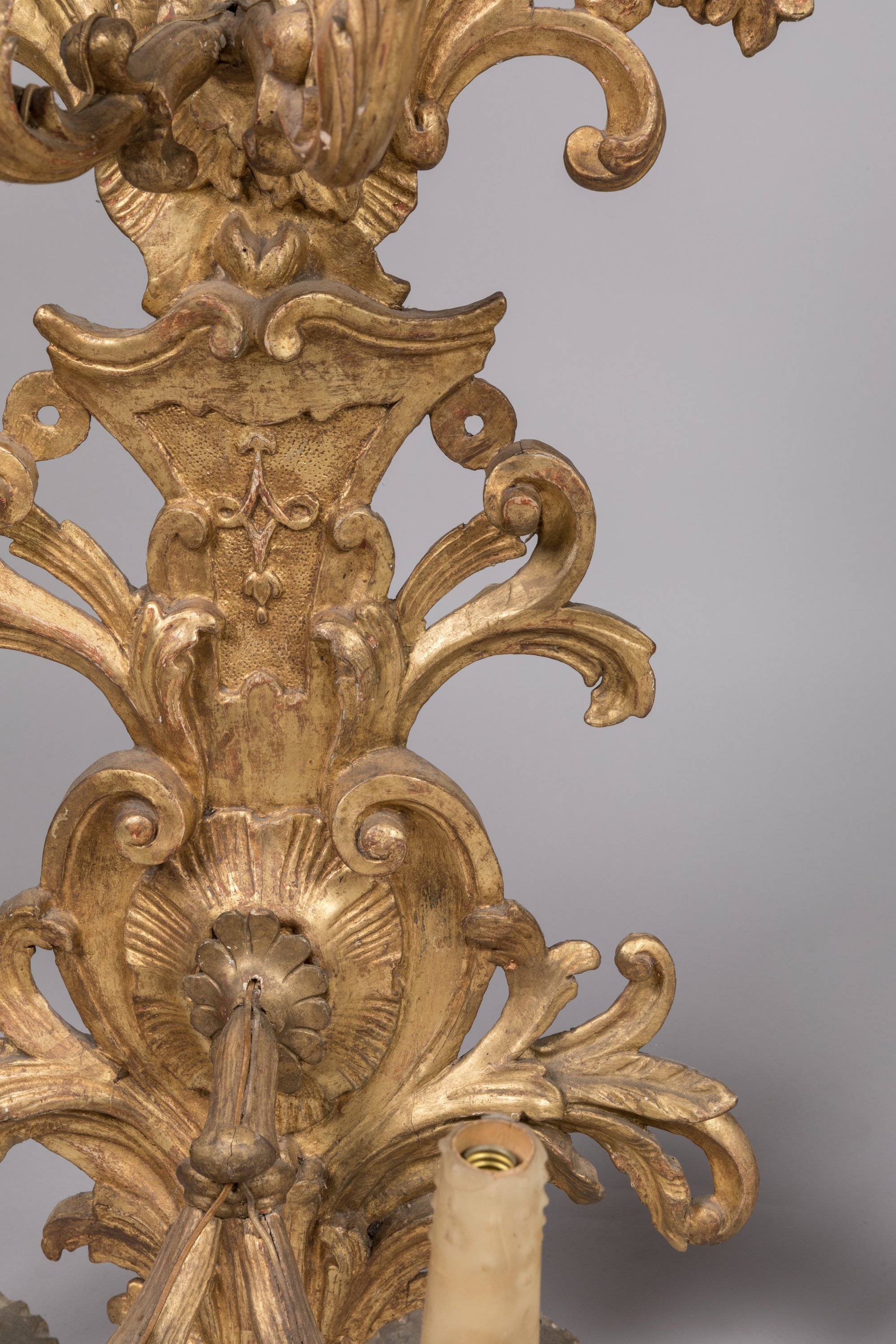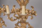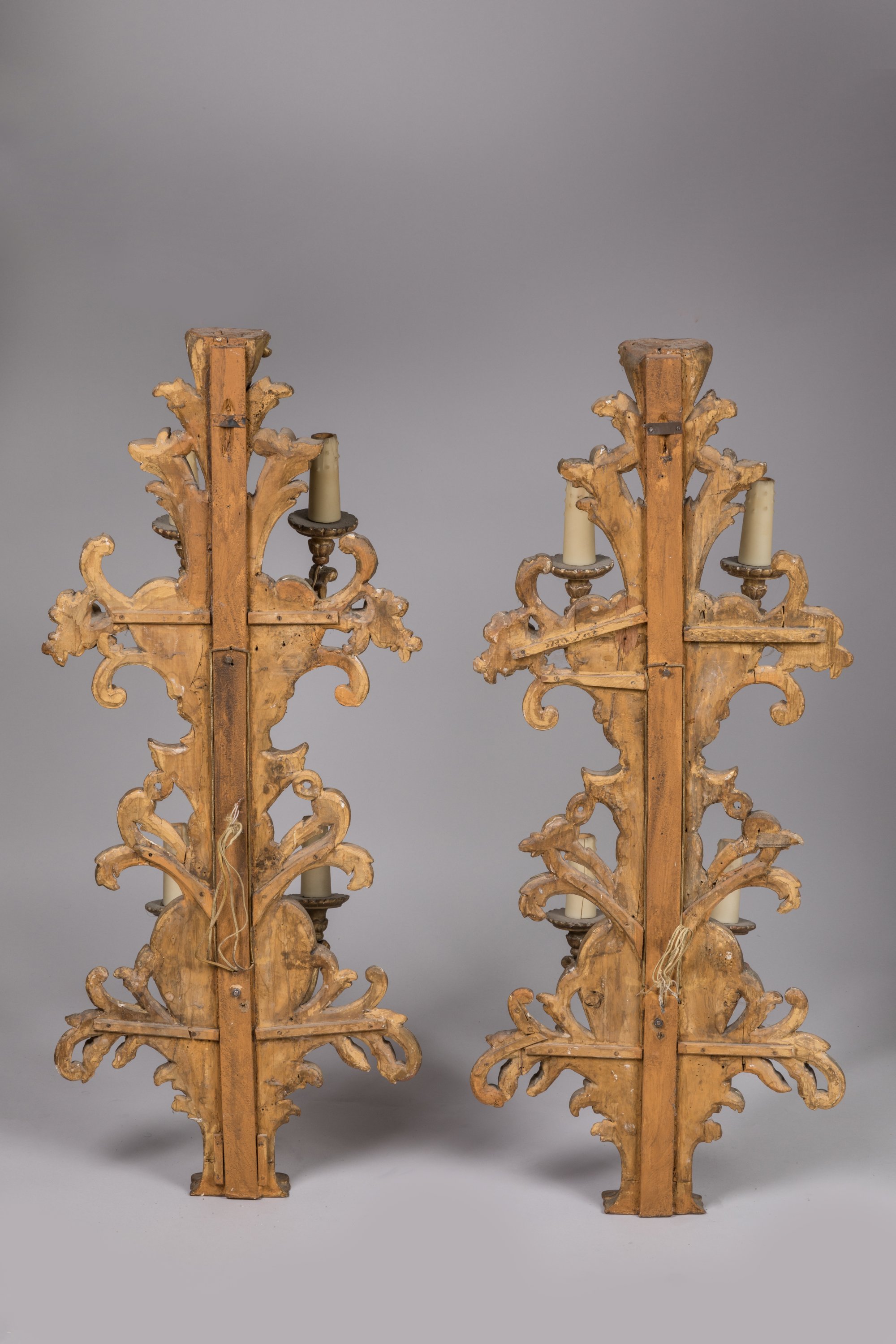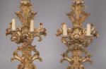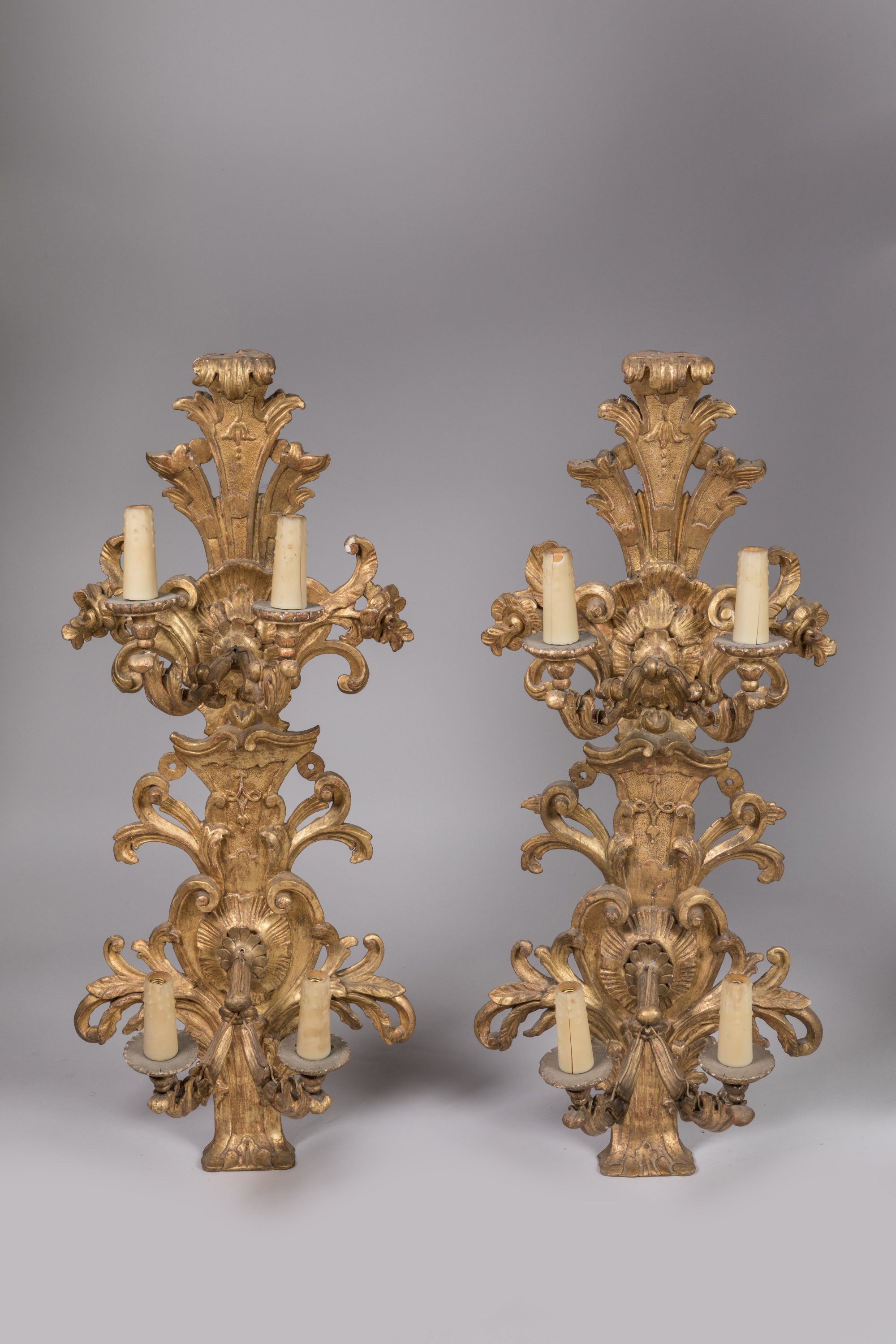 PAIRE de grandes APPLIQUES en bois sculpté et doré, à quatre bras de lumière sur deux registres en forme de culots dacanthe. Décor ajouré baroque de feuilles au naturel, denroulements dacanthe, de palmettes, de fleurons dacanthe, de coquilles et de motifs géométriques.