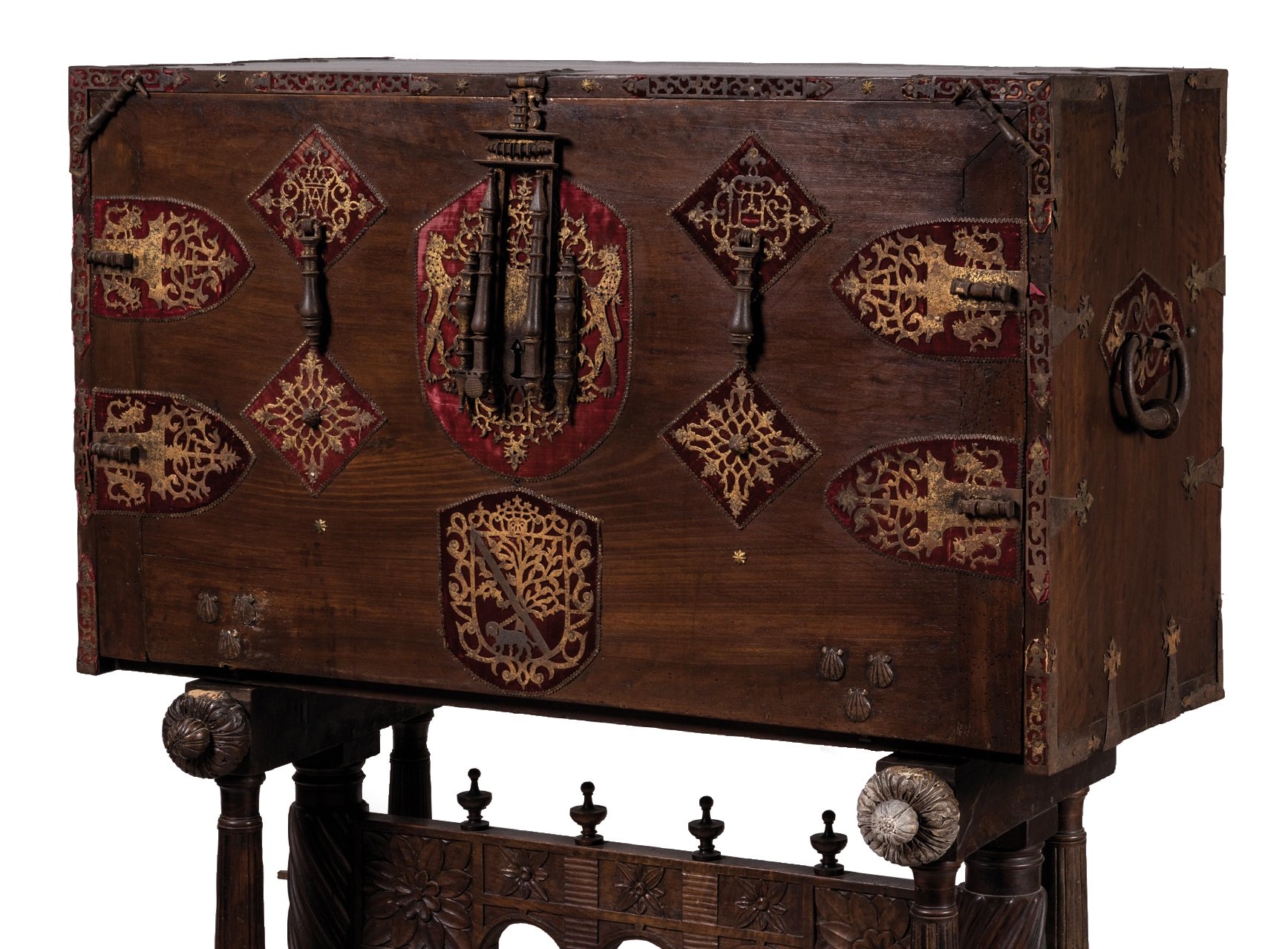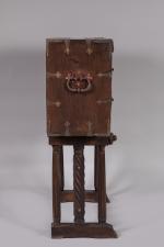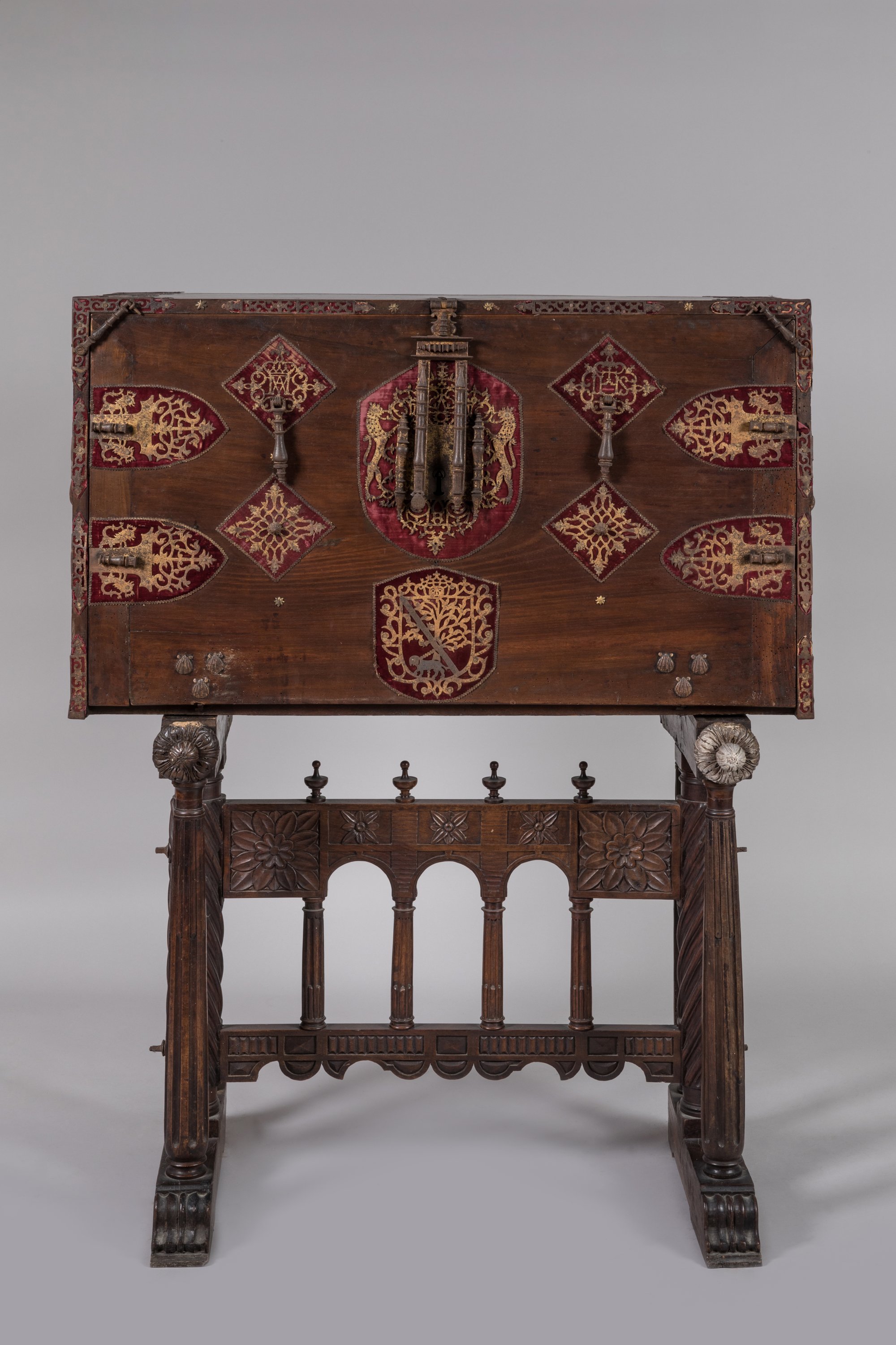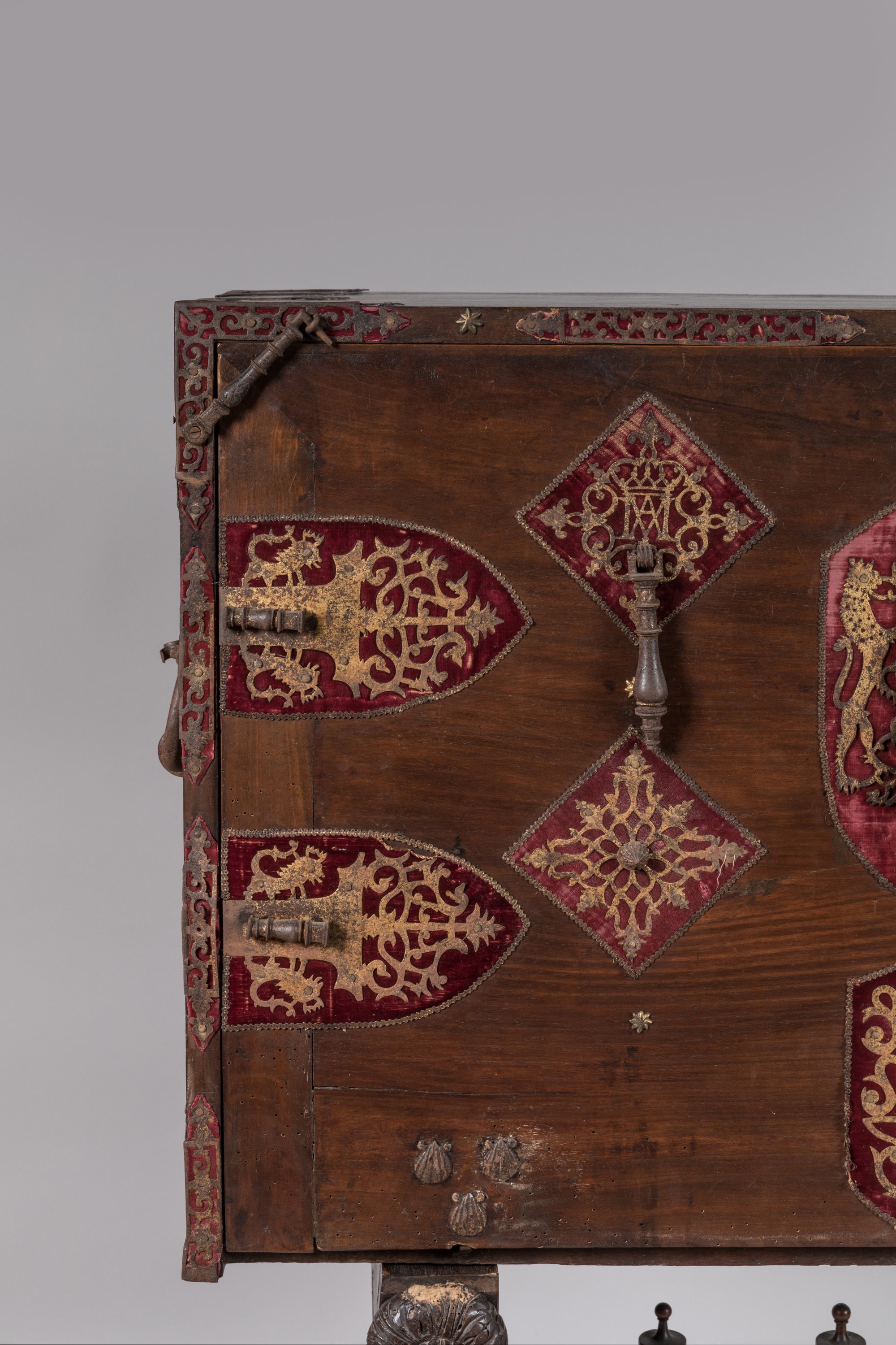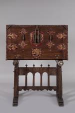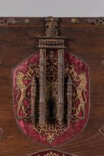 de forme rectangulaire en noyer. L'abattant est orné d'une serrure à moraillon à deux pênes et quatre verrous. Deux pendeloques et six coquilles Saint-Jacques. Des motifs en métal découpé sur fond de velours rouge.