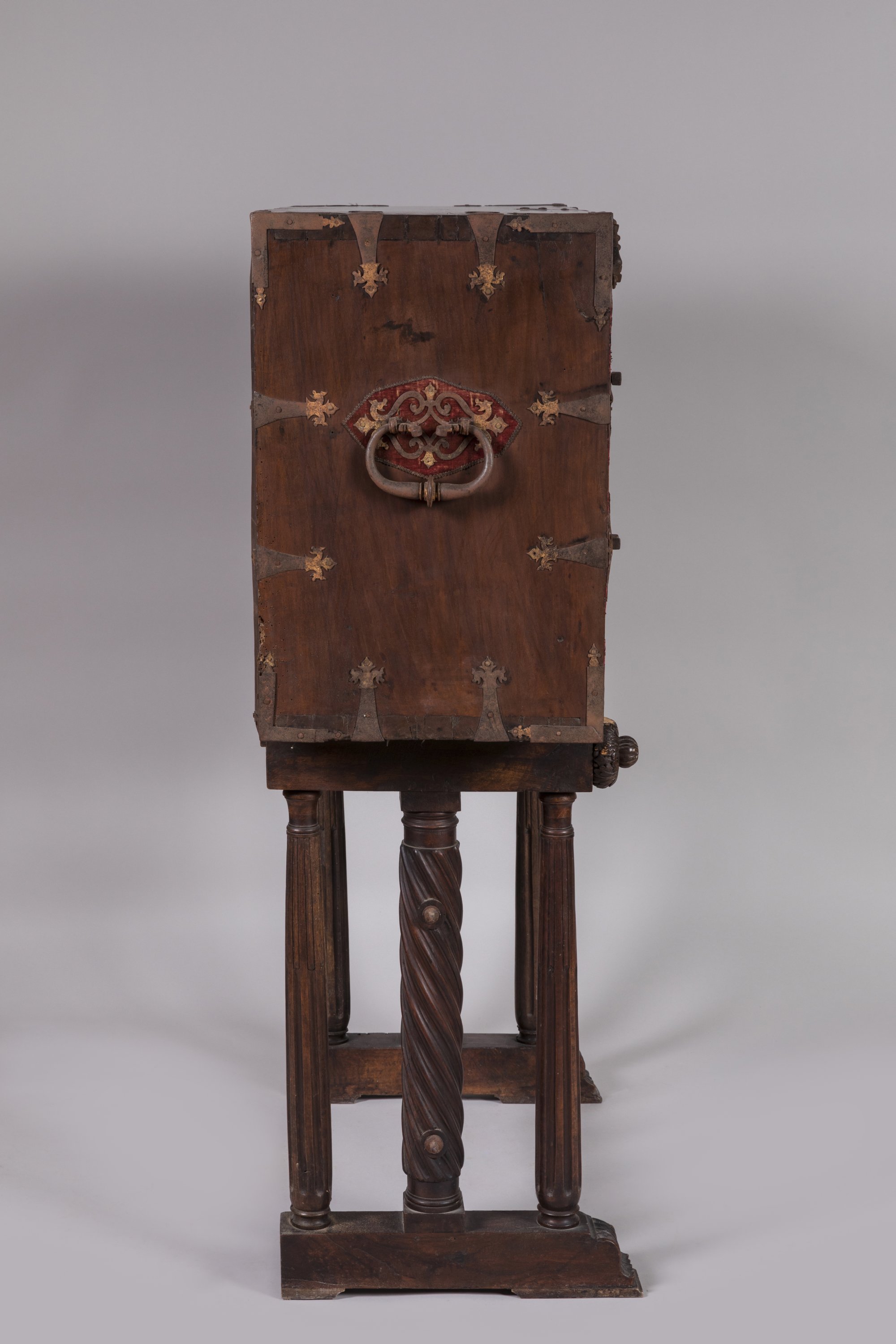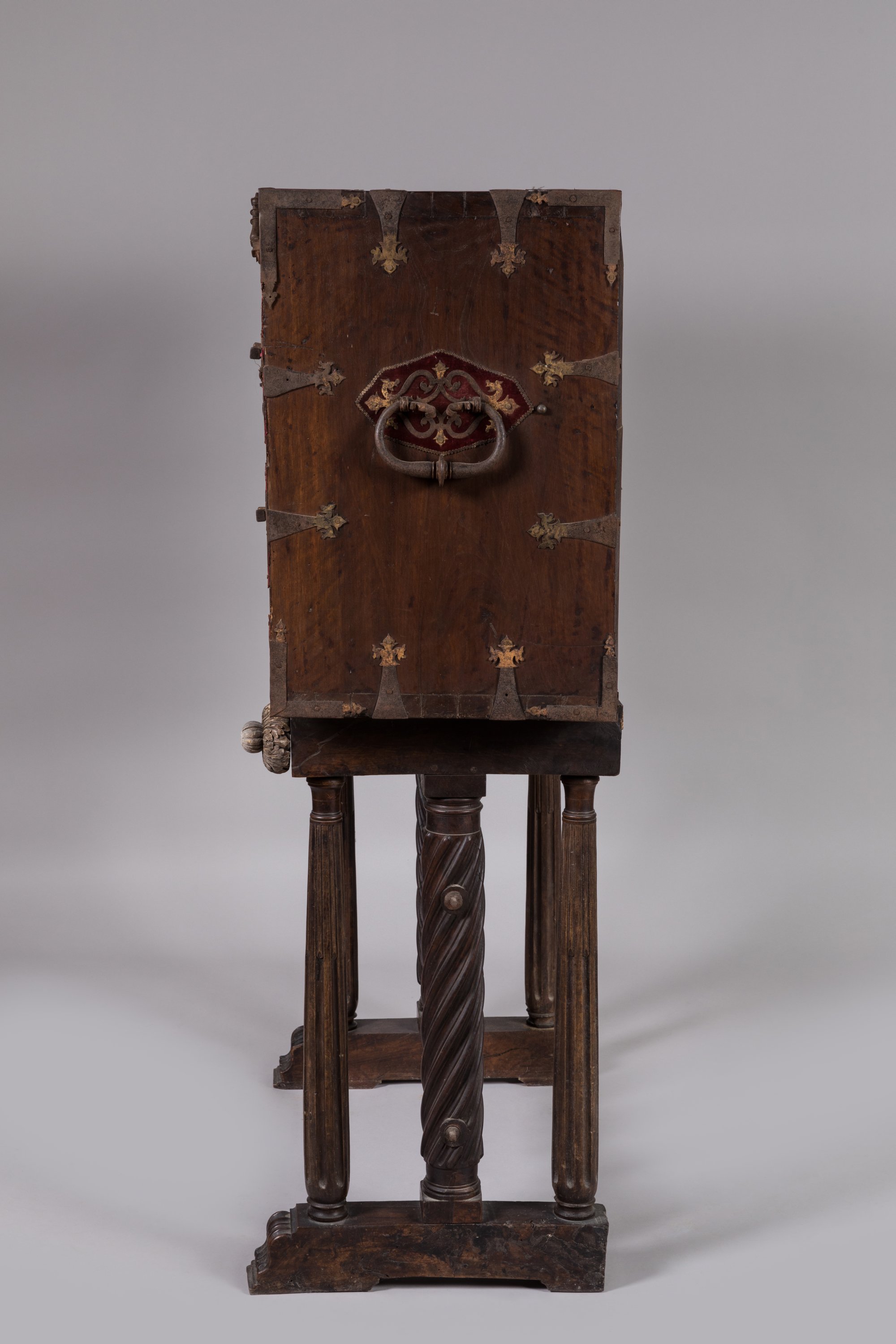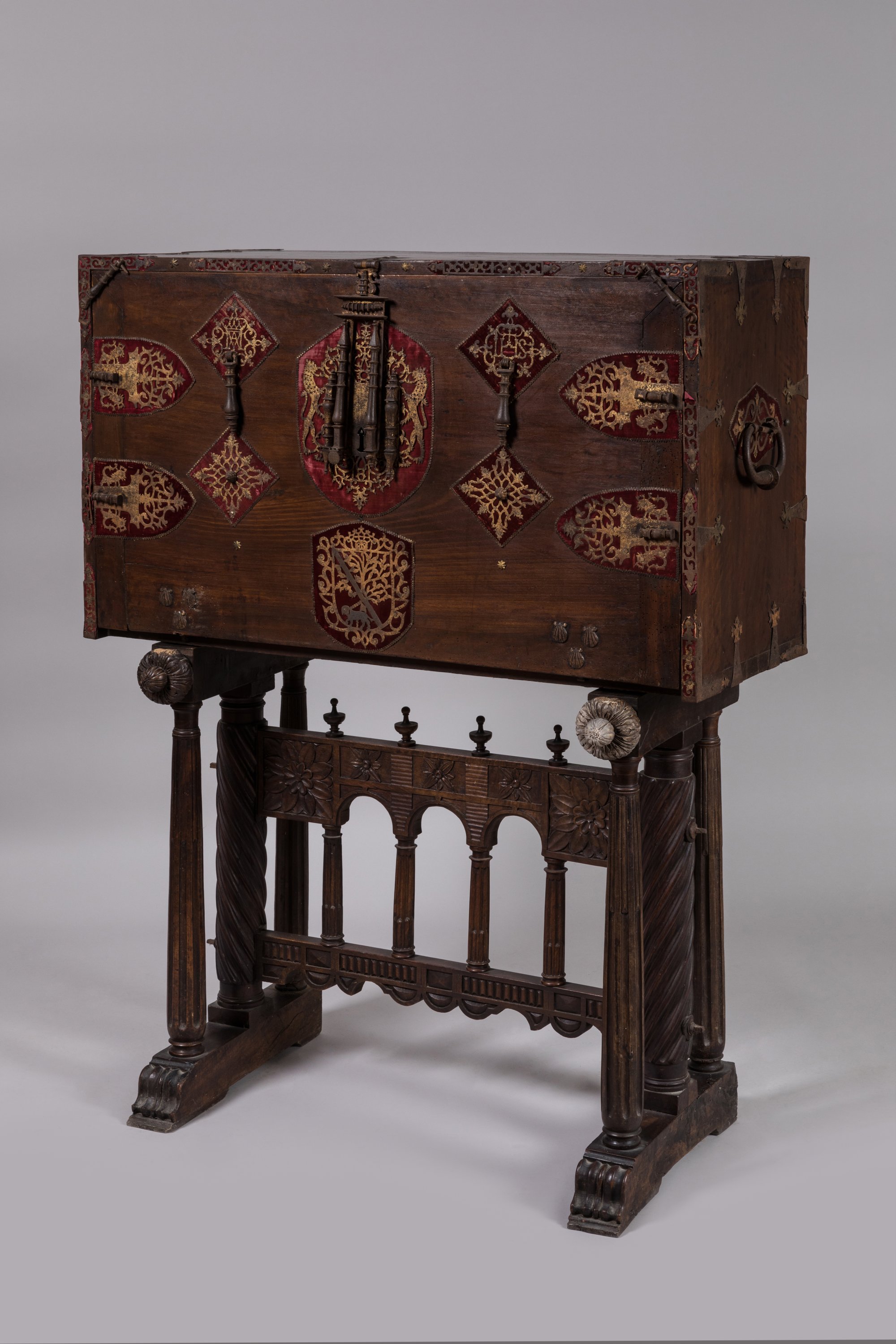 de forme rectangulaire en noyer. L'abattant est orné d'une serrure à moraillon à deux pênes et quatre verrous. Deux pendeloques et six coquilles Saint-Jacques. Des motifs en métal découpé sur fond de velours rouge.