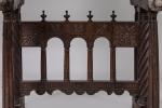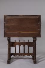 Sur un PIÉTEMENT avec montants à trois colonnes de chaque côté dont la centrale torsadée, reliées par une entretoise à arcatures. Tirettes avec prises à motifs végétaux.
