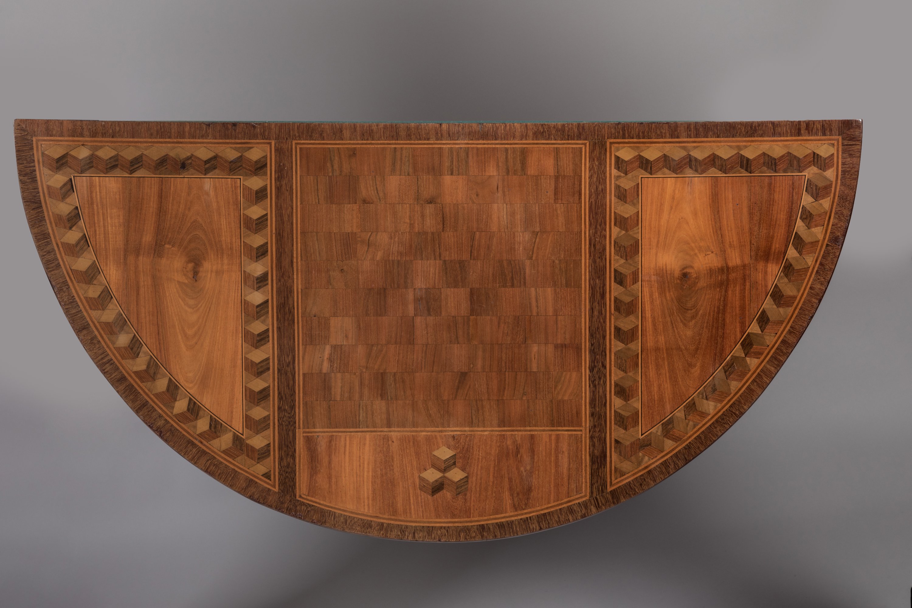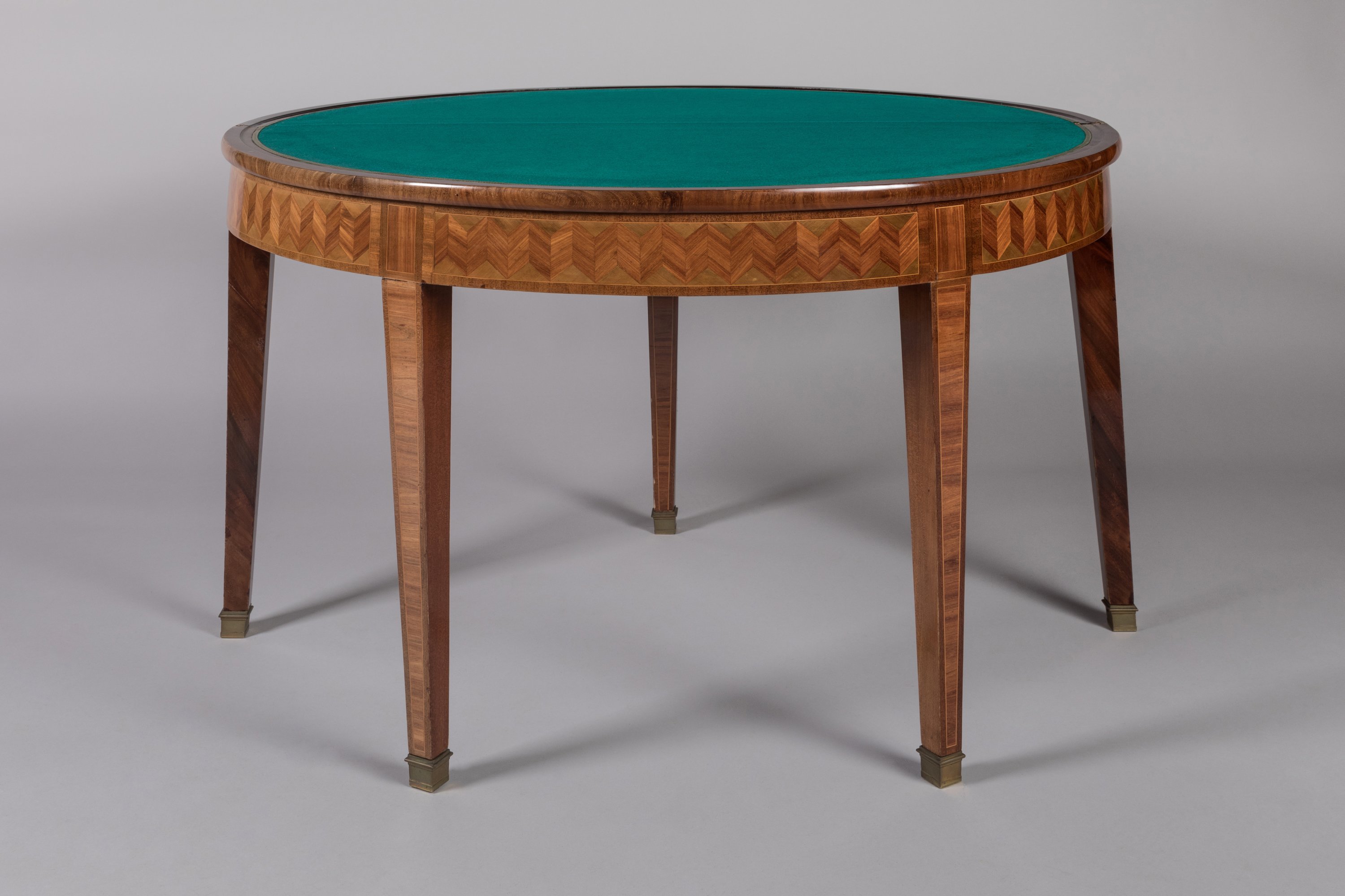 le plateau plaqué d'un damier et décor de cubes en bois de rose, amarante et prunier. Elle ouvre par un tiroir supporté par un pied. L'intérieur foncé d'un velours vert avec un galon. Elle repose sur cinq pieds en gaine.