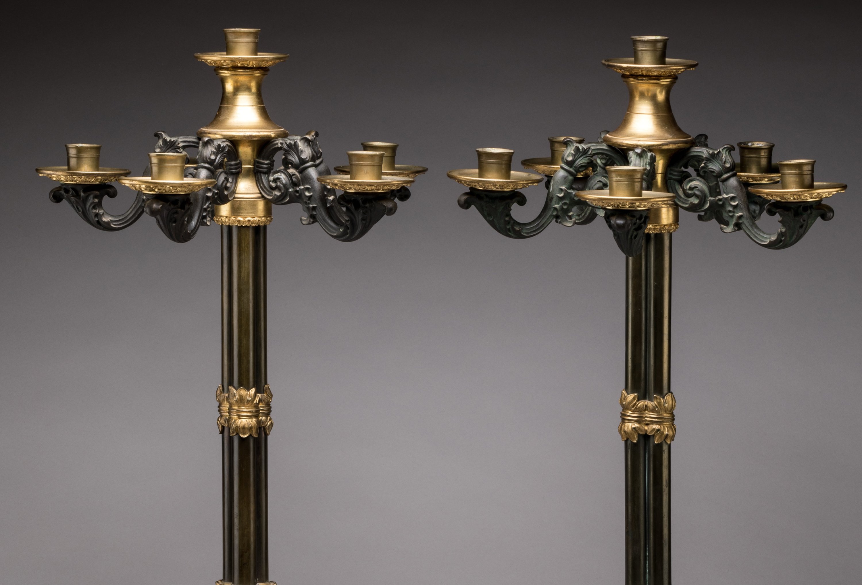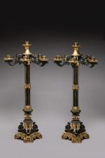 Pair of candelabra close to Thomire's productions, alternating gilded bronze and bronze patina in the gun barrel style.