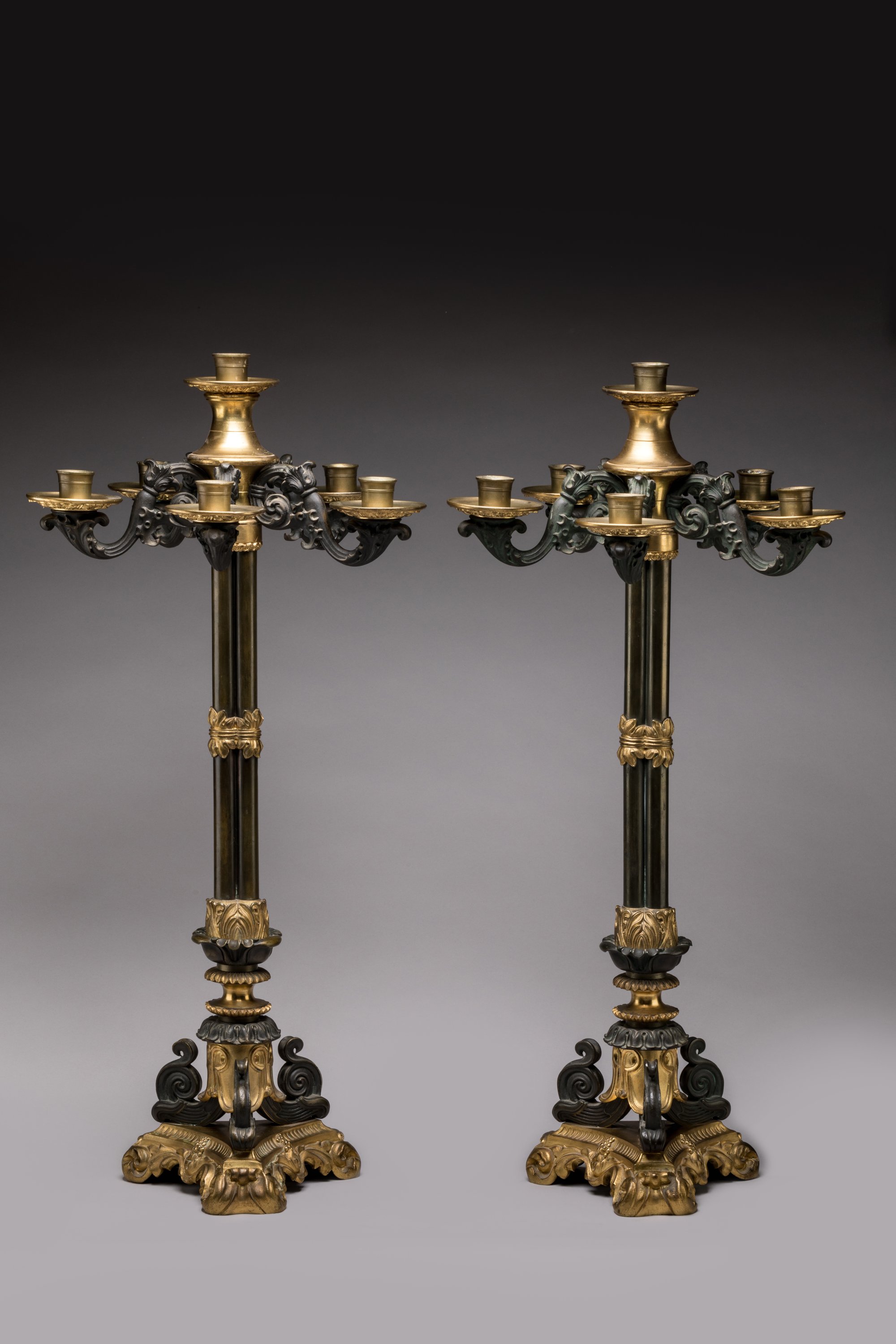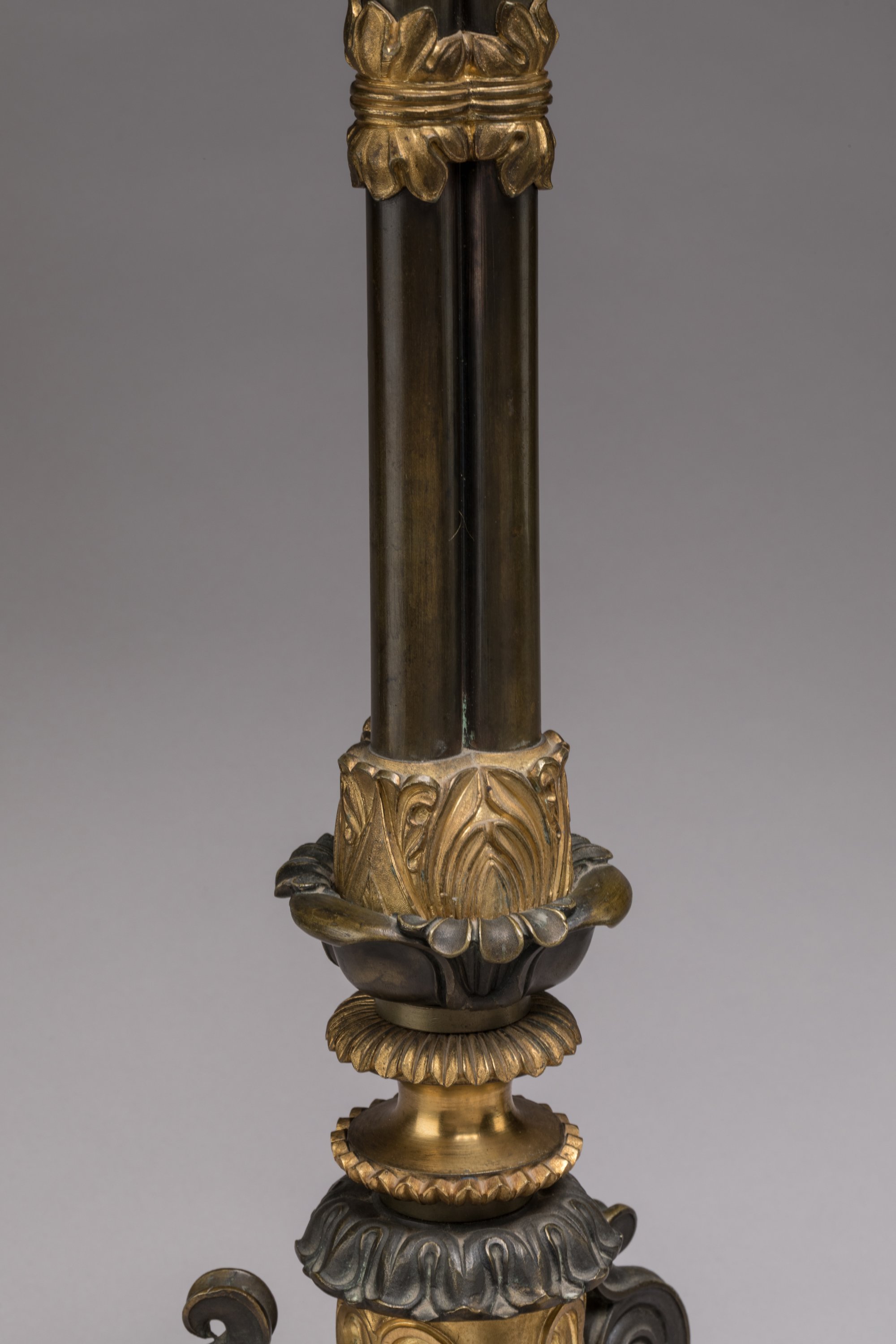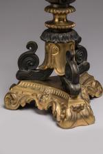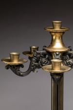 à cinq bras de lumière et une lumière sommitale en bronze alternant bronze doré et bronze à patine canon de fusil. Les bras de lumière à enroulements feuillagés rayonnant autour d'une toupie reçoivent chacun des bobèches à décor de rinceaux. Elle repose sur un triple fût réuni par une bague centrale. La base tripode à enroulement sur un piédestal en bronze doré mouvementé.