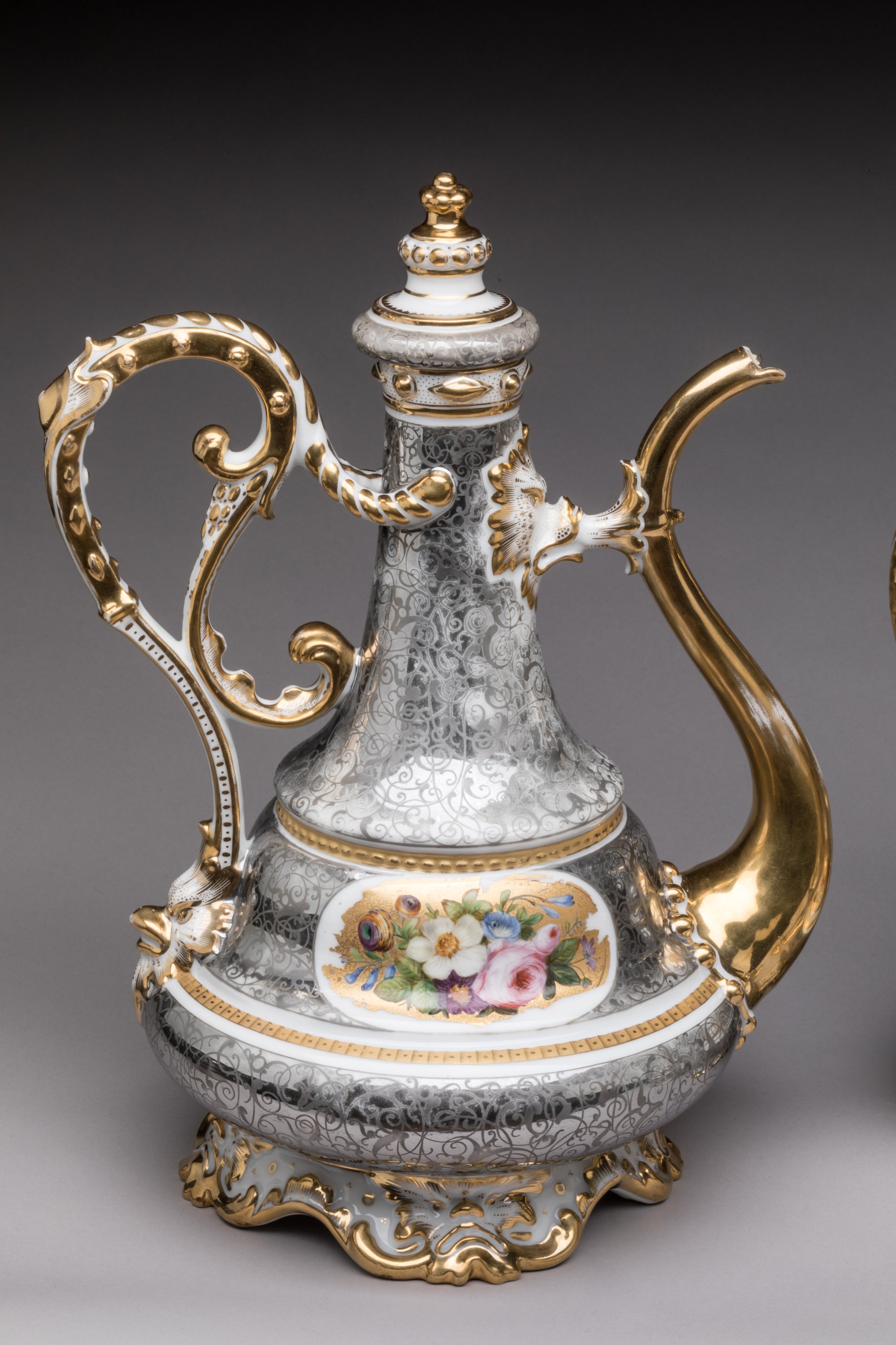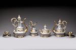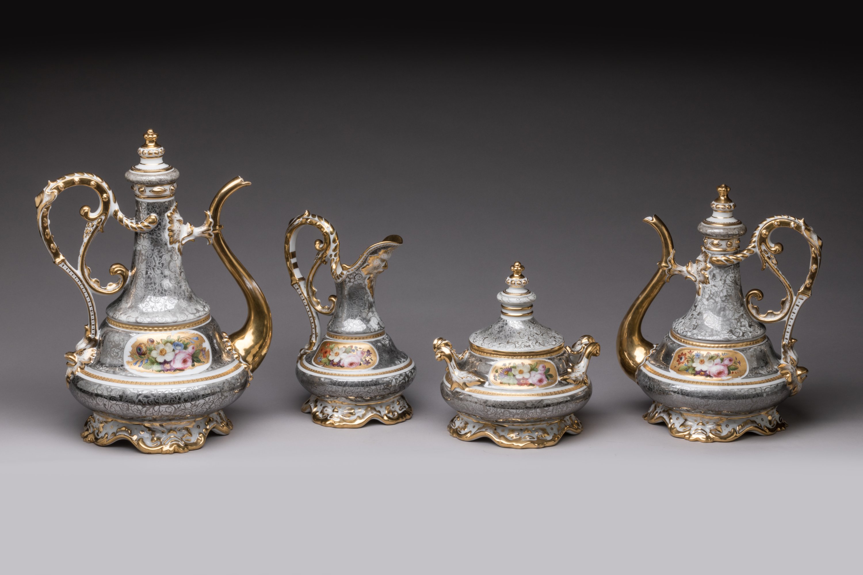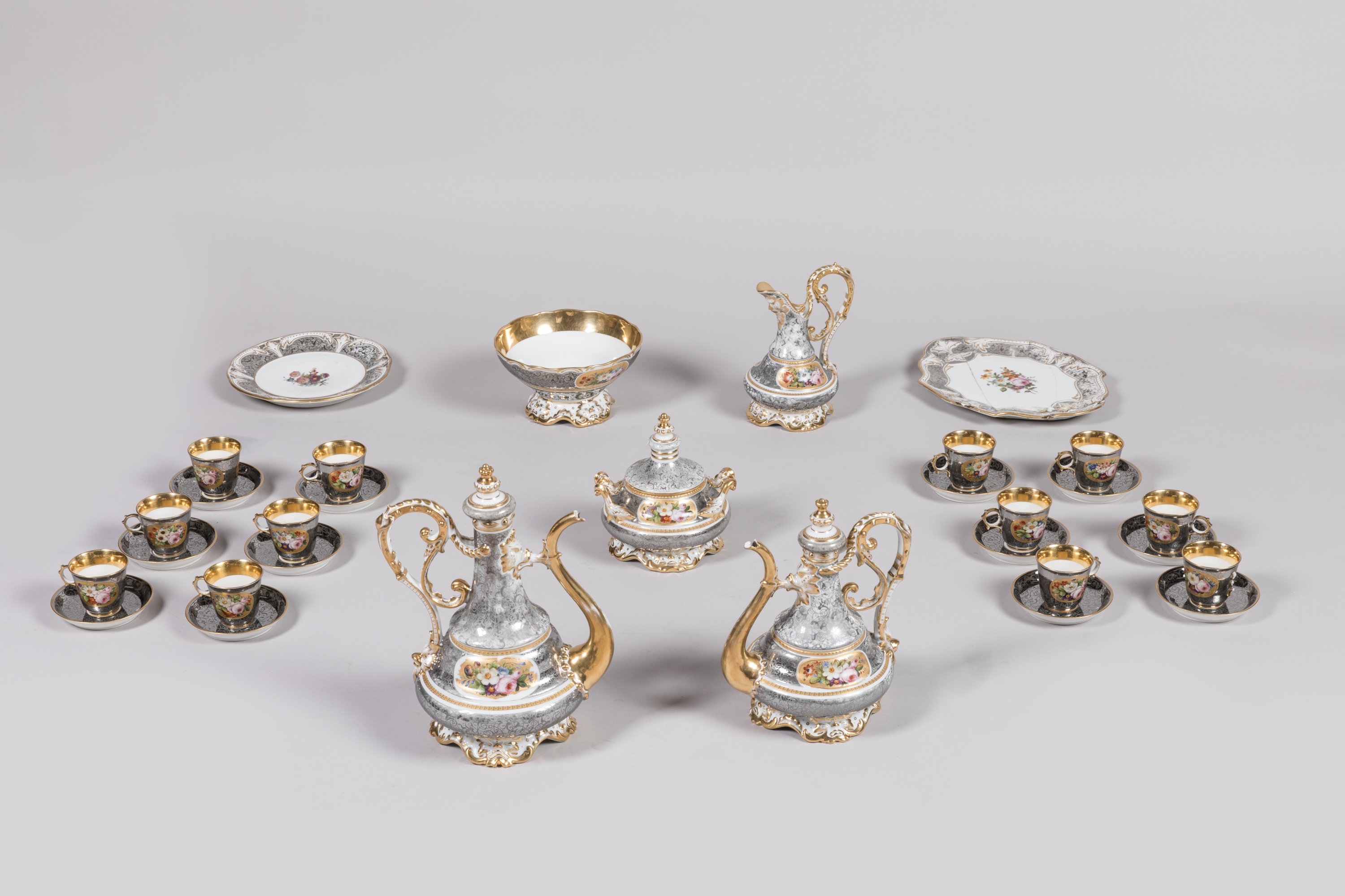 en porcelaine de trente pièces comprenant une cafetière couverte, une théière couverte, un pot à sucre couvert, un pot à lait, une jatte, douze tasses et douze soucoupes, un plat à gâteaux carré, une assiette à gâteaux, décor polychrome de bouquets de fleurs dans des cartouches à fond or sur fond platine orné dentre lacs darabesques, les verseuses inspirées de formes ottomanes.