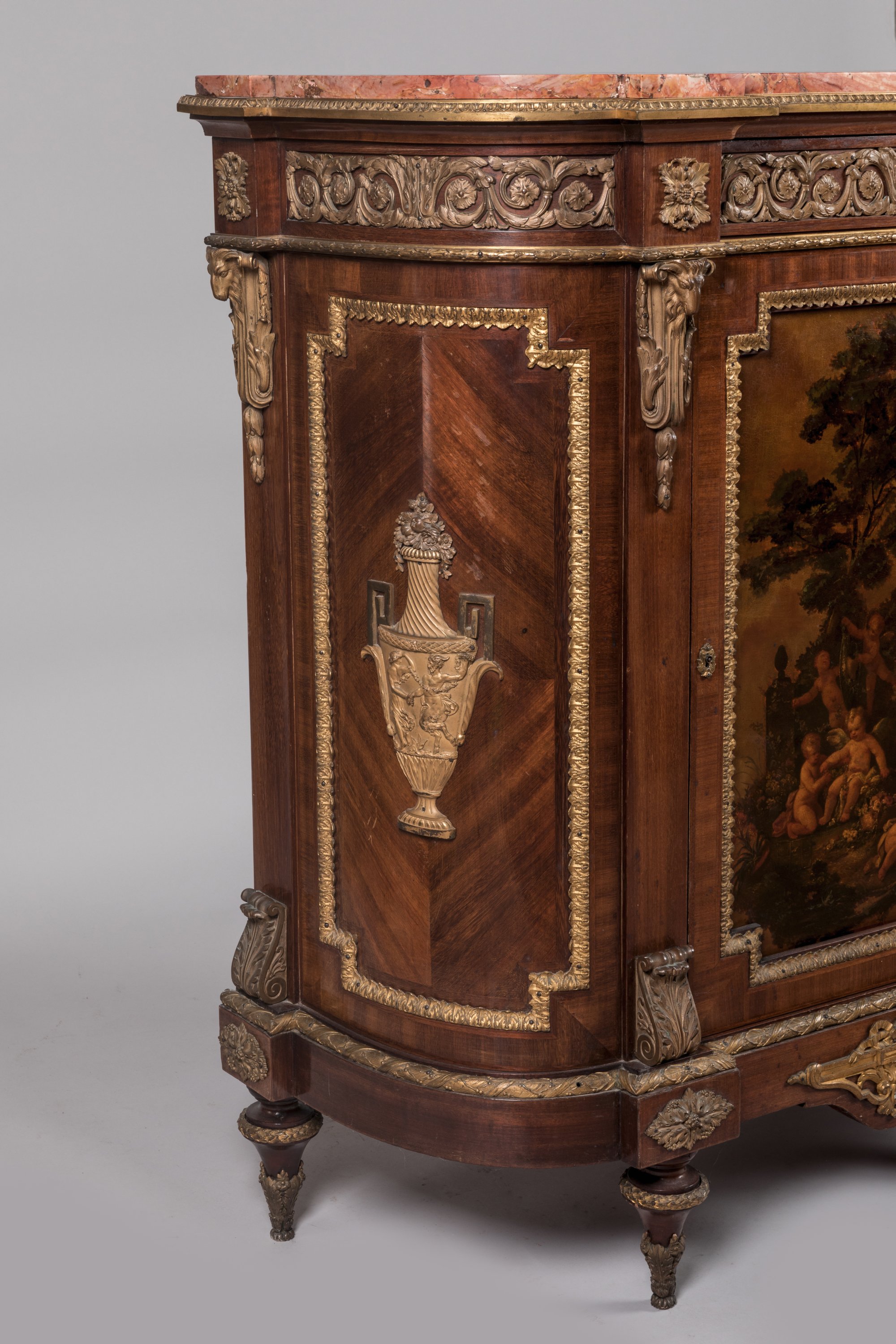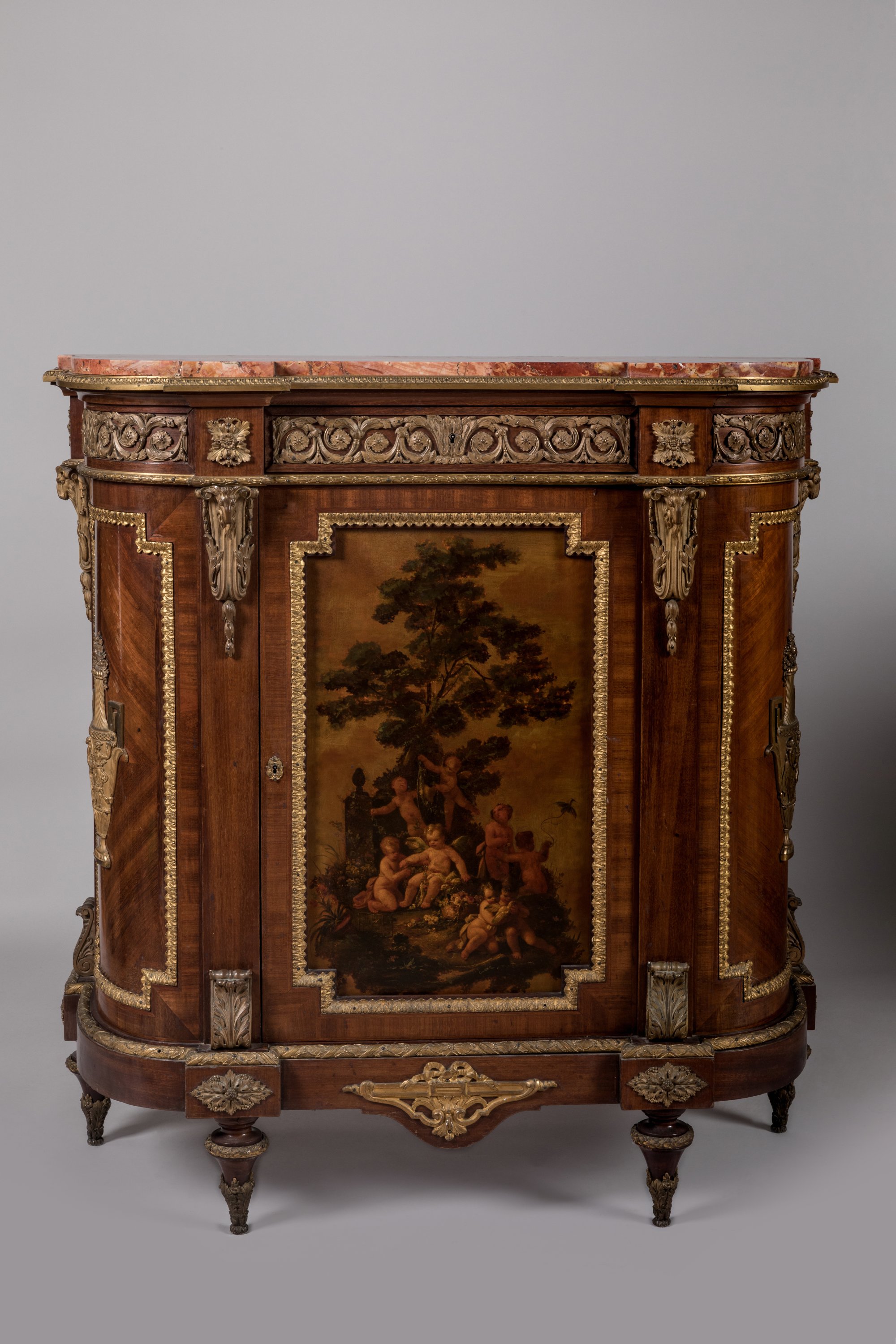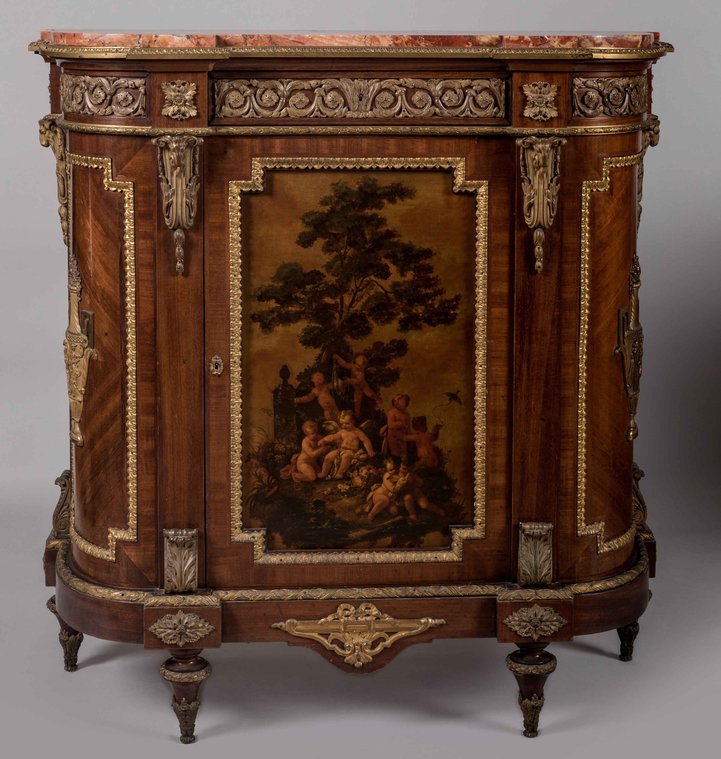 Notre meuble d'entre-deux figure une réunion de putti sous un arbre, traitée en vernis dans le genre Martin. Quatre jouent avec des oiseaux, deux cueillent des fleurs tandis que deux autres supportent un miroir. La scène est inscrite dans un paysage à l'antique symbolisé par un piédestal supportant une cassolette, qui prend la forme d'une pomme de pin. Parmi les meilleurs ébénistes usant de la technique du vernis Martin au XIXe siècle, figurent François Linke, Henry Dasson et Louis-Auguste-Alfred Beurdeley. Notre meuble d'entre-deux peut davantage être comparé aux manières de ce dernier atelier famillial. D'une part la frise de la ceinture supérieure présente un motif de rinceaux très proche de l'important meuble à hauteur d'appui conservé au Musée des Arts décoratifs (inv. 46514). D'autre part, les putti très potelés avec leurs petits cous se confondant dans leurs mentons sont semblables à sa manière de les représenter.