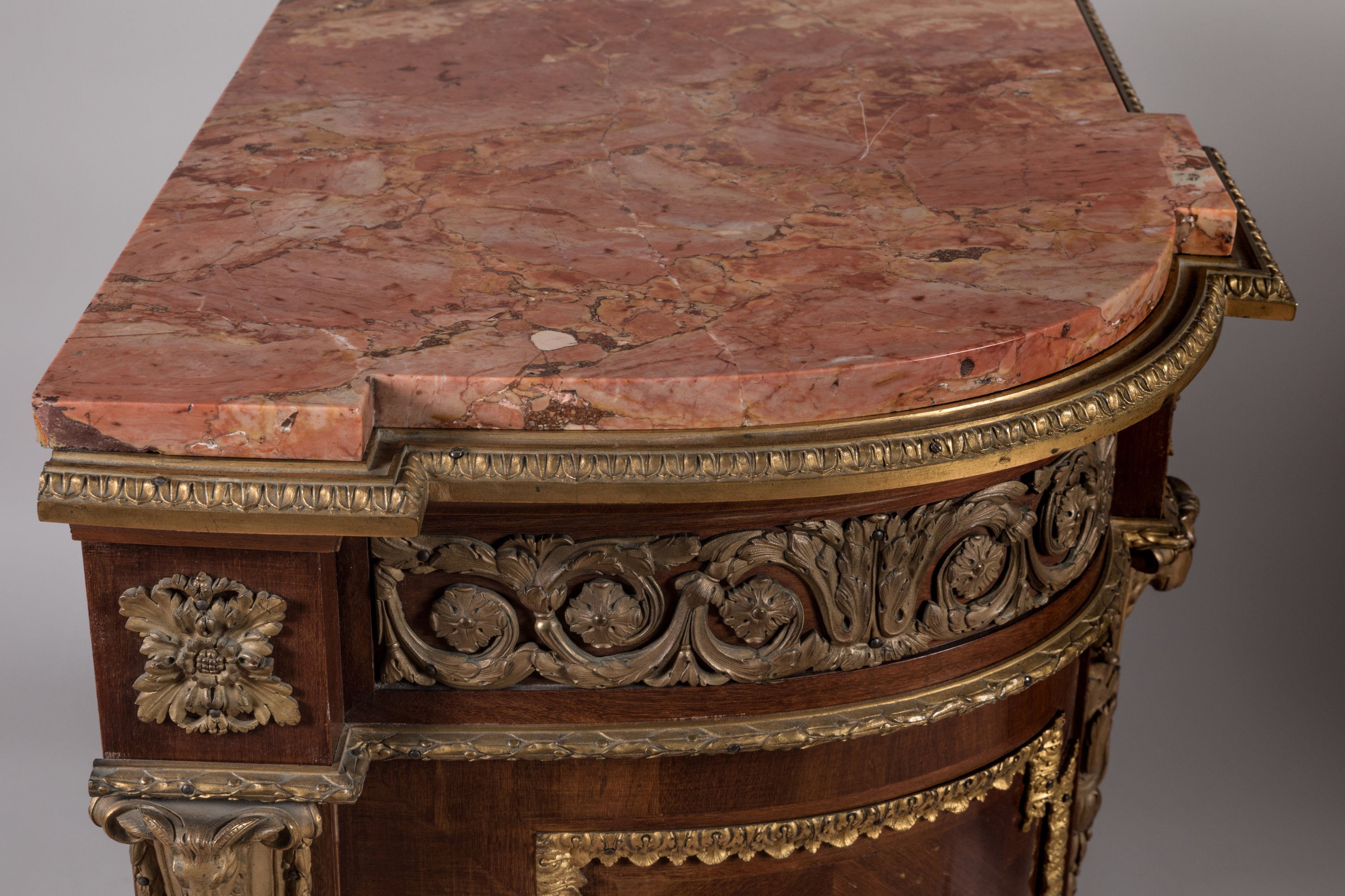 Le meuble repose sur quatre pieds toupies. Riche ornementation de bronzes dorés, dont entrées de serrure, lingotières, chutes d'angle, appliques, console, frise et sabots.
