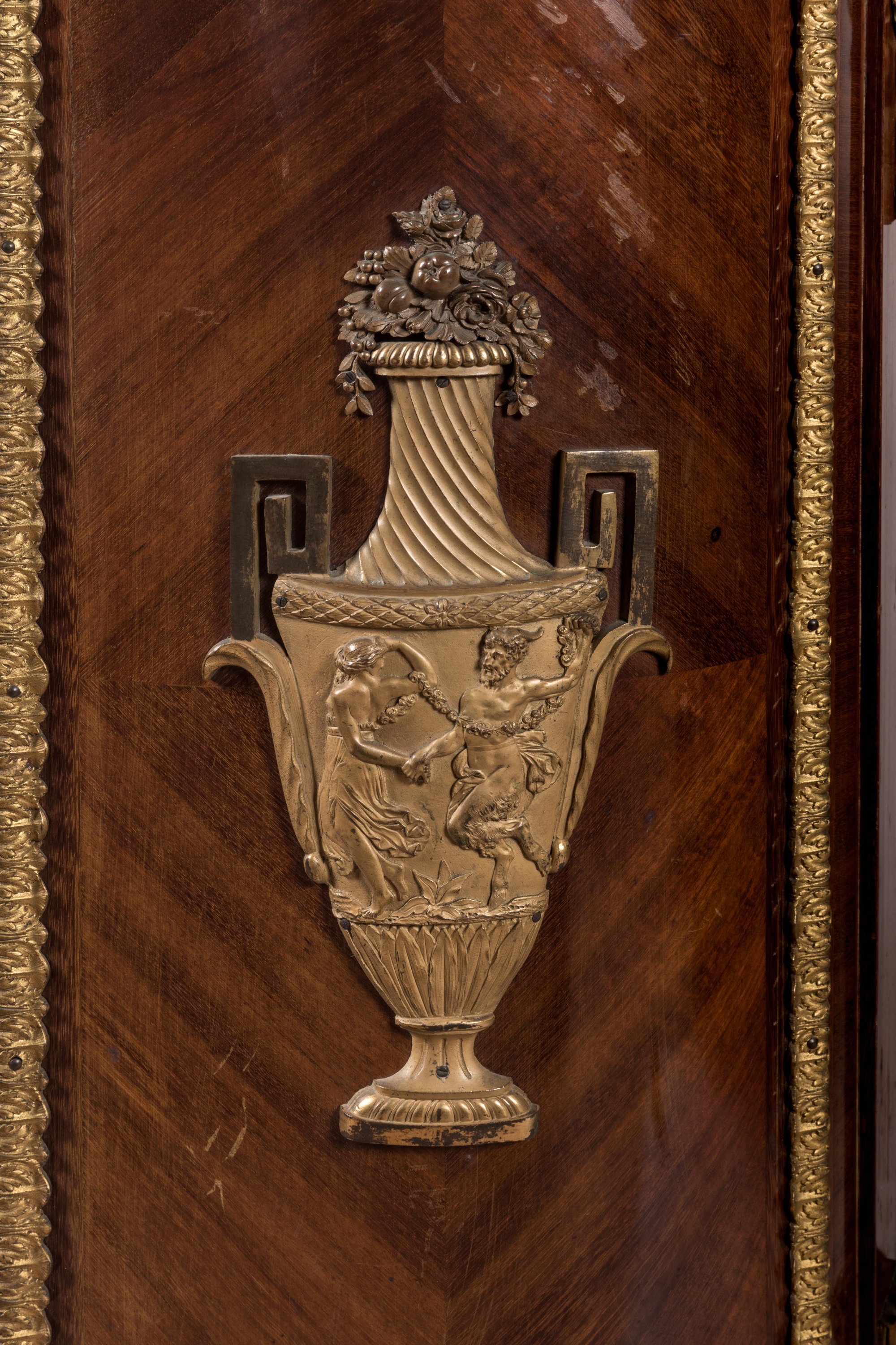 Les côtés en marqueterie de frisage losangé, sont parés de la même ornementation de bronzes aux angles rentrés. Ils présentent, au centre, une applique en bronze doré en forme de vase balustre fleuri, au col godronné, aux anses grecques et décoré sur la panse d'une danse de Pan et Flore.