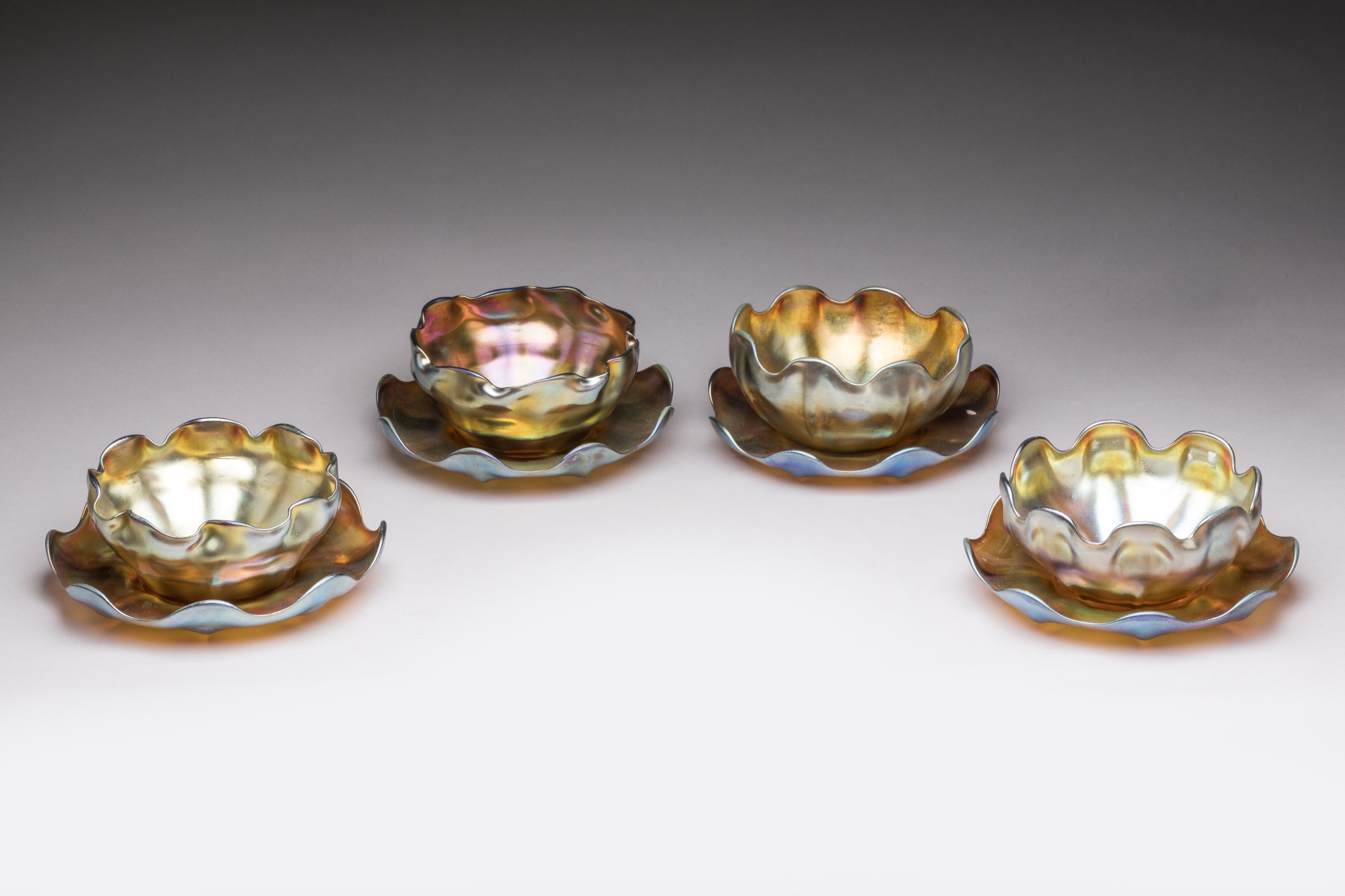 Four "Favrile Glass" cups and saucers by Louis Comfort Tiffany.