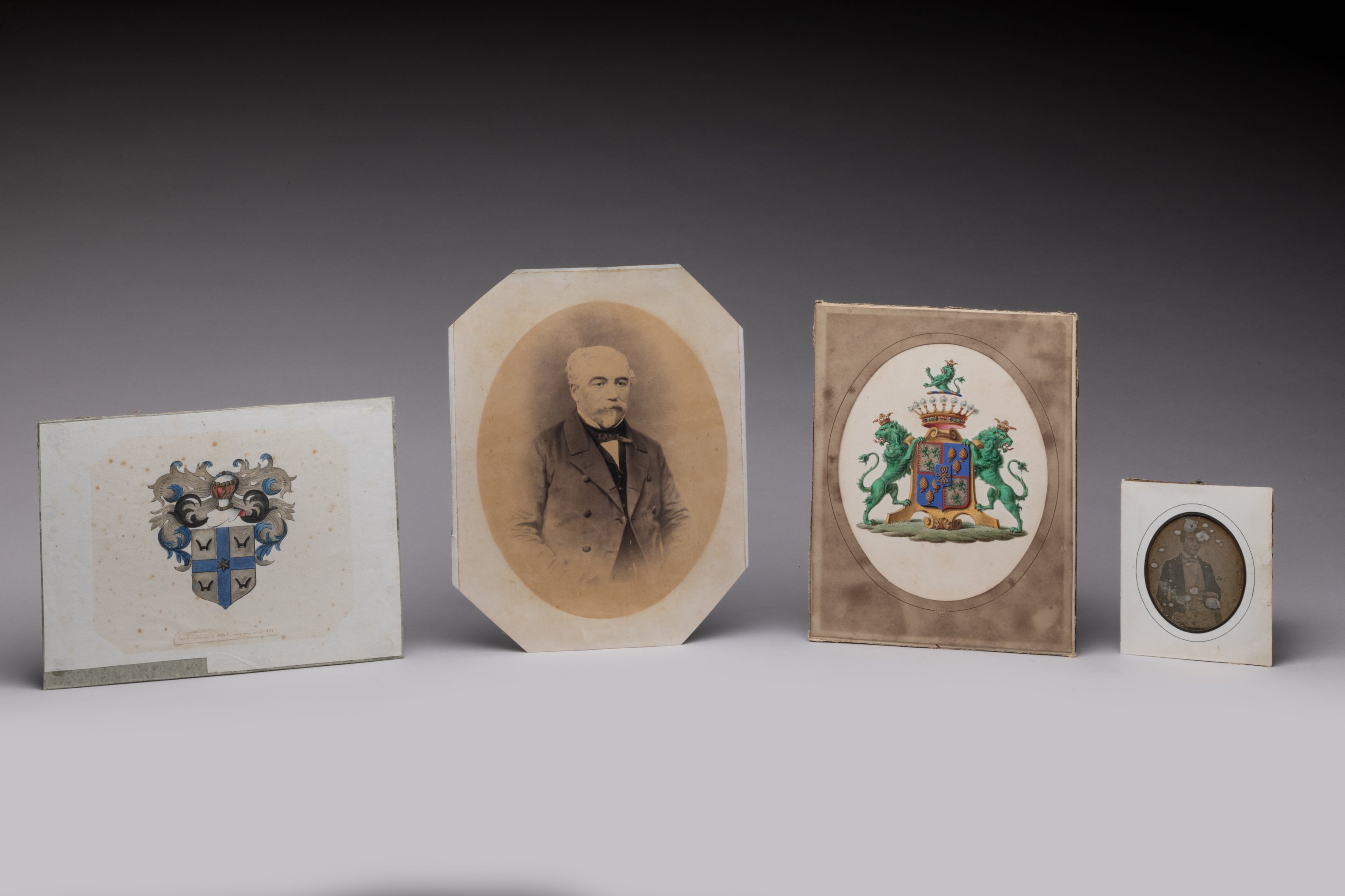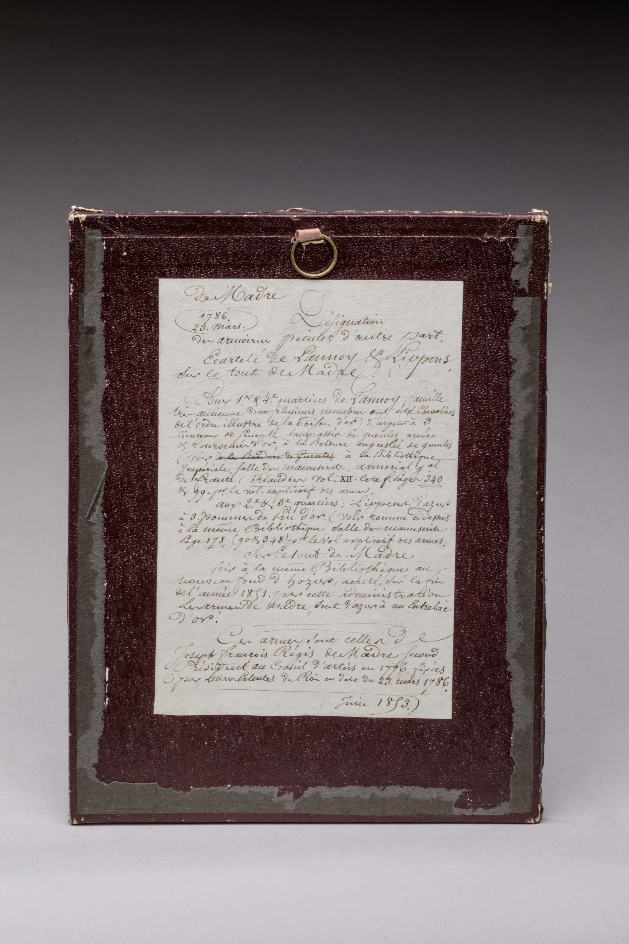 Dessin en couleur, aux tonalités très bien conservées, portant, en son centre, les initiales de Auguste BISSON qui, avant de pratiquer le daguerréotype, aidait son père pour ses travaux de peinture héraldique. Au dos du blason un texte manuscrit, daté de juin 1853, décrit la généalogie de la famille de Madre de Loos.