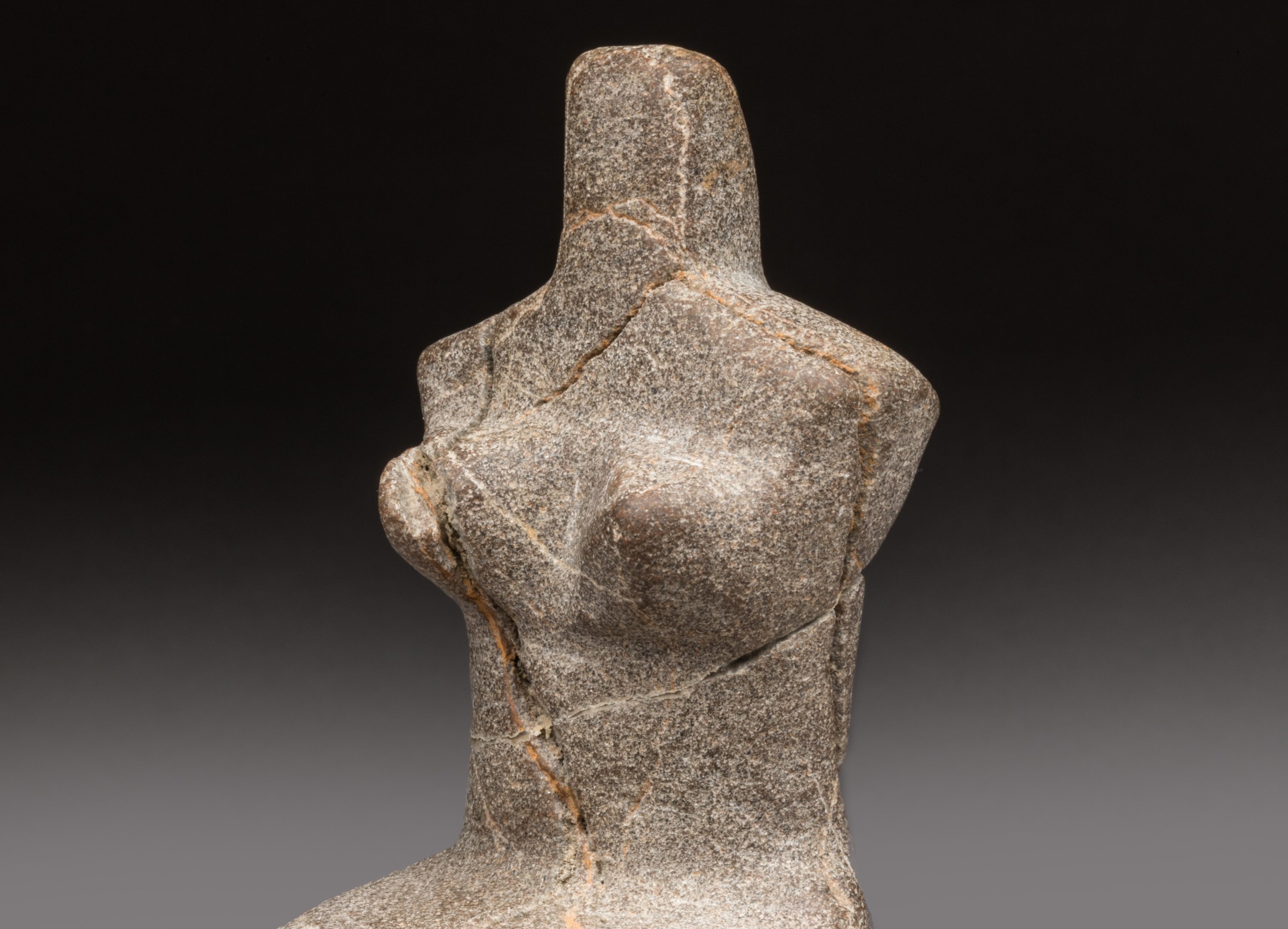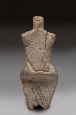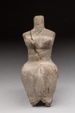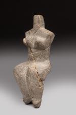 en pierre polie grise. Personnification assise de la fécondité avec des formes généreuses et anguleuses. La tête et les bras sont simplement suggérés.