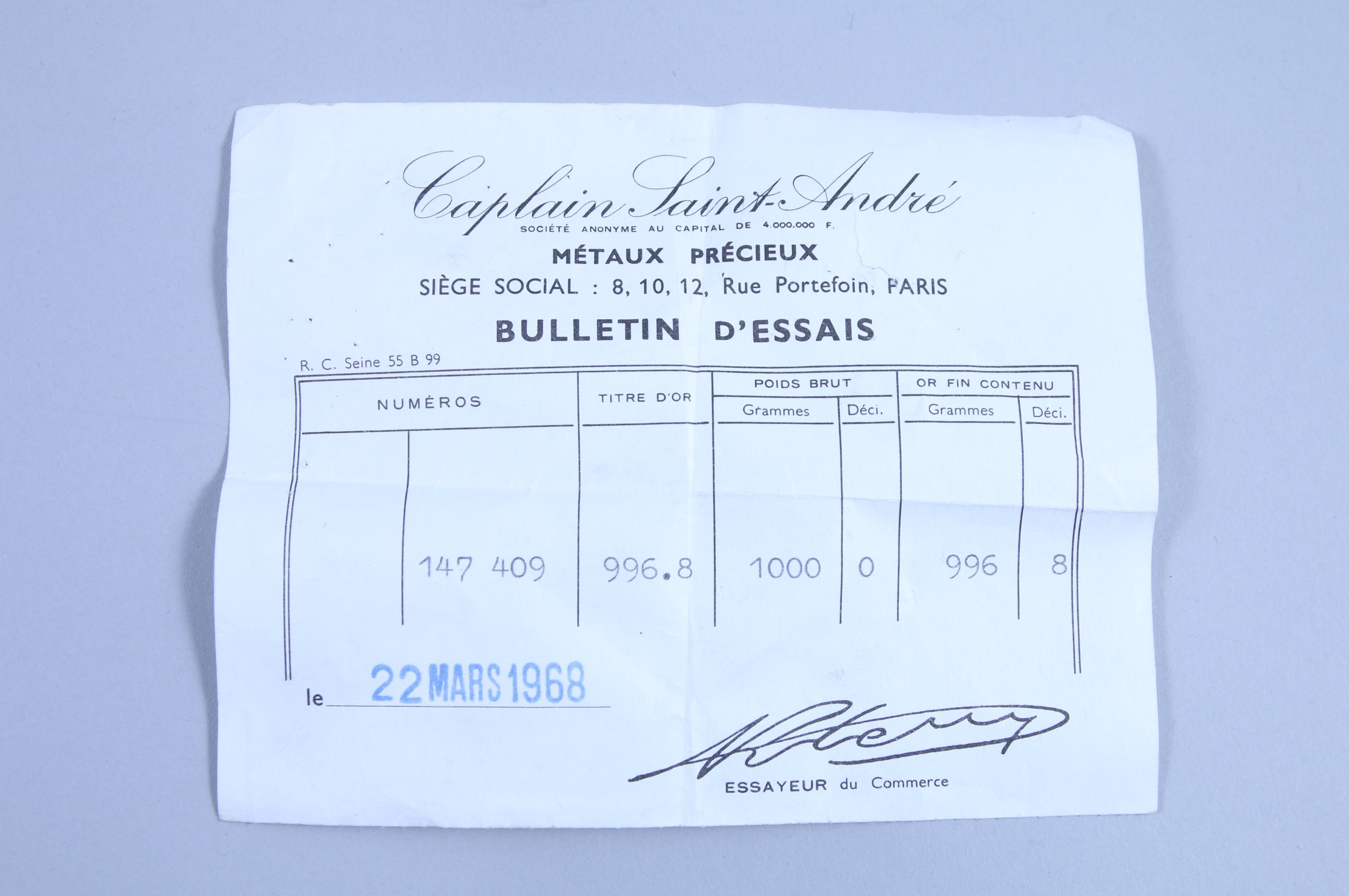 LINGOT OR. Bulletin d'essais du 22 mars 1968: n°147409. Titre d'or 996,8. Poids brut 1.000 g. Or fin 996,8 gr.