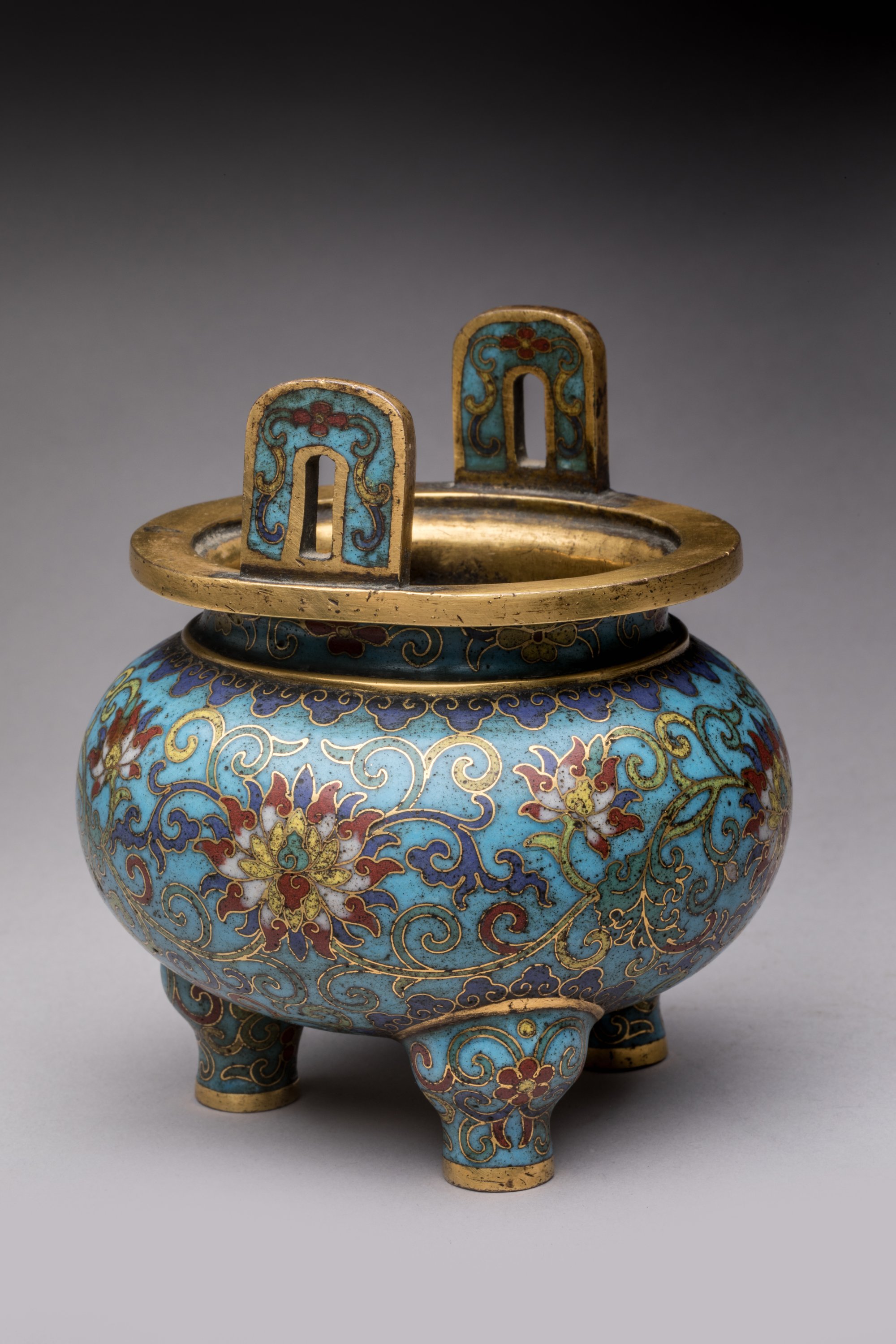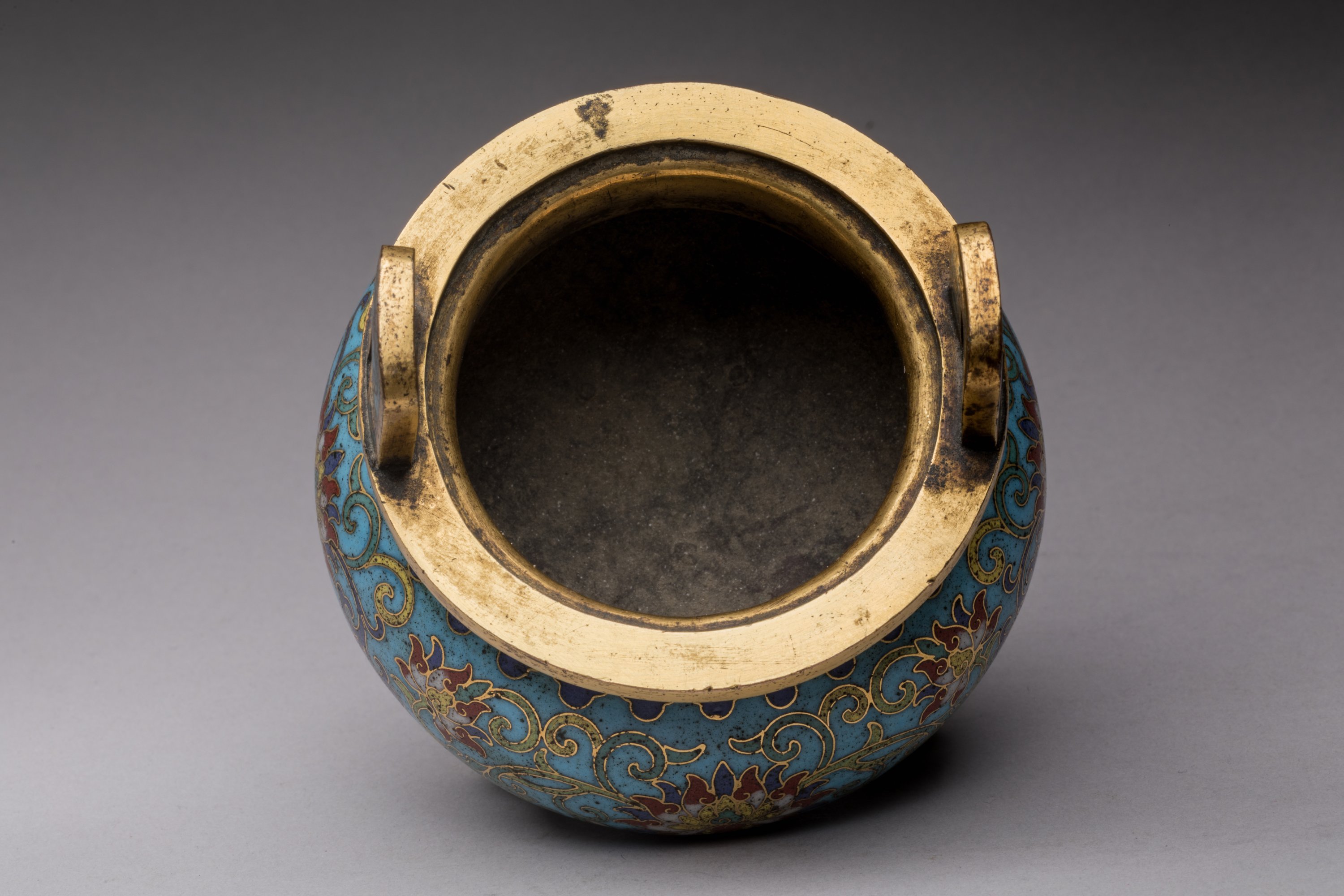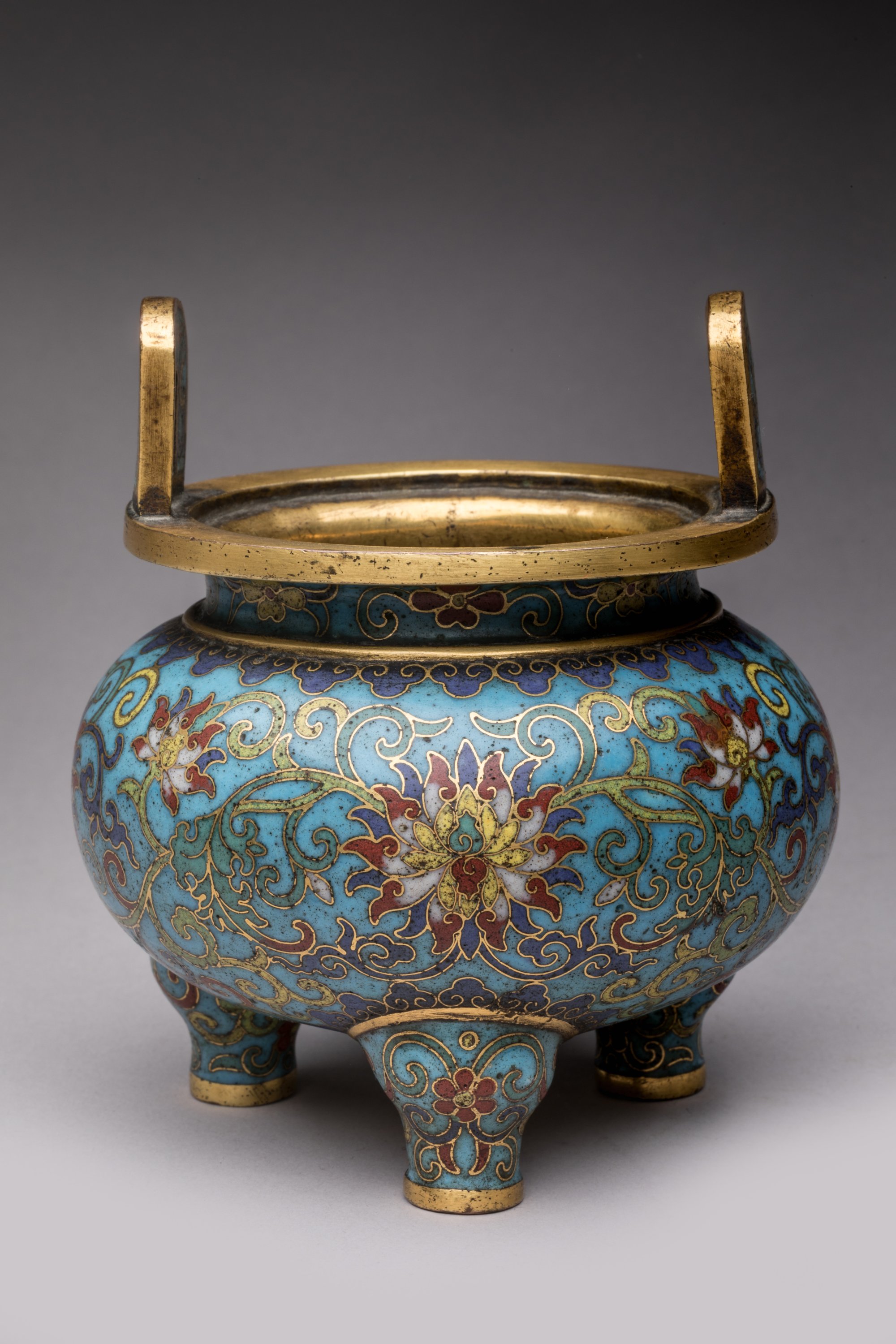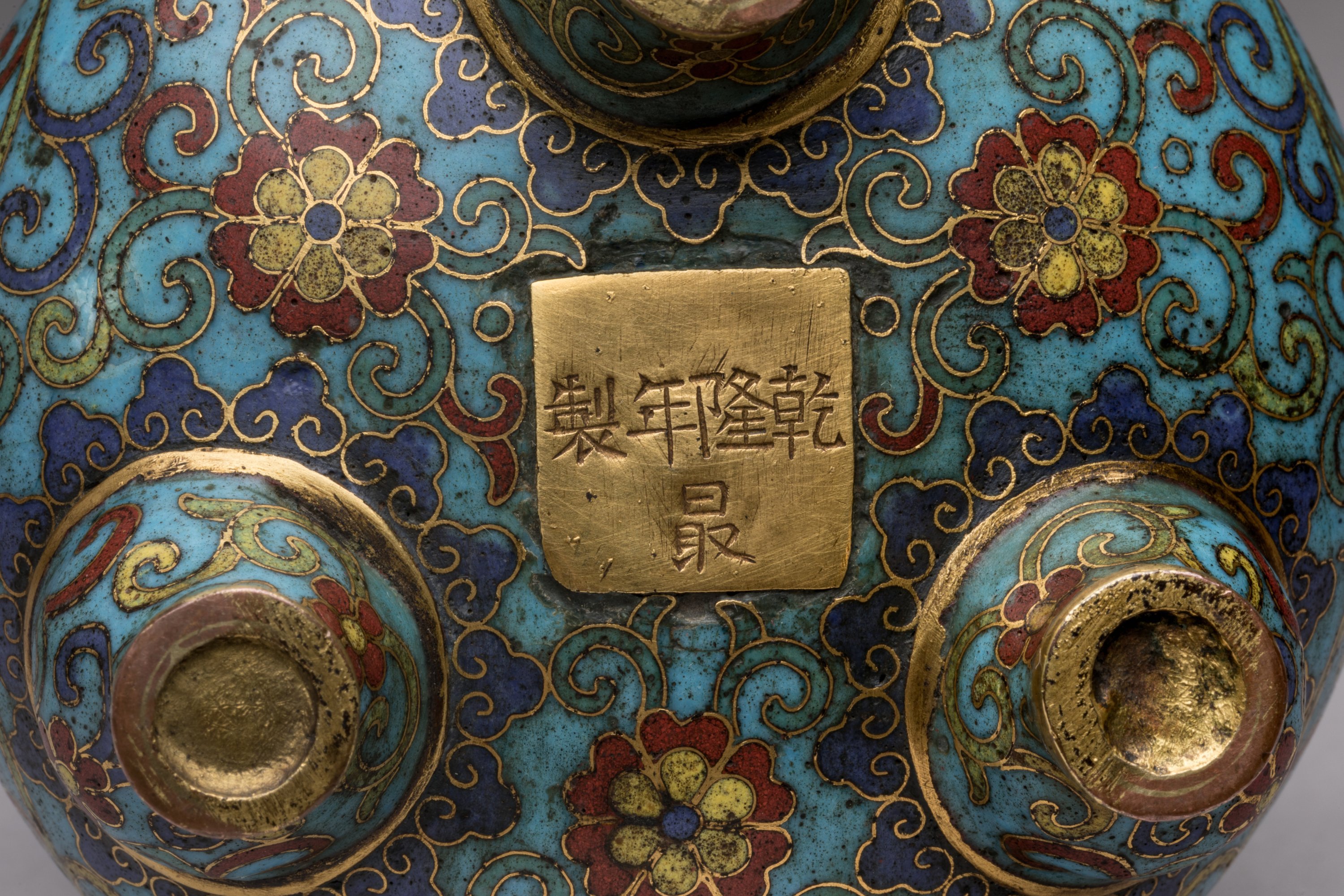 en bronze émaux cloisonnés à décor de fleurs de lotus parmi les rinceaux sur fond turquoise, les pieds ornés de fleurs stylisées, l'épaule ornée d'une frise de ruyi.