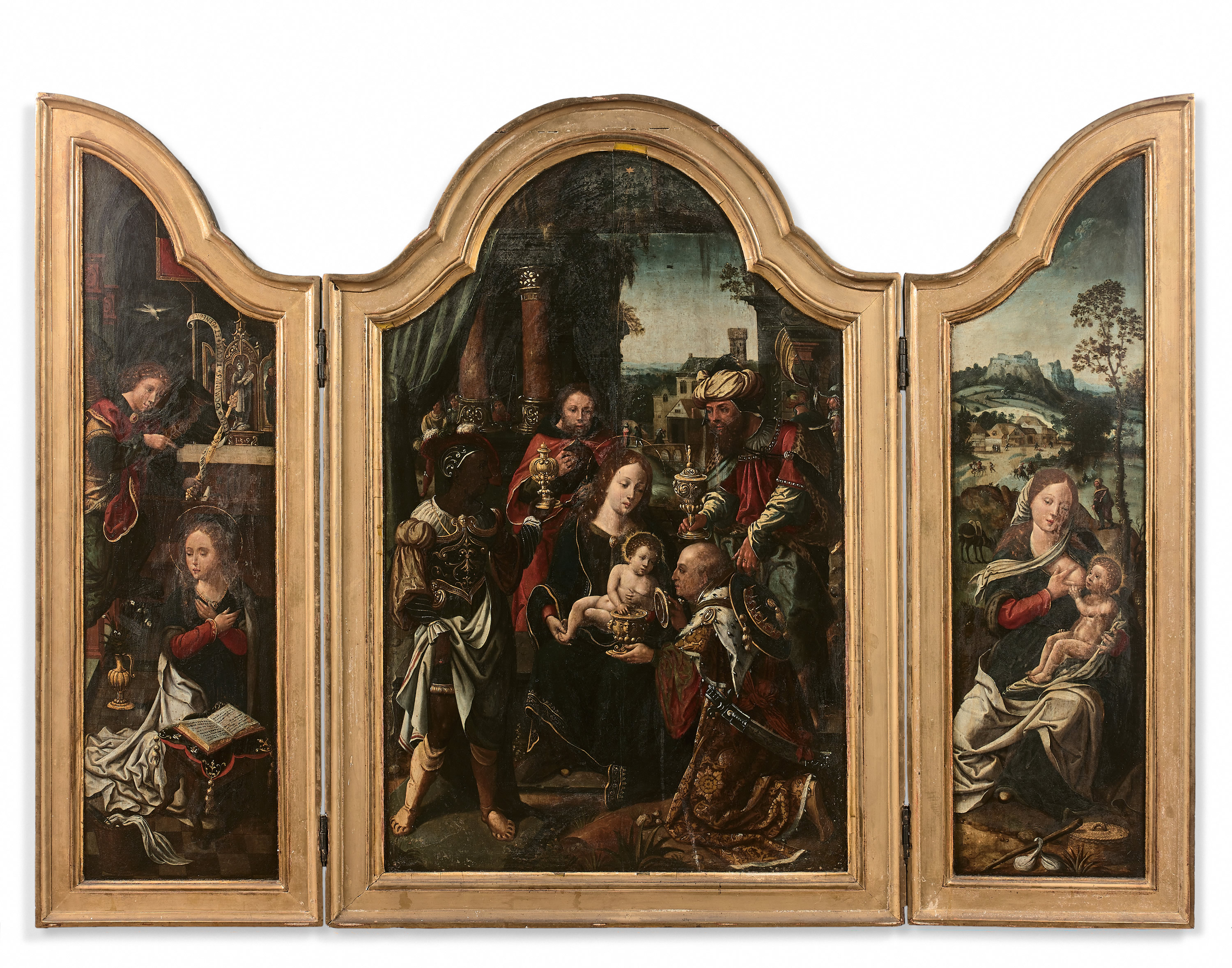 Pieter Coeck et son atelier ont réalisé un certain nombre de triptyques pour la dévotion privée. Dans celui-ci, l'alternance des trois mêmes scènes évangéliques est similaire à deux autres conservés au Palazzo Bianco à Gênes (Georges Marlier, La Renaissance flamande, Pierre Coeck d'Alost, 1966, p.122, fig.46, 93 x 109 cm) et à l'Université de Princeton (Marlier, op.cit., p.125, fig.49, 99.5 × 137.5 cm) avec à chaque fois quelques variantes. Dans le panneau de gauche, l'Annonciation, le visage de la Vierge est tourné différemment vers la gauche. Les détails du paysage de la Fuite en Egypte varient aussi à chaque fois, et la composition centrale de notre uvre intervertie la place de chaque roi mage par rapport aux deux autres triptyques cités.