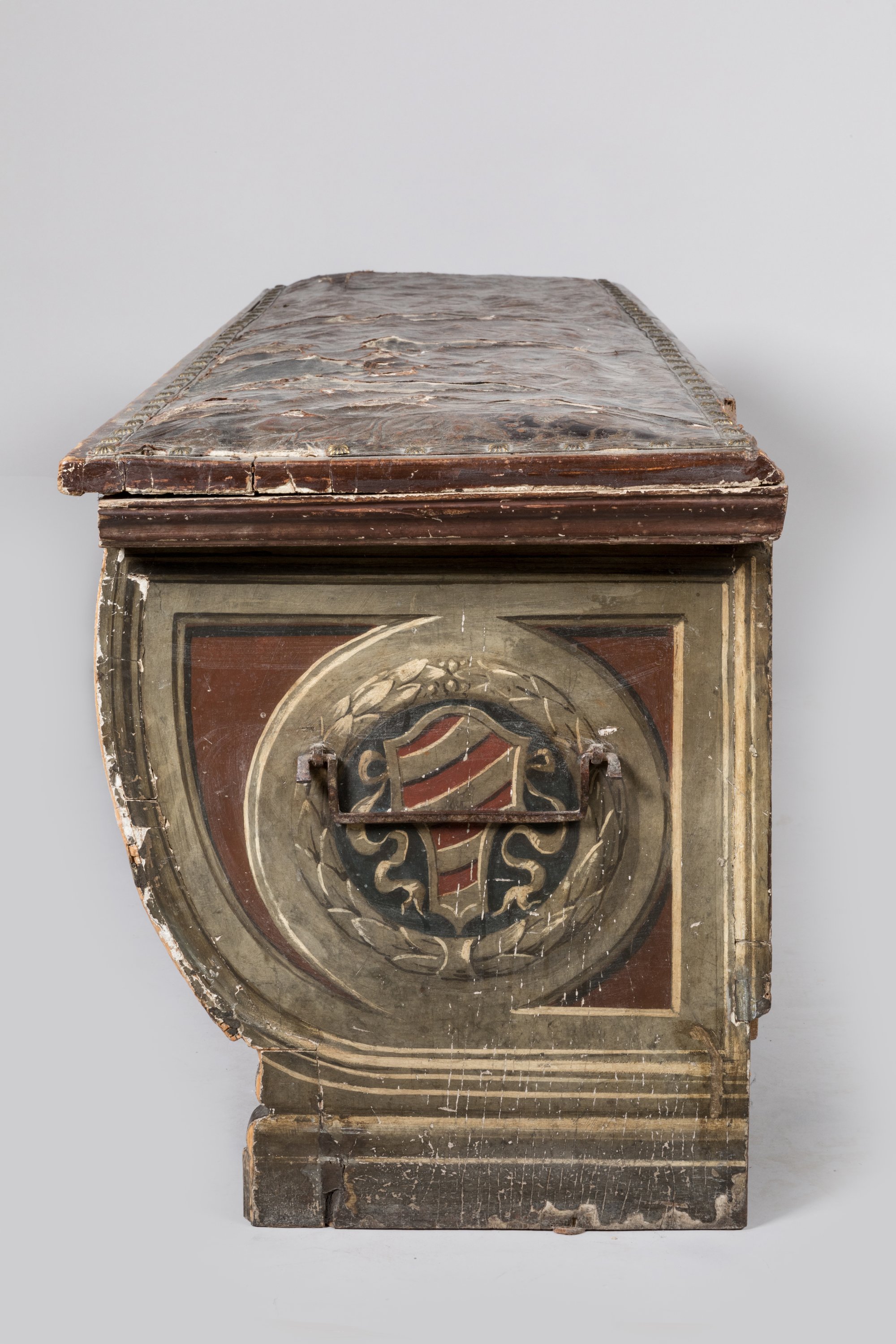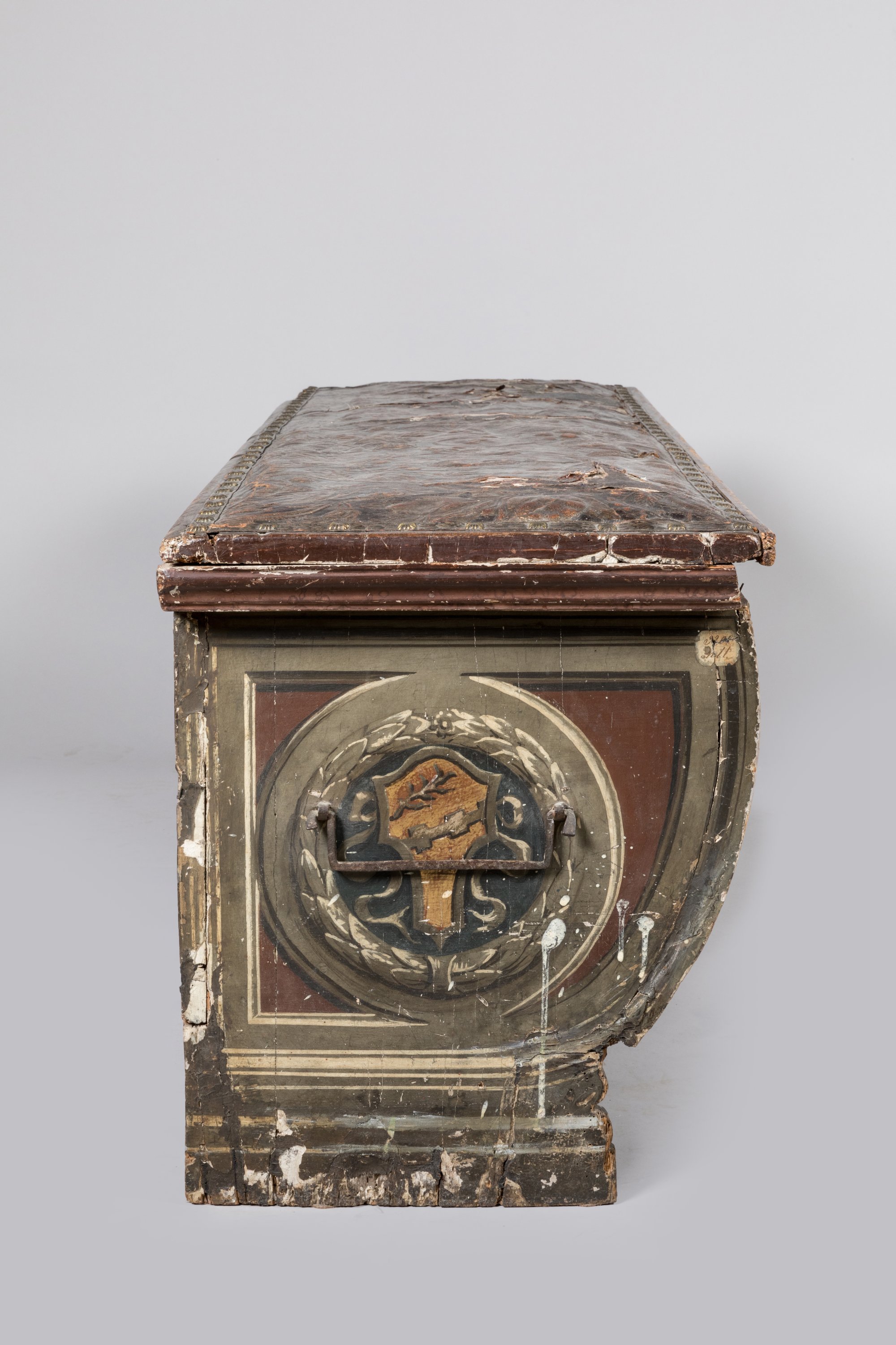 en bois de forme bombée en façade au décor polychrome et or de trois cartouches rectangulaires inscrits d'un vase sur piédouche. L'abattant est gainé d'un cuir de Cordoue aux motifs denroulements floraux et fruits.