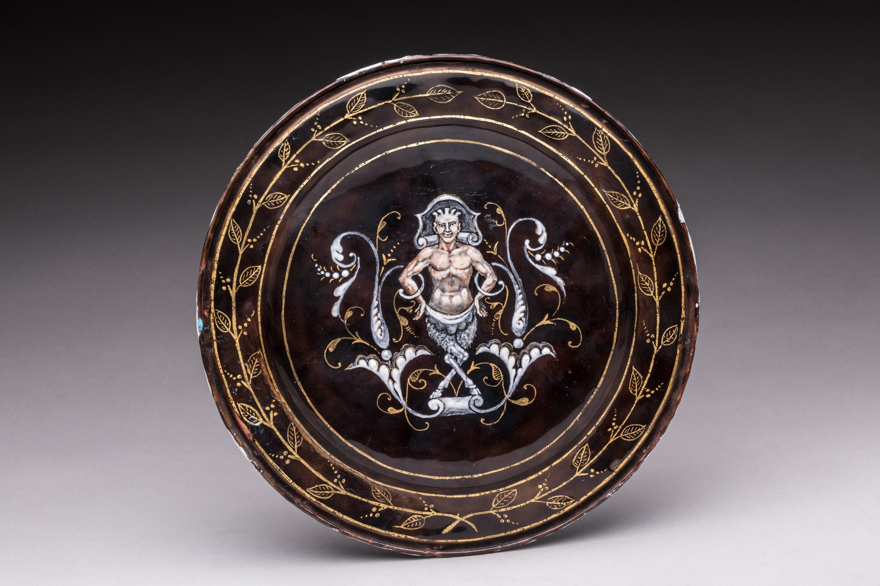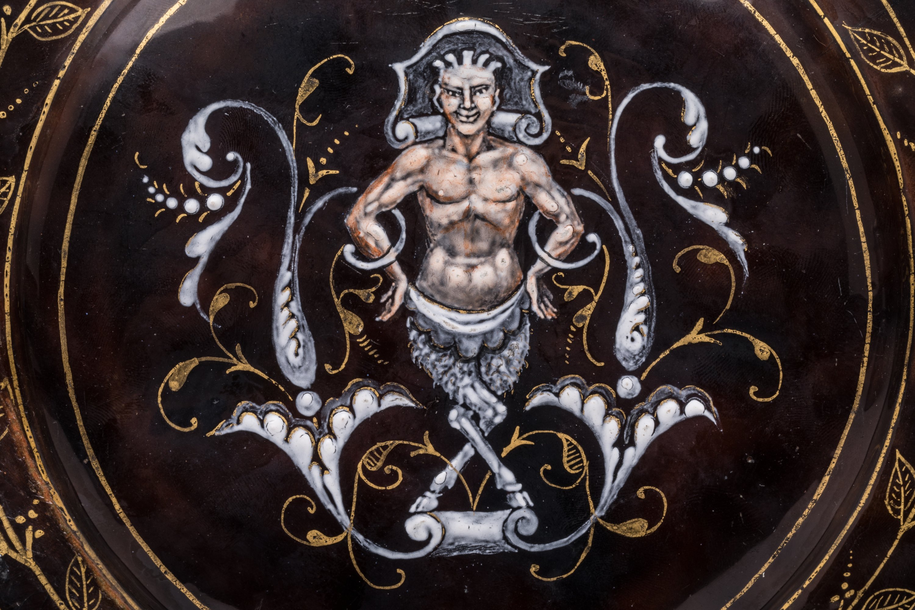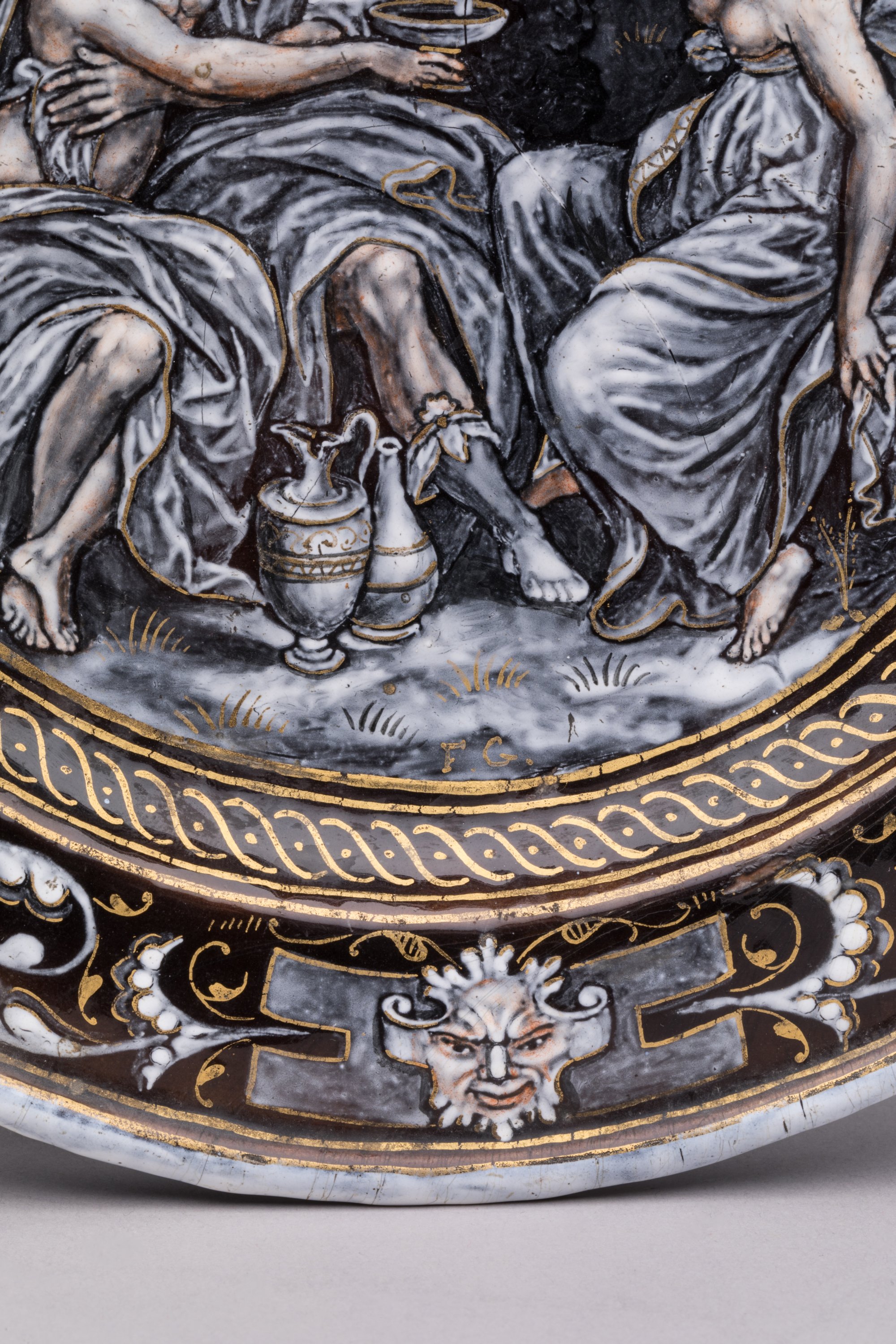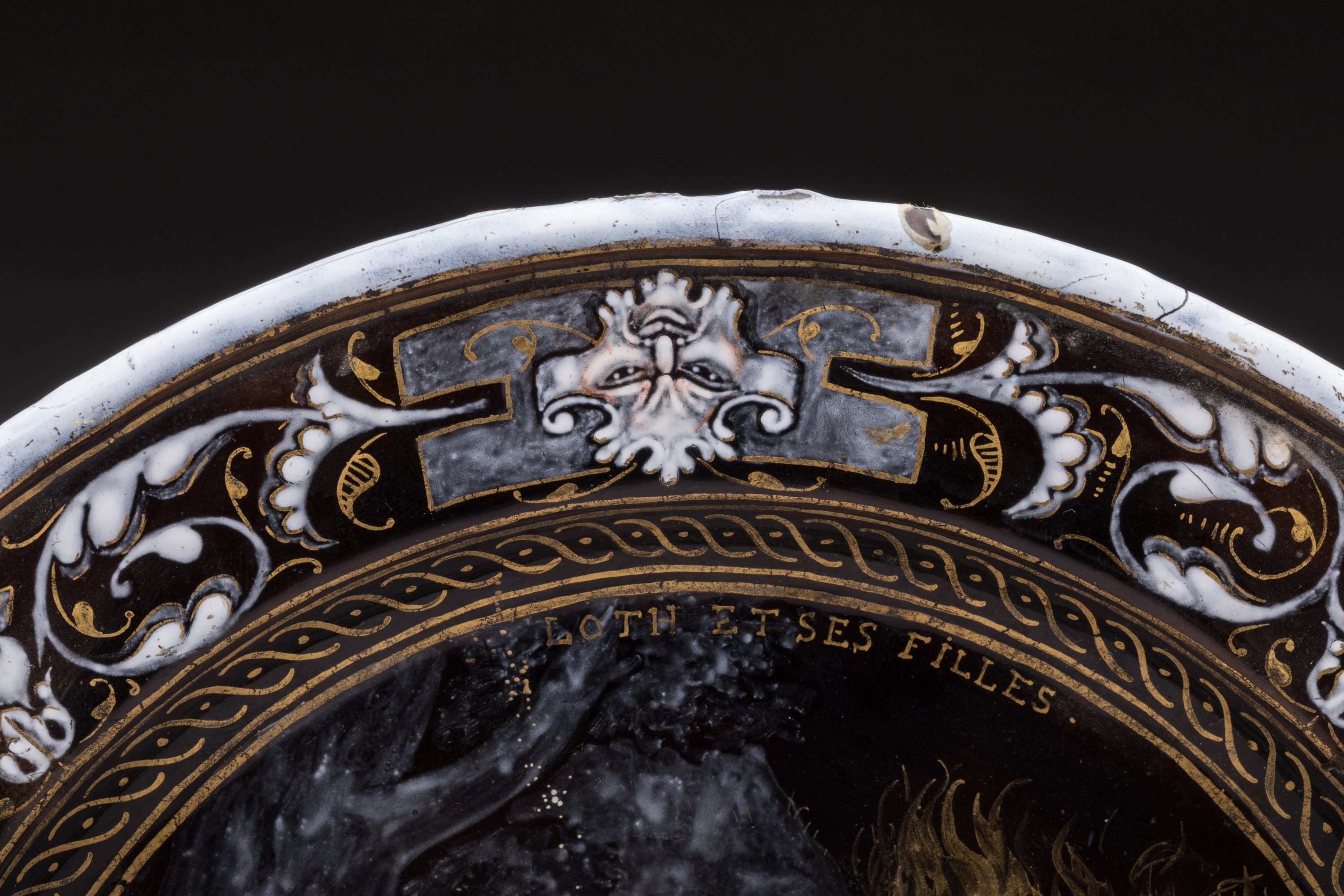 en émail peint en grisaille, les carnations roses, les ornements dorés sur fond noir. Le fond représentant l'ivresse de Loth accompagné de ses filles dans une grotte. À l'arrière-plan, les villes de Sodome et Gomorrhe en feu. La descente ornée de motifs de points et vaguelettes, le marli composé aux quatre points cardinaux de cuirs supportant des têtes de grotesques. Ils sont chacun séparés par des motifs de rinceaux et grappes de fruits. Le dos orné au centre d'un faune entouré de rinceaux tenant ses poignets à la ceinture et croisant ses jambes. La bordure décorée de deux branches croisées s'affrontant jusqu'en partie supérieure.