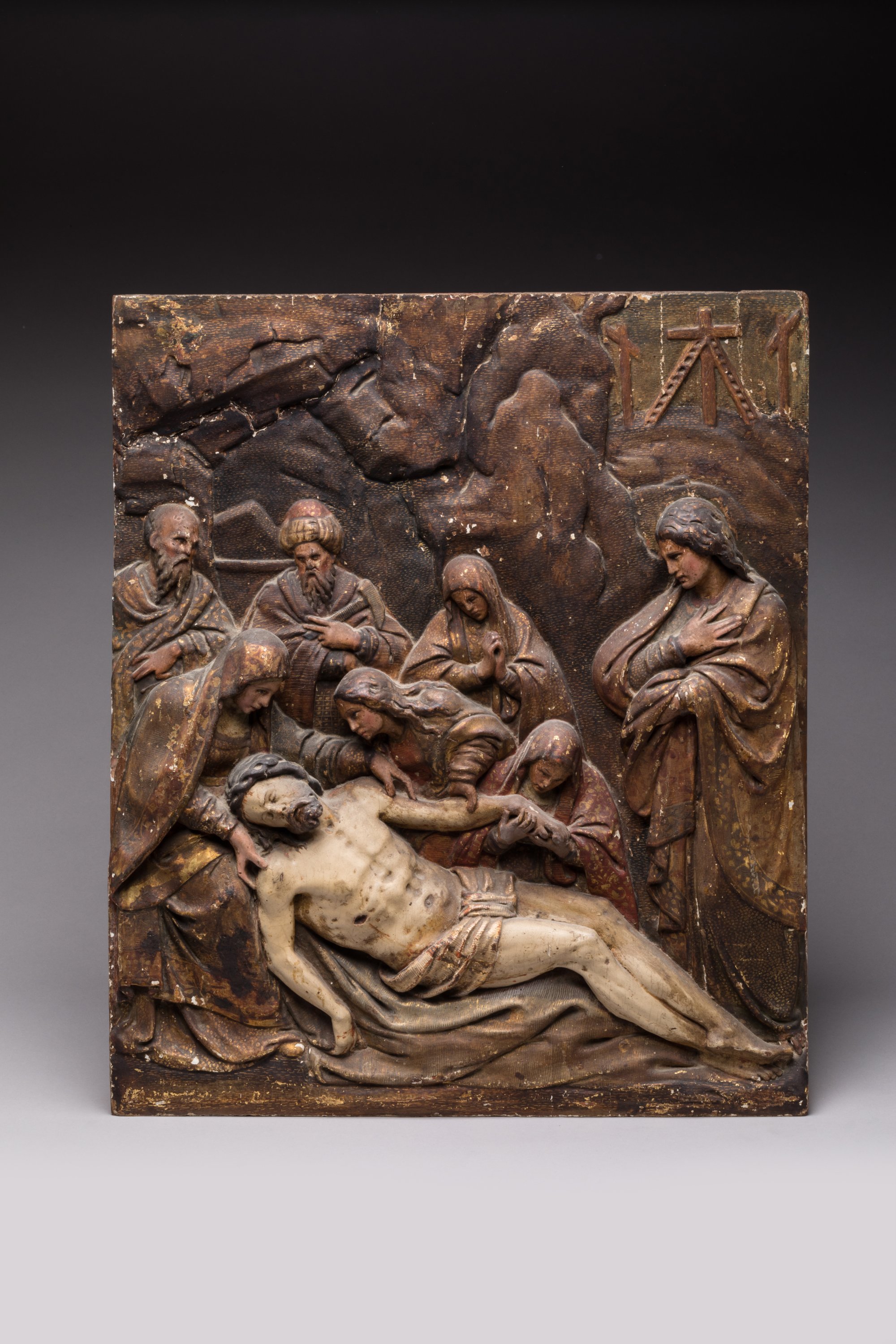 Scene of the deploration of Christ carved in relief on a coniferous wood by the Spanish school of the 16th century.