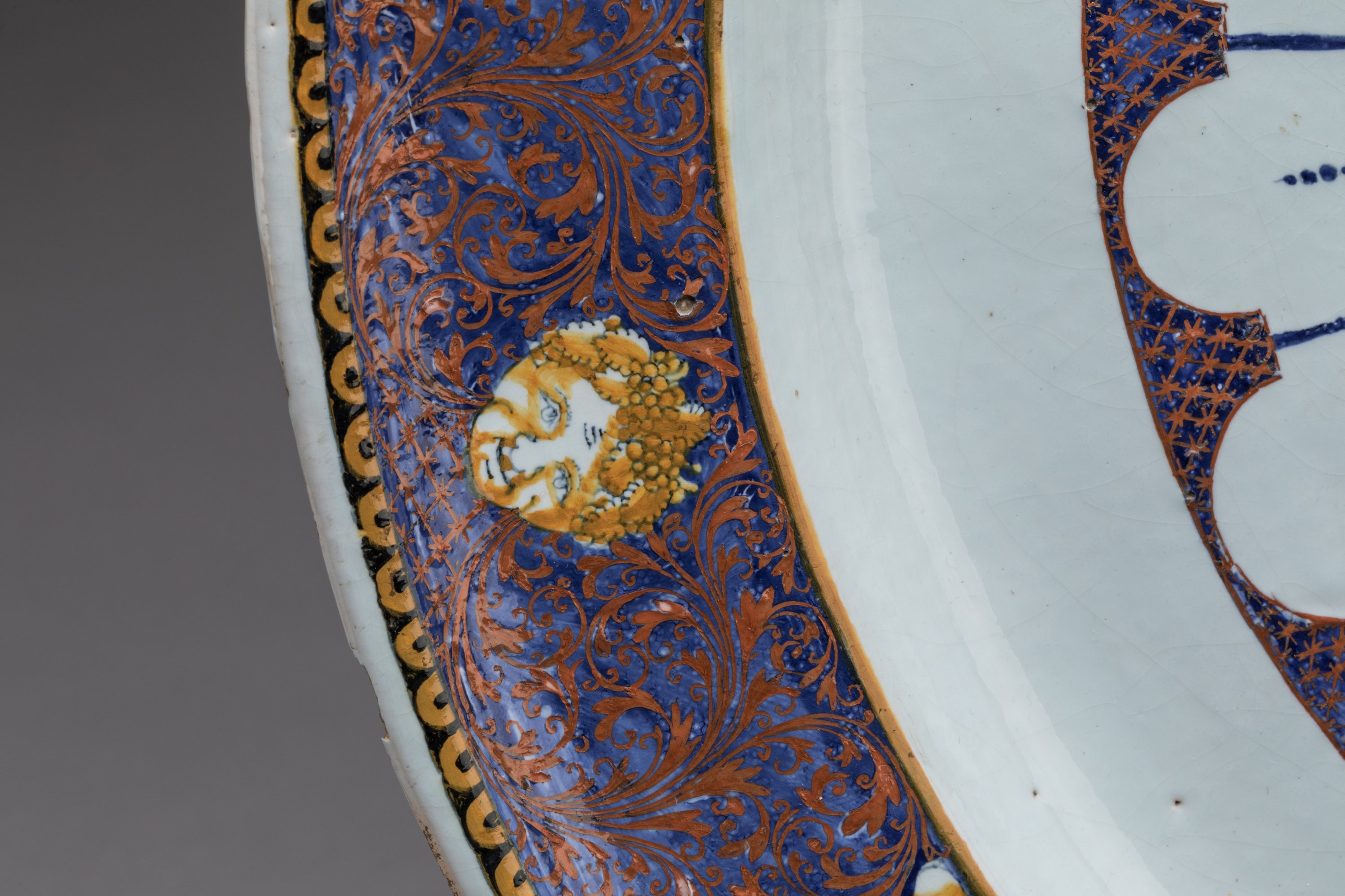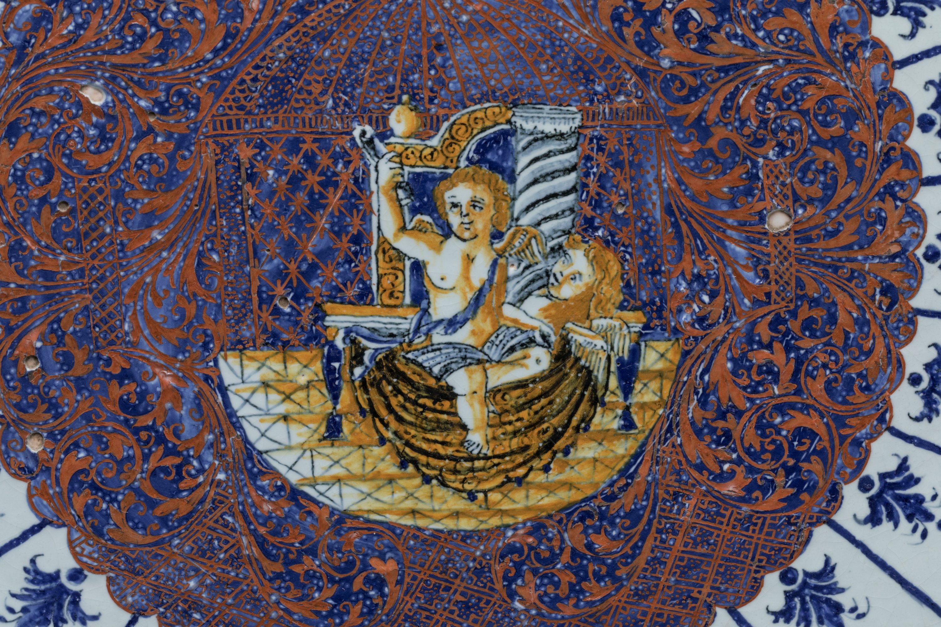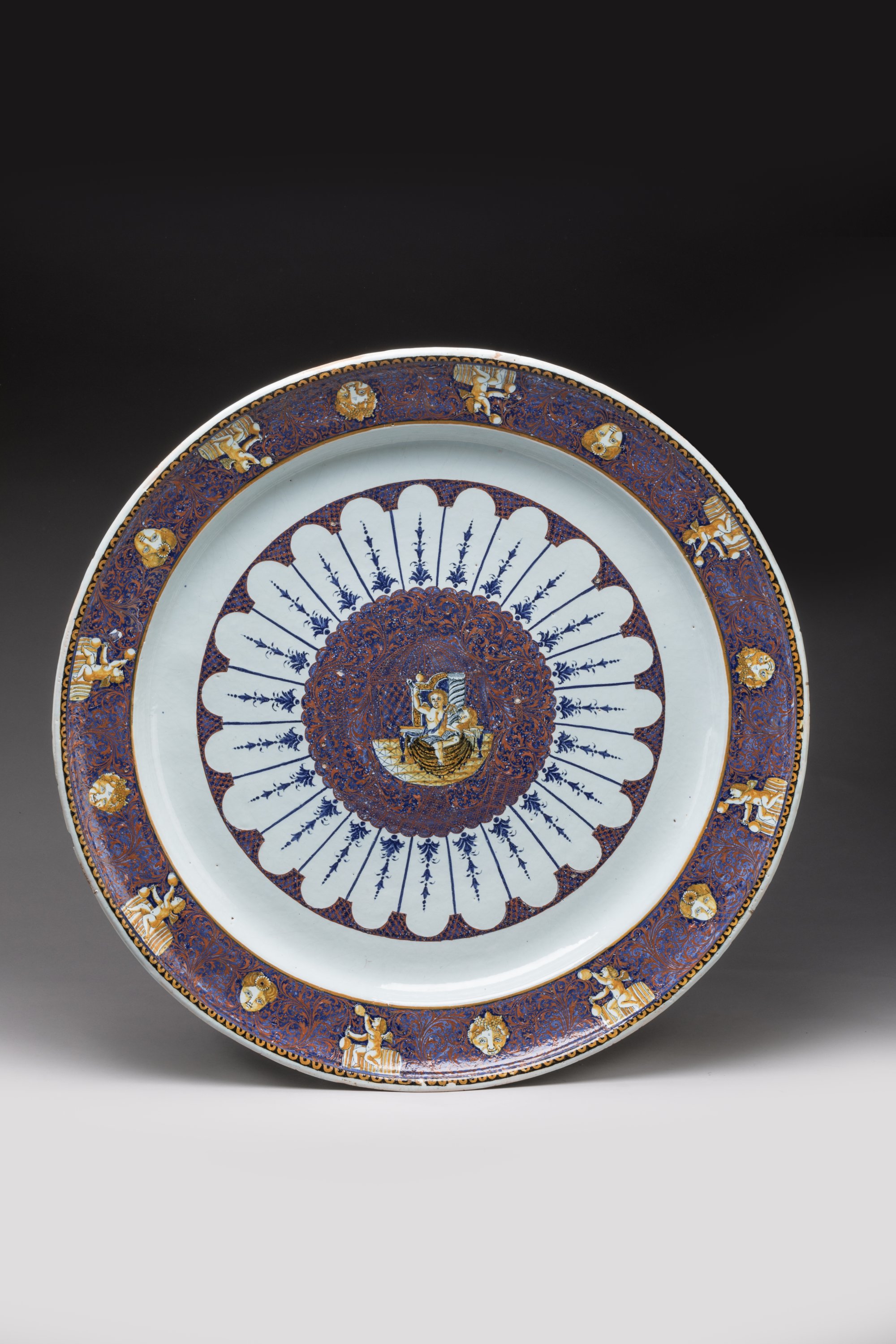 en faïence à décor en ocre sur fond bleu : au centre, deux amours musiciens devant une colonne, une table et un cadre, lun assis sur une draperie, portant sur ses genoux une partition ouverte et tenant un parchemin roulé dans la main droite relevée, inscrits dans un grand médaillon circulaire à fond bleu à décor en ocre dun baldaquin, treillage et larges rinceaux feuillagés, dans un plus large médaillon orné de fleurons rayonnants en bleu et dune bordure à treillage ocre sur fond bleu. Laile est décorée en ocre damours tenant deux bouteilles assis sur un tonneau, alternant avec des mascarons de Bacchus et de Flore sur un fond bleu orné de rinceaux feuillagés et treillage en ocre à leffet niellé, le bord souligné de godrons simulés en ocre sur fond noir.