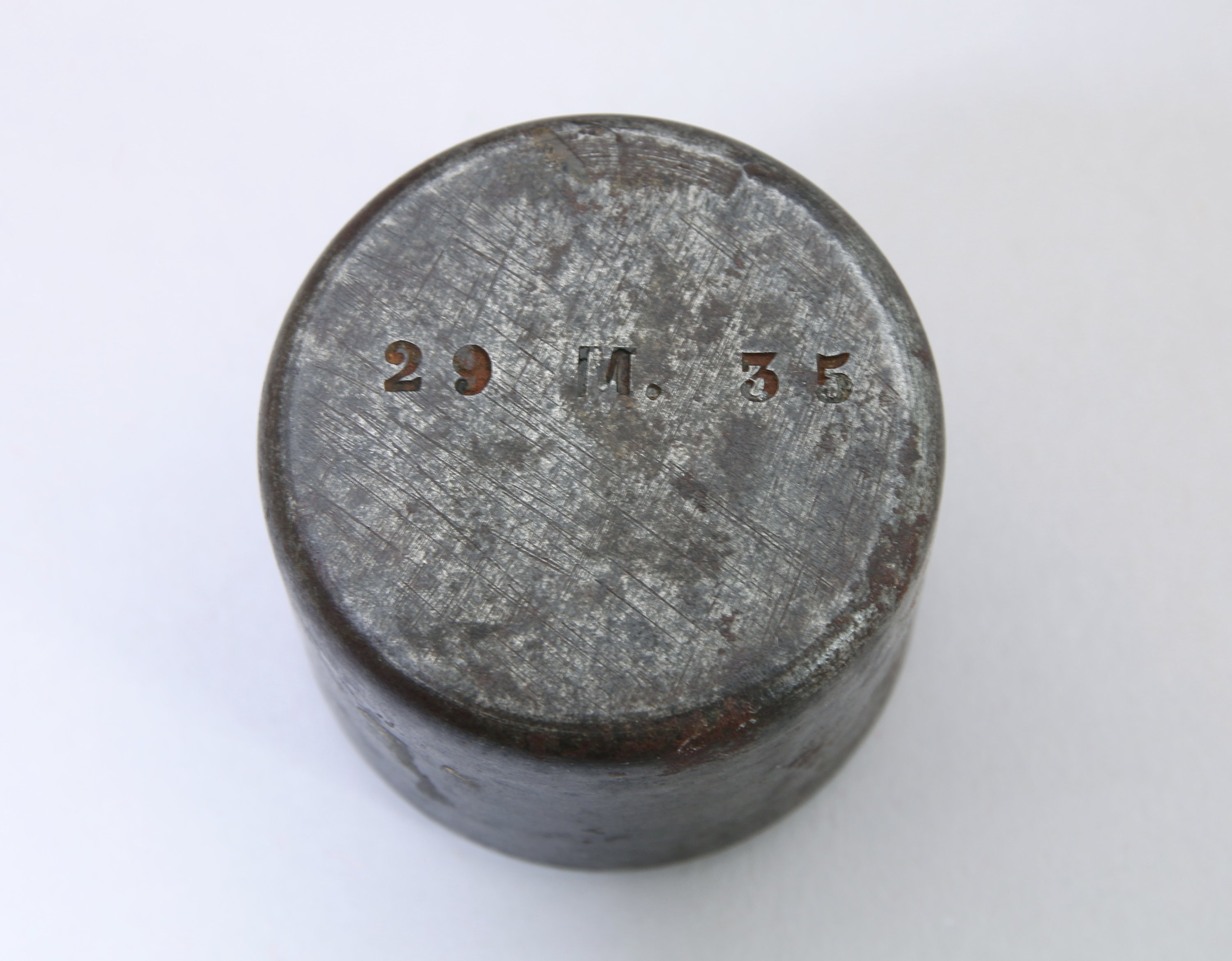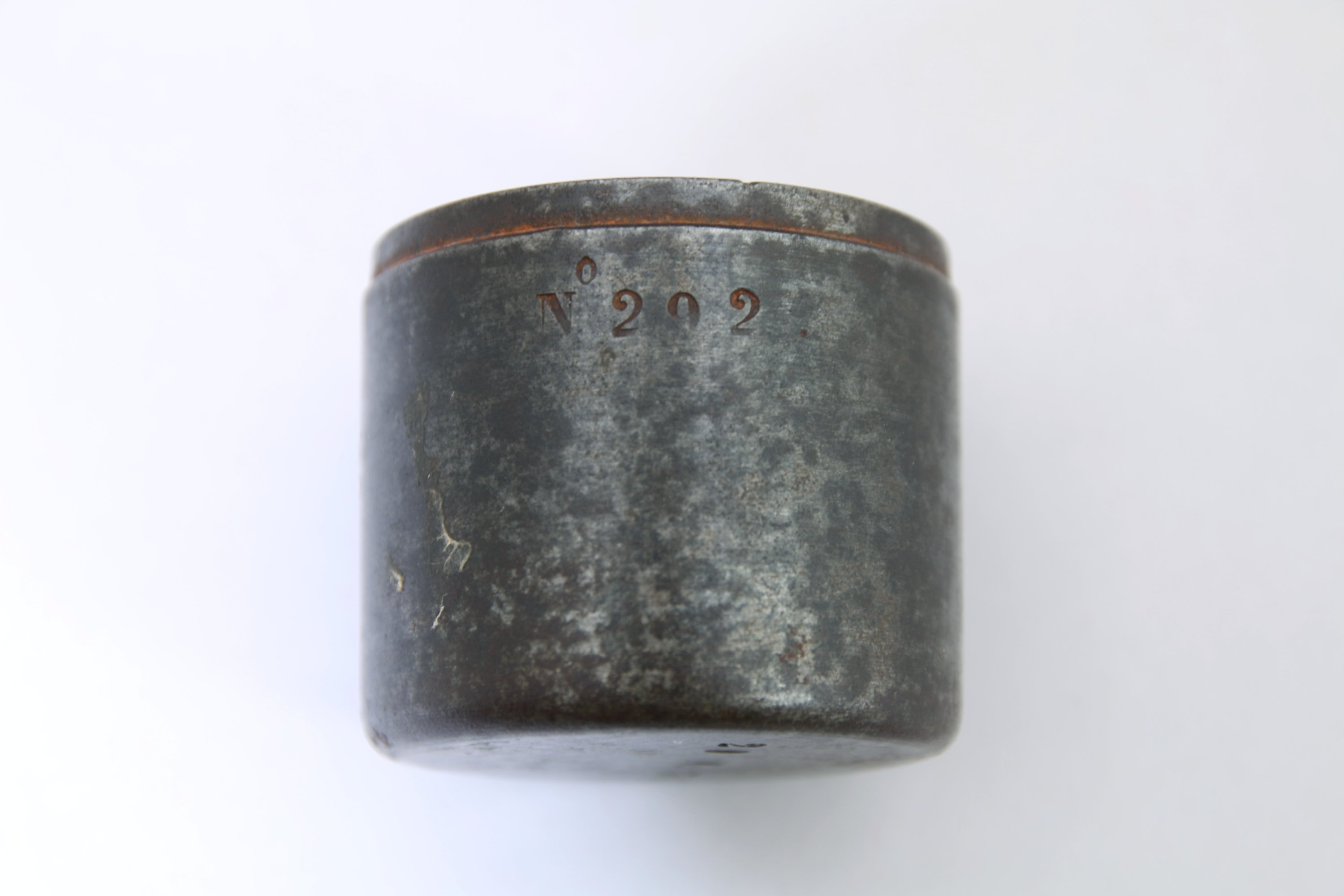 de forme cylindrique en acier gravé des armes de gueule, à la tour donjonnée de trois pièces d'or, maçonnées de sable et de la devise du maréchal "Honos ab Amis: "l'honneur nous vient des armes".