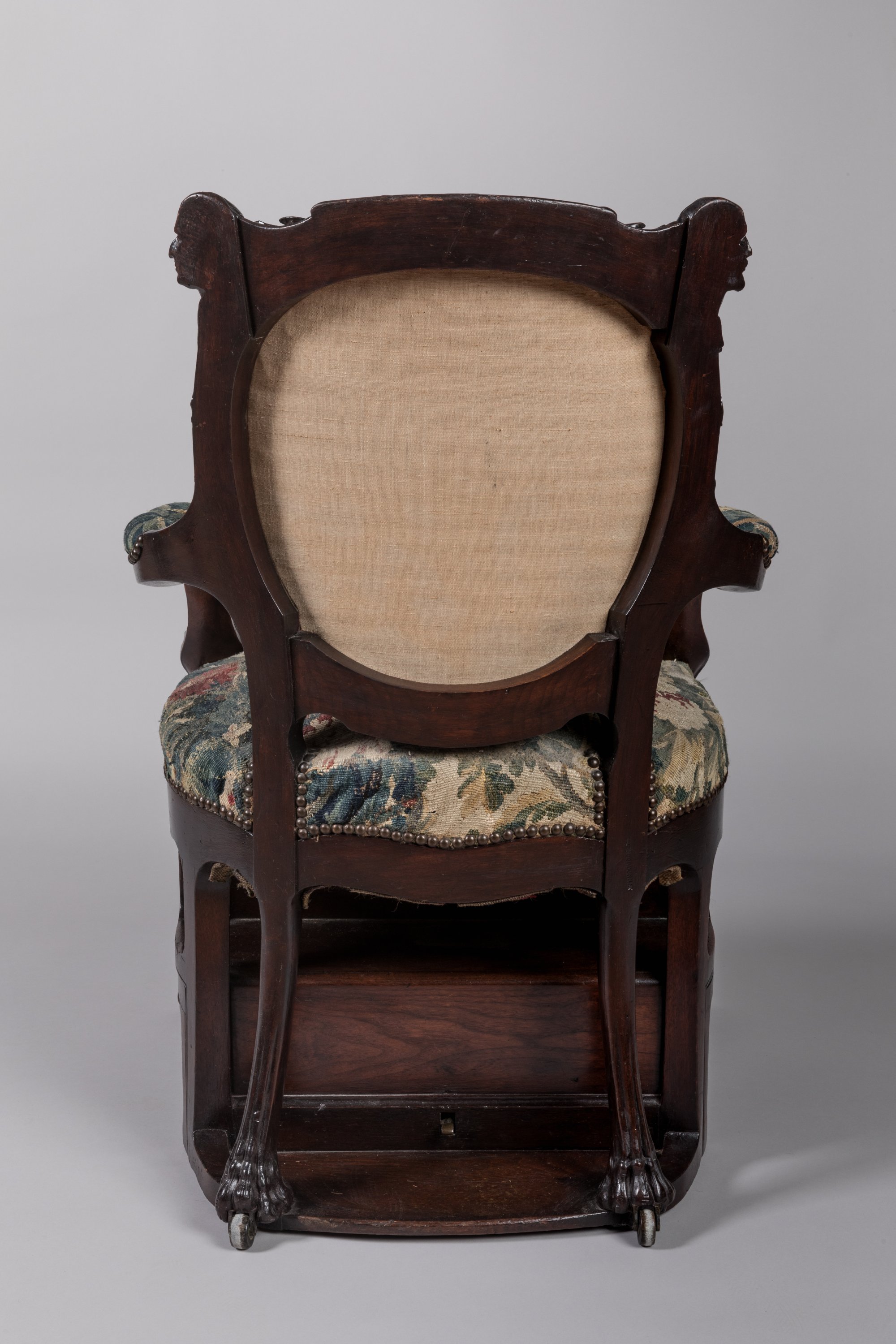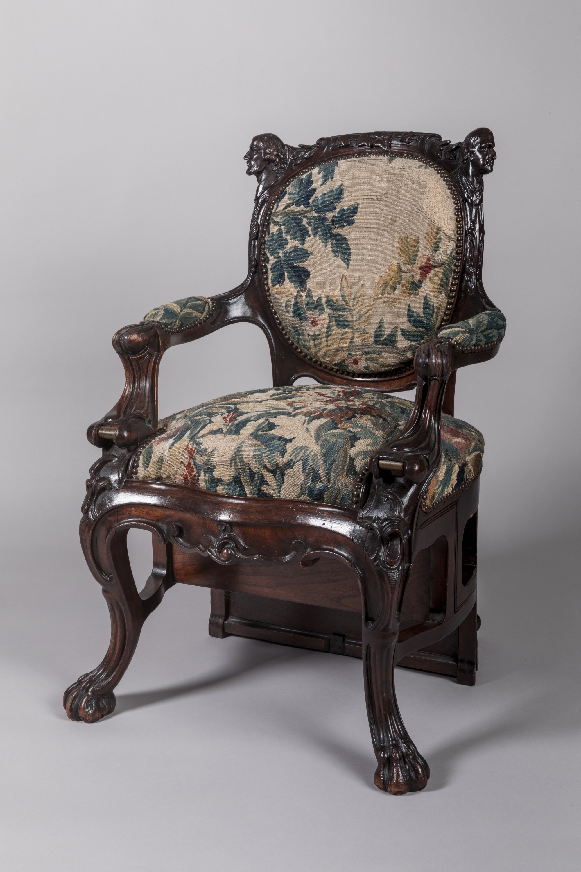It has a lively shape with leaf and scroll decoration and rests on four claw feet, two casters at the back. A knob behind the chair operates brass levers that extend five steps.
