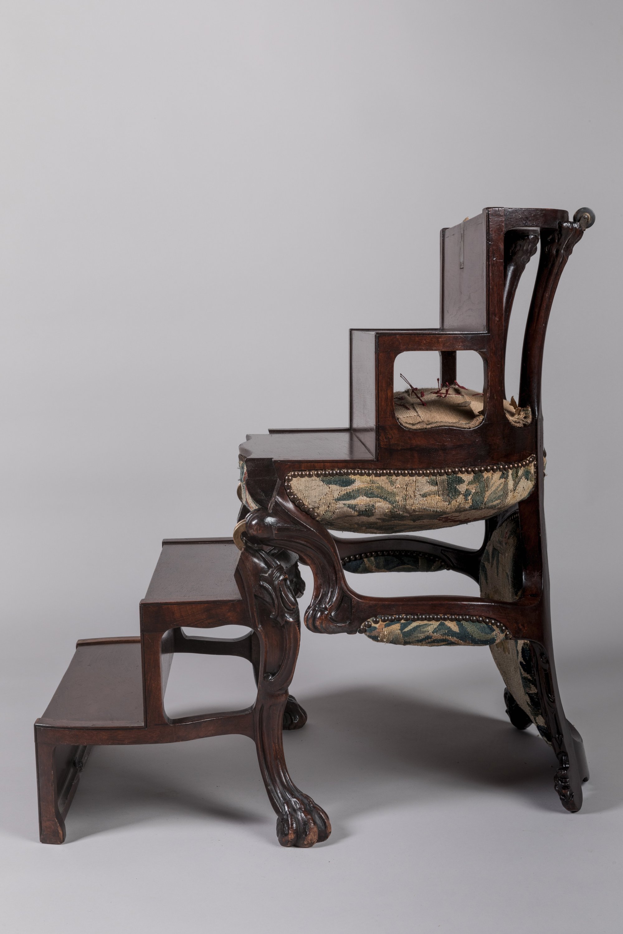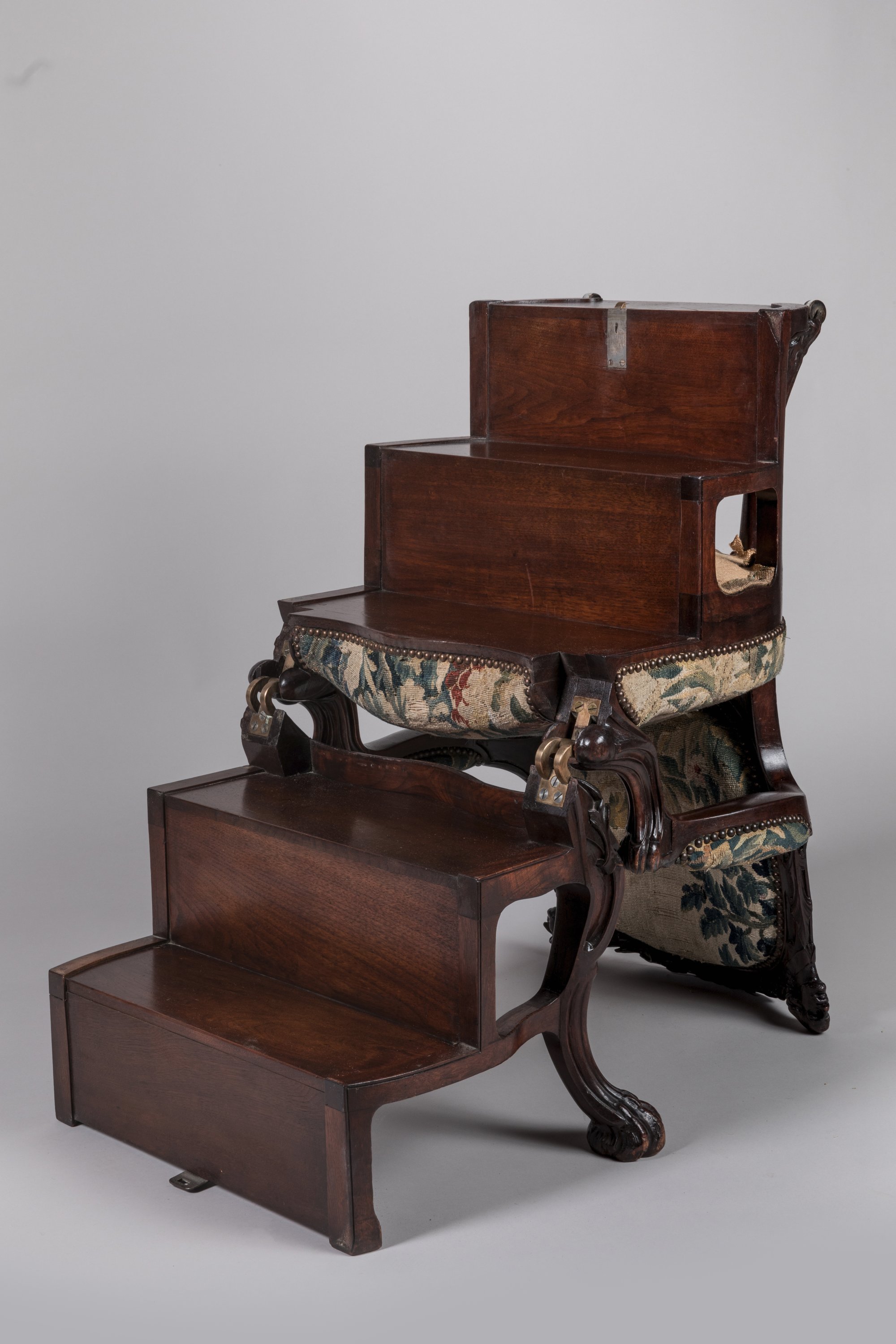 De forme mouvementée à décor de feuilles et d'enroulements, il repose sur quatre pieds griffes, deux roulettes à l'arrière. Un bouton-clapet placé derrière le fauteuil permet d'actionner des leviers en laiton qui déploient cinq marches.