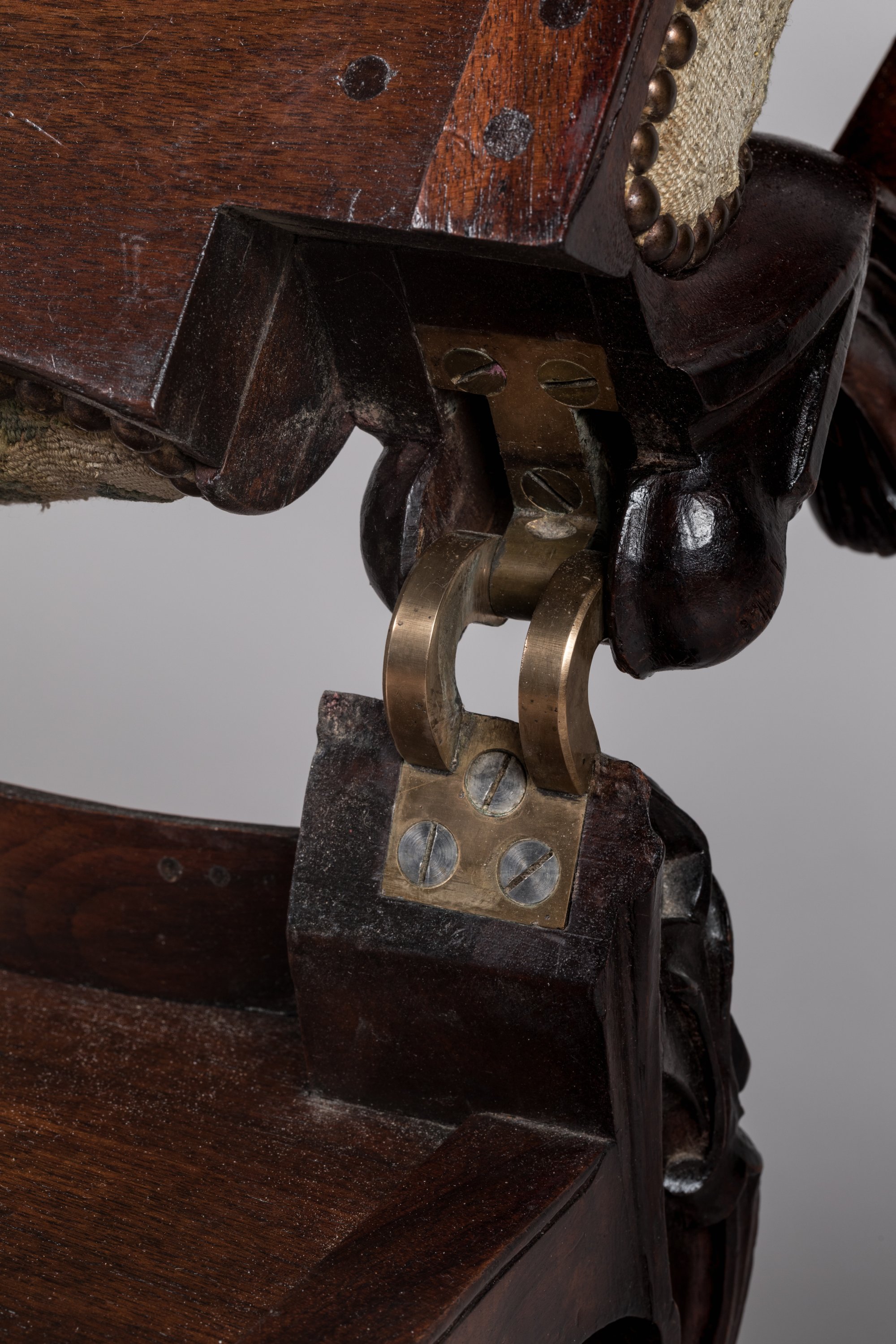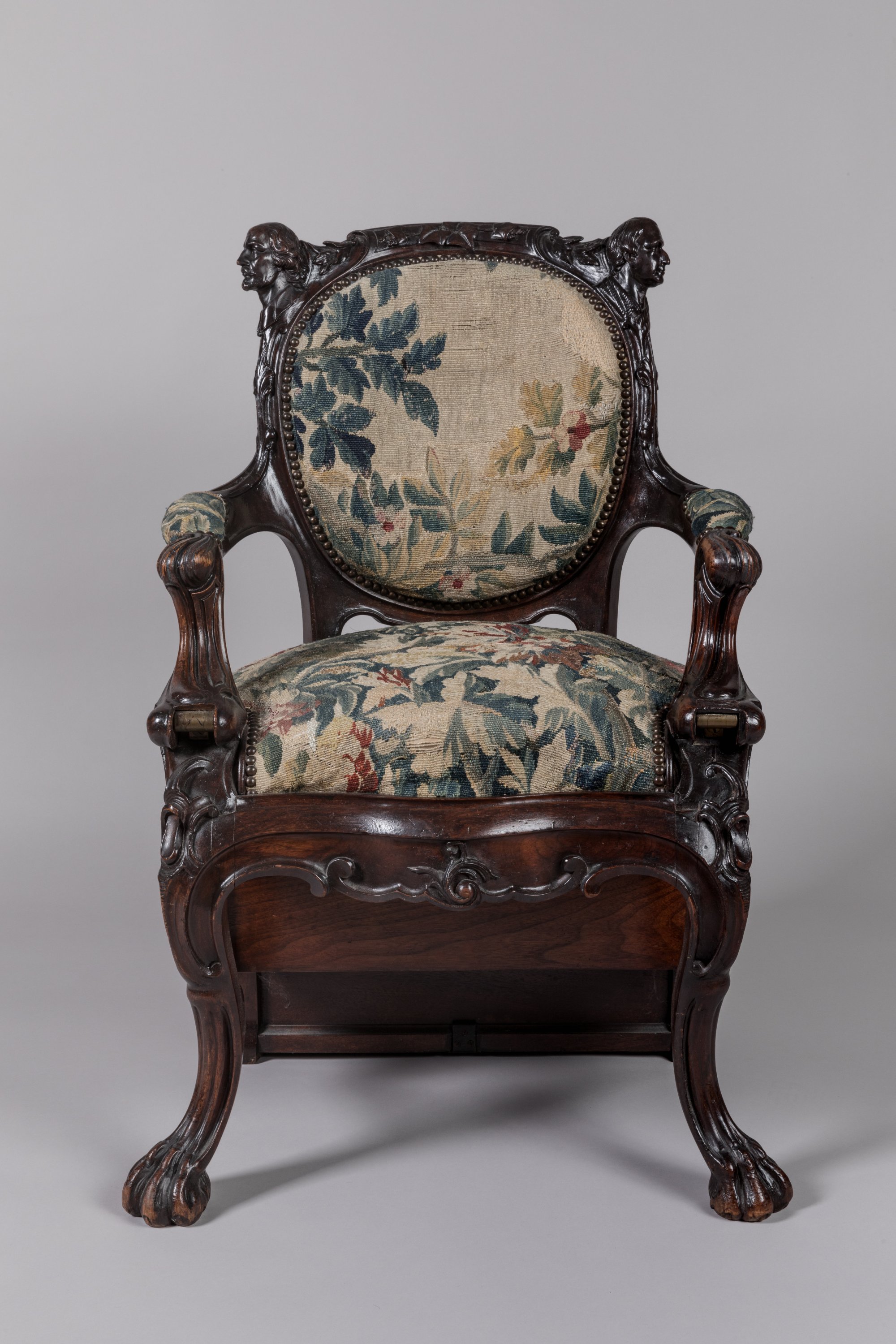 The profiles of our armchair represent Henry Clay (1777-1852) and Daniel Webster (1782-1852), two prominent American senators, who together with John C. Calhoun formed the "Great Triumvirate". Considered one as slavers and the other as anti-slavers, they are joined back to back on this armchair, whose patented mechanism the year after their death was probably made for an American "mechanical fair", ancestor of the World Fairs.