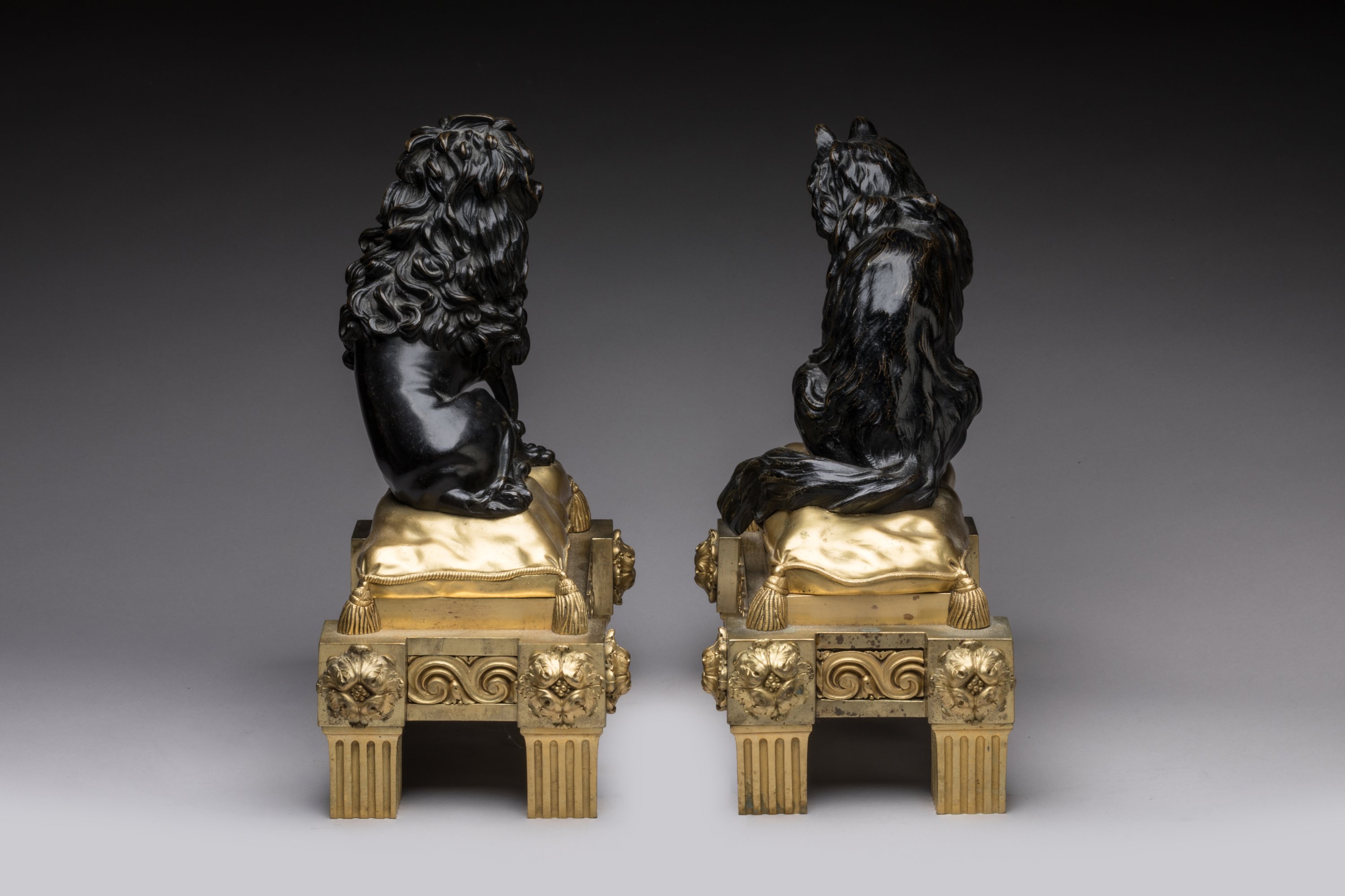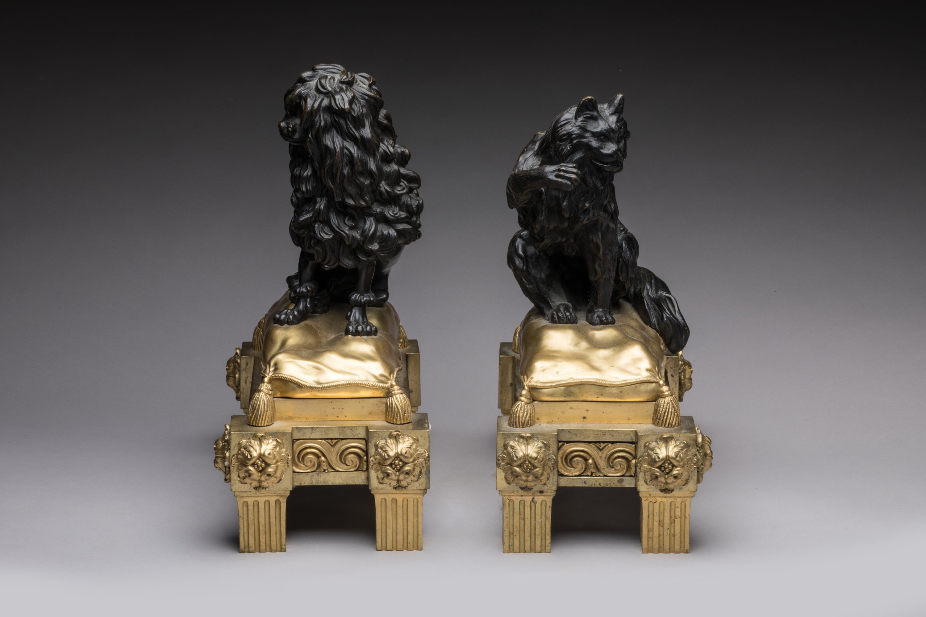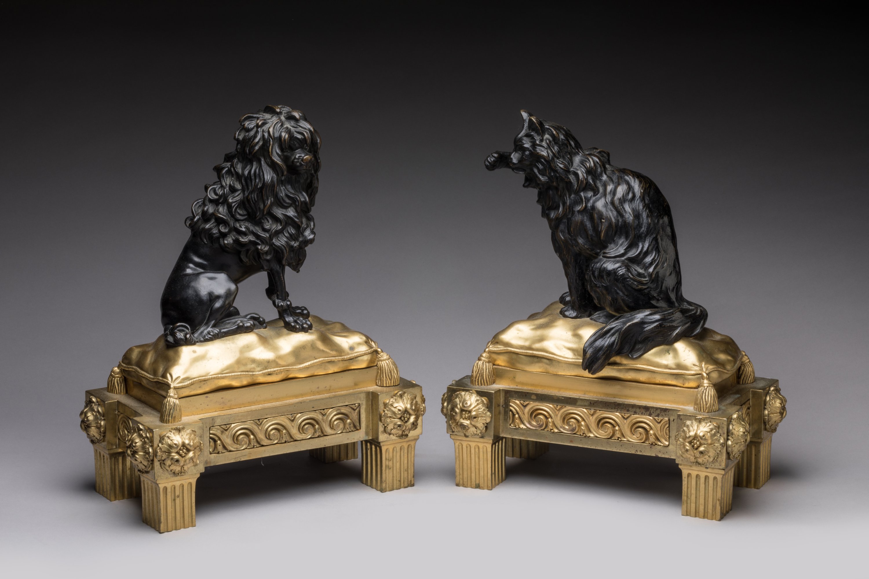 en bronze ciselé, patiné et doré, figurant en ronde bosse un chien et un chat assis sur des coussins. Ils reposent sur des bases quadrangulaires à ressauts ornées de fleurs et de frises d’entrelacs. Sur quatre piles cannelées.