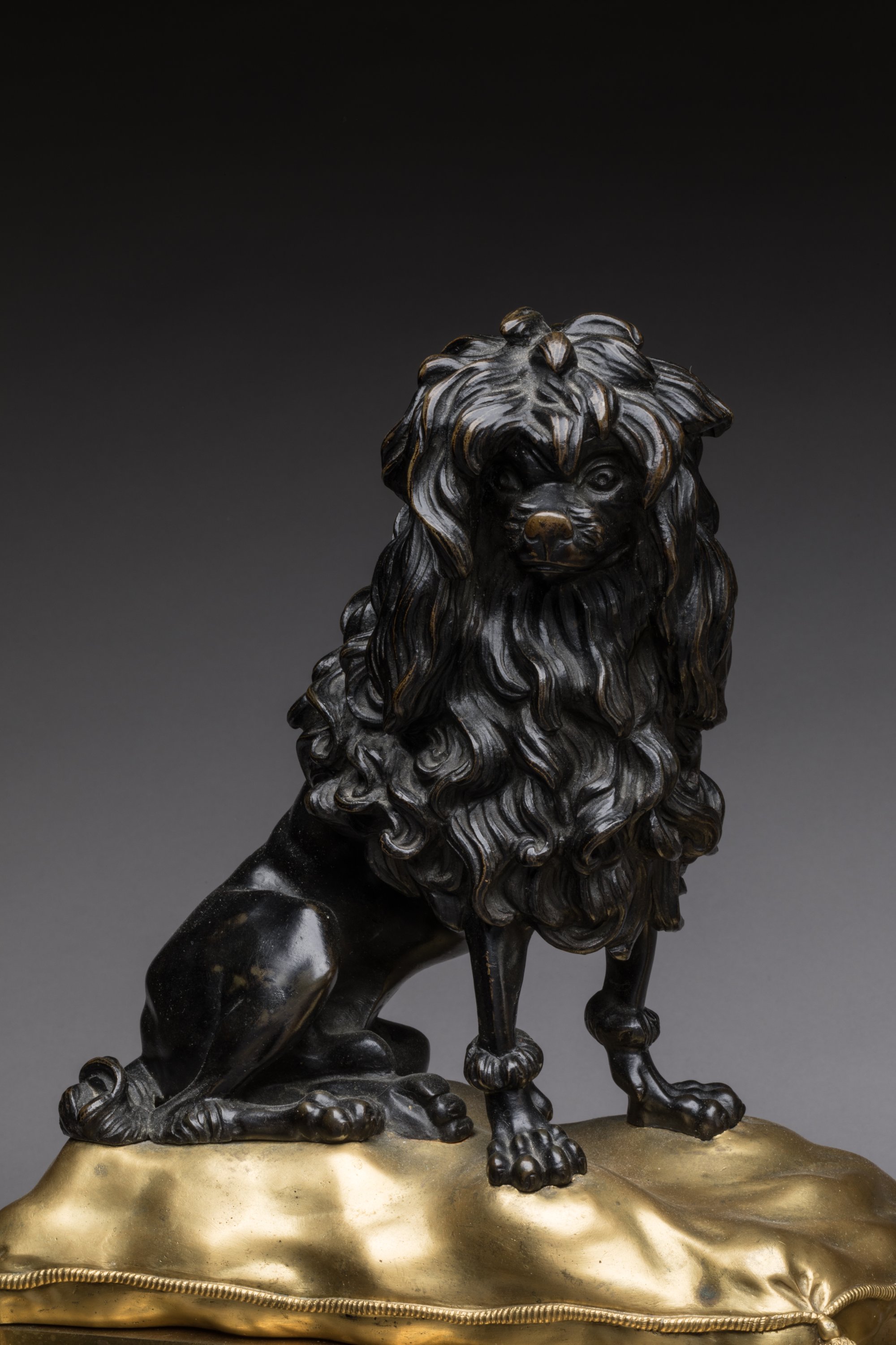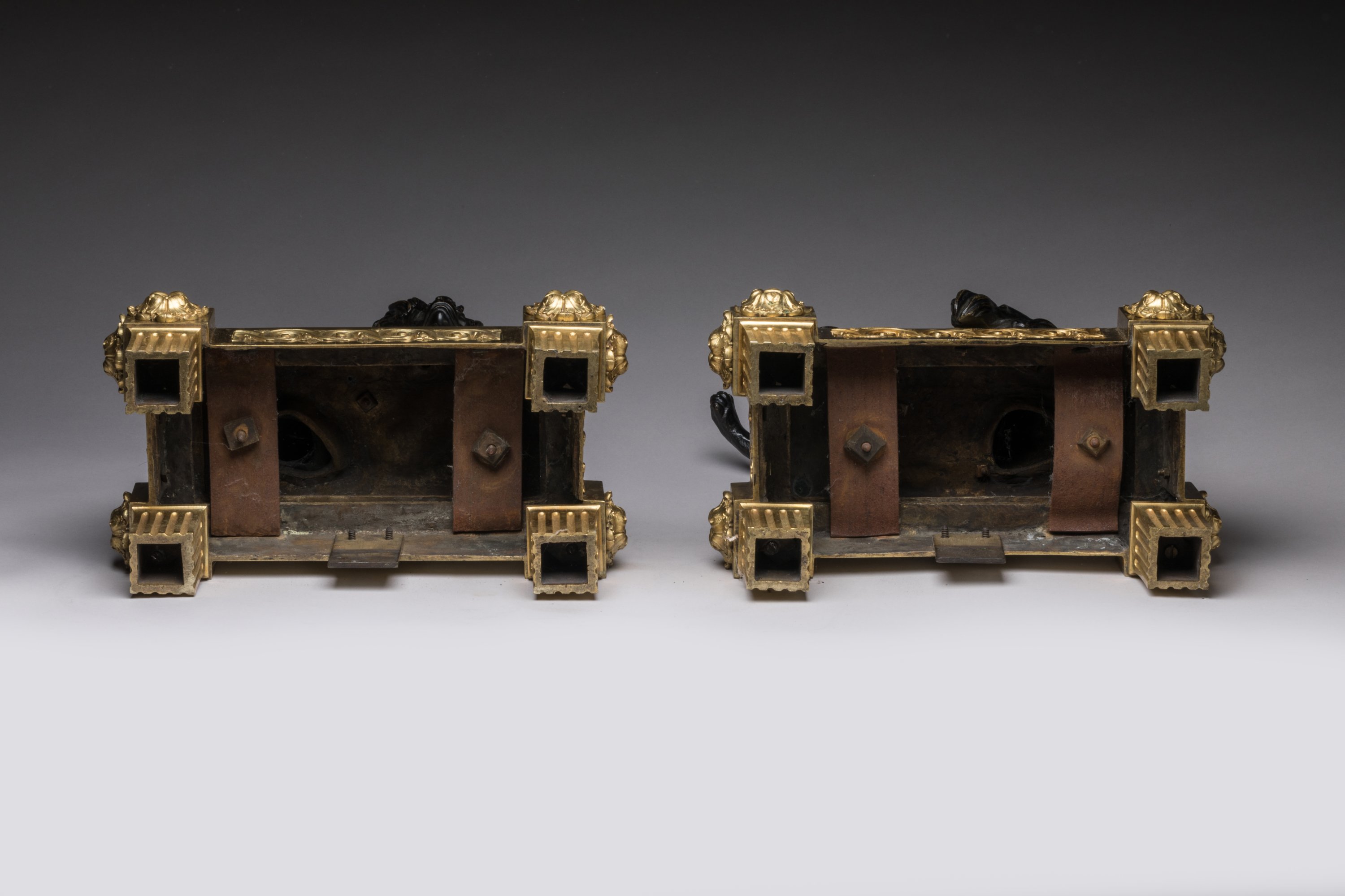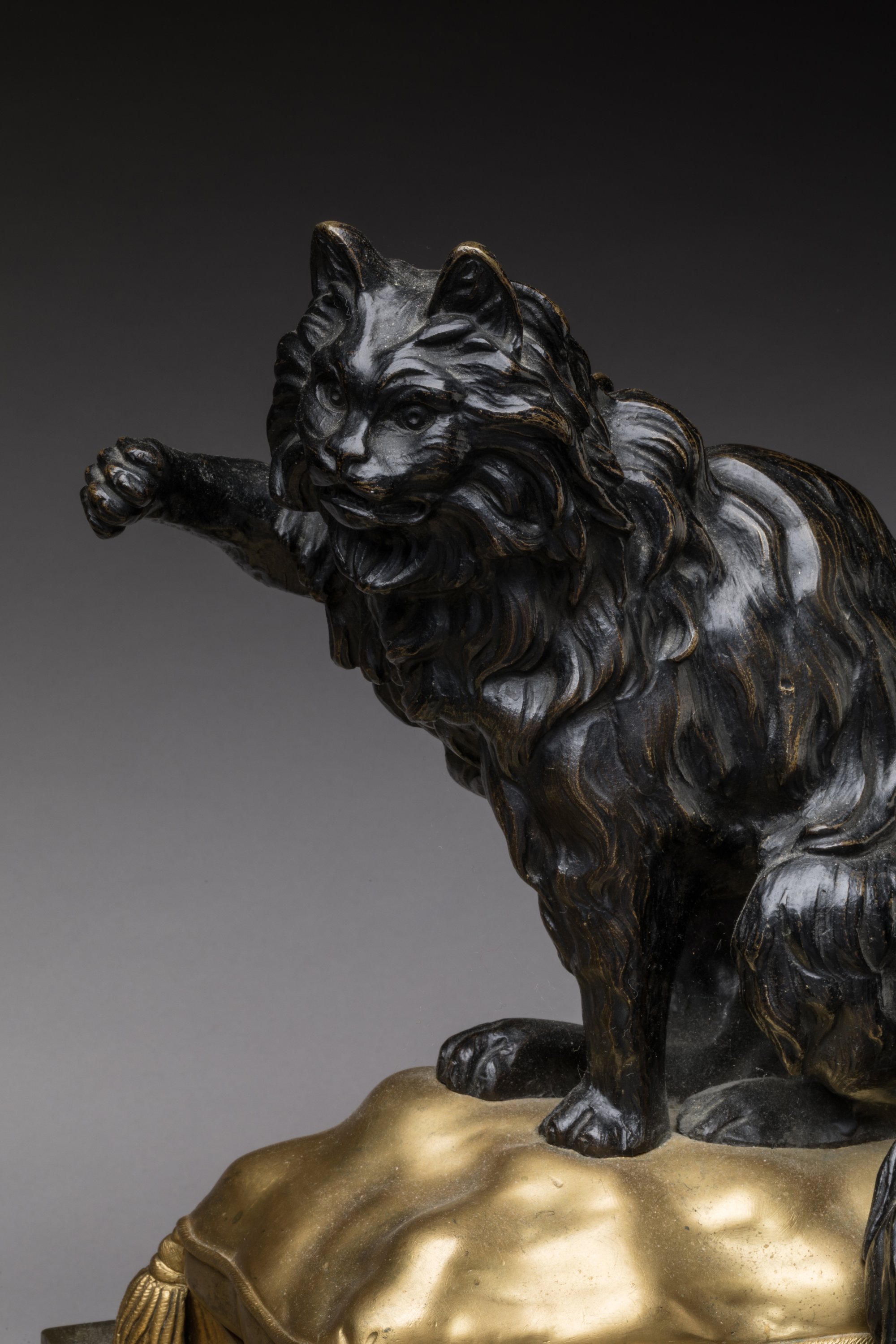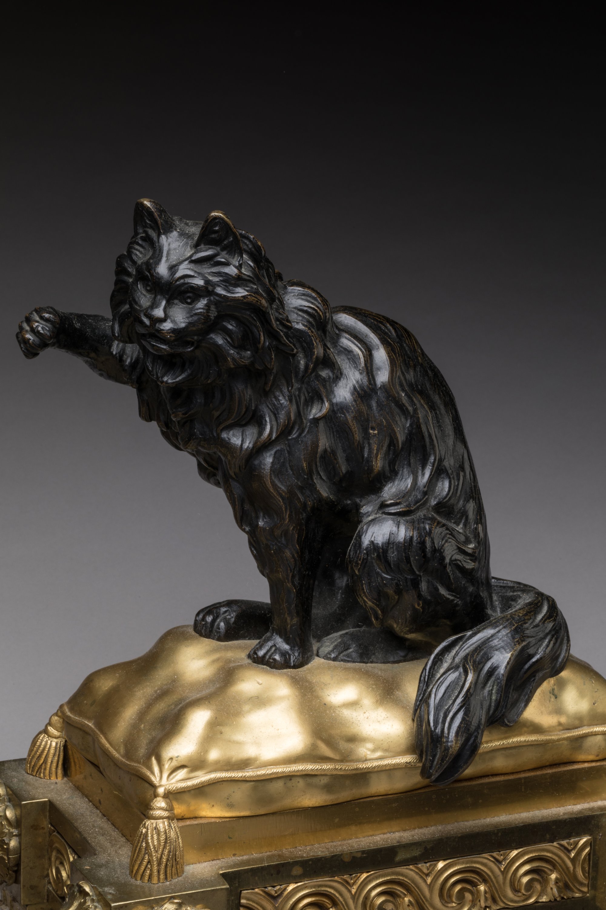 en bronze ciselé, patiné et doré, figurant en ronde bosse un chien et un chat assis sur des coussins. Ils reposent sur des bases quadrangulaires à ressauts ornées de fleurs et de frises d’entrelacs. Sur quatre piles cannelées.