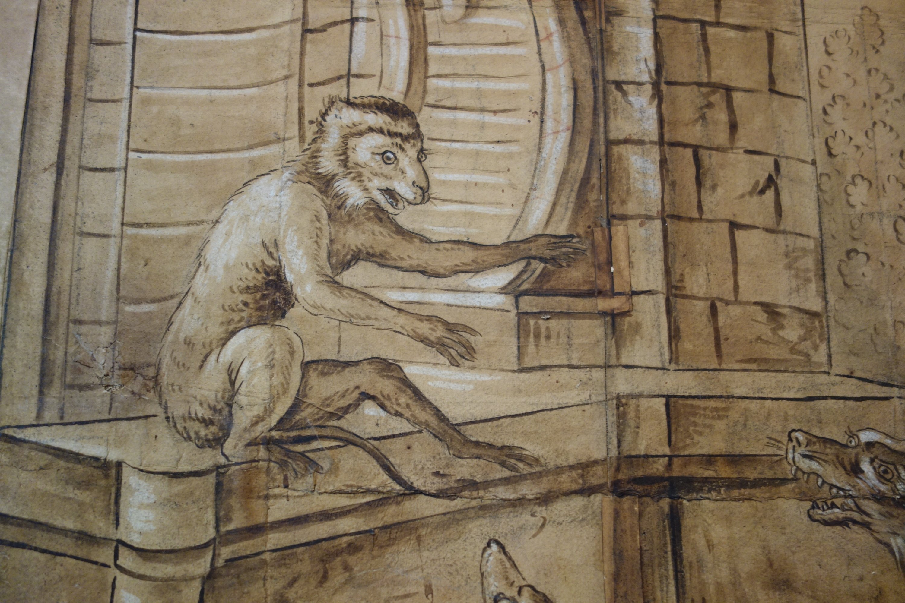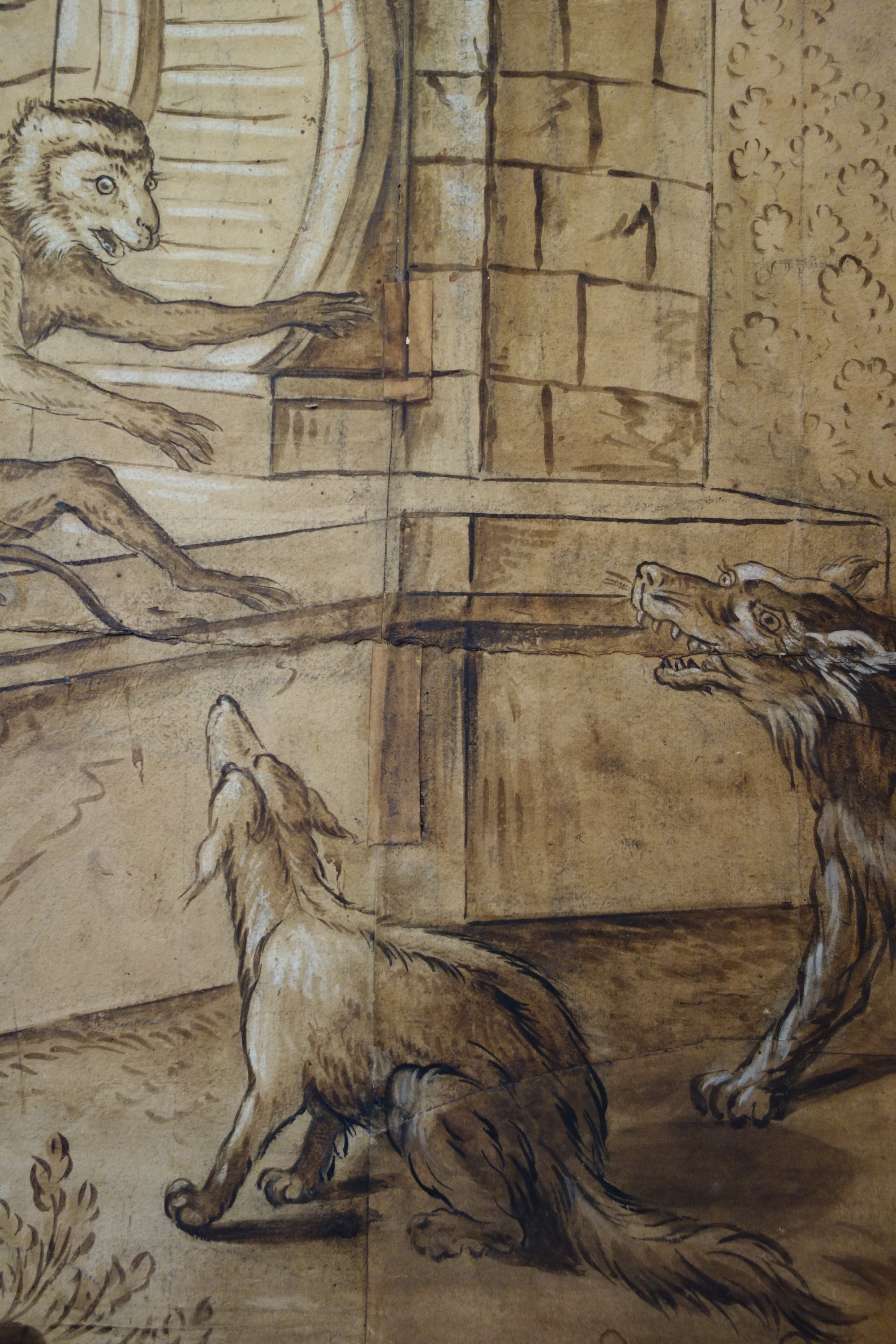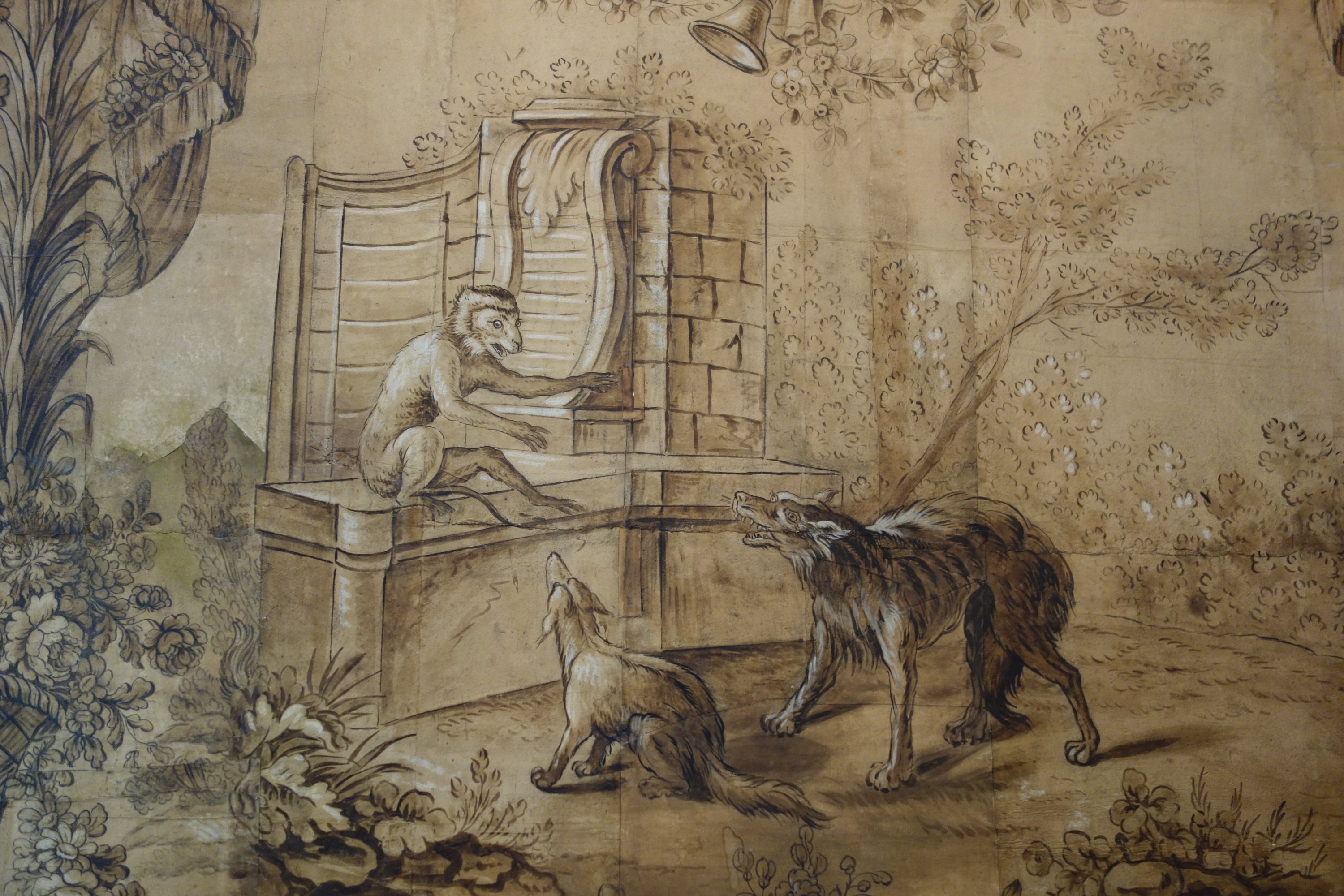 Workshop of Jean-Baptiste OUDRY. The Wolf pleading against the Fox before the Monkey. Brush and black ink, brown ink, black pencil, sanguine traces and white gouache highlights on numerous sheets assembled and mounted on canvas.