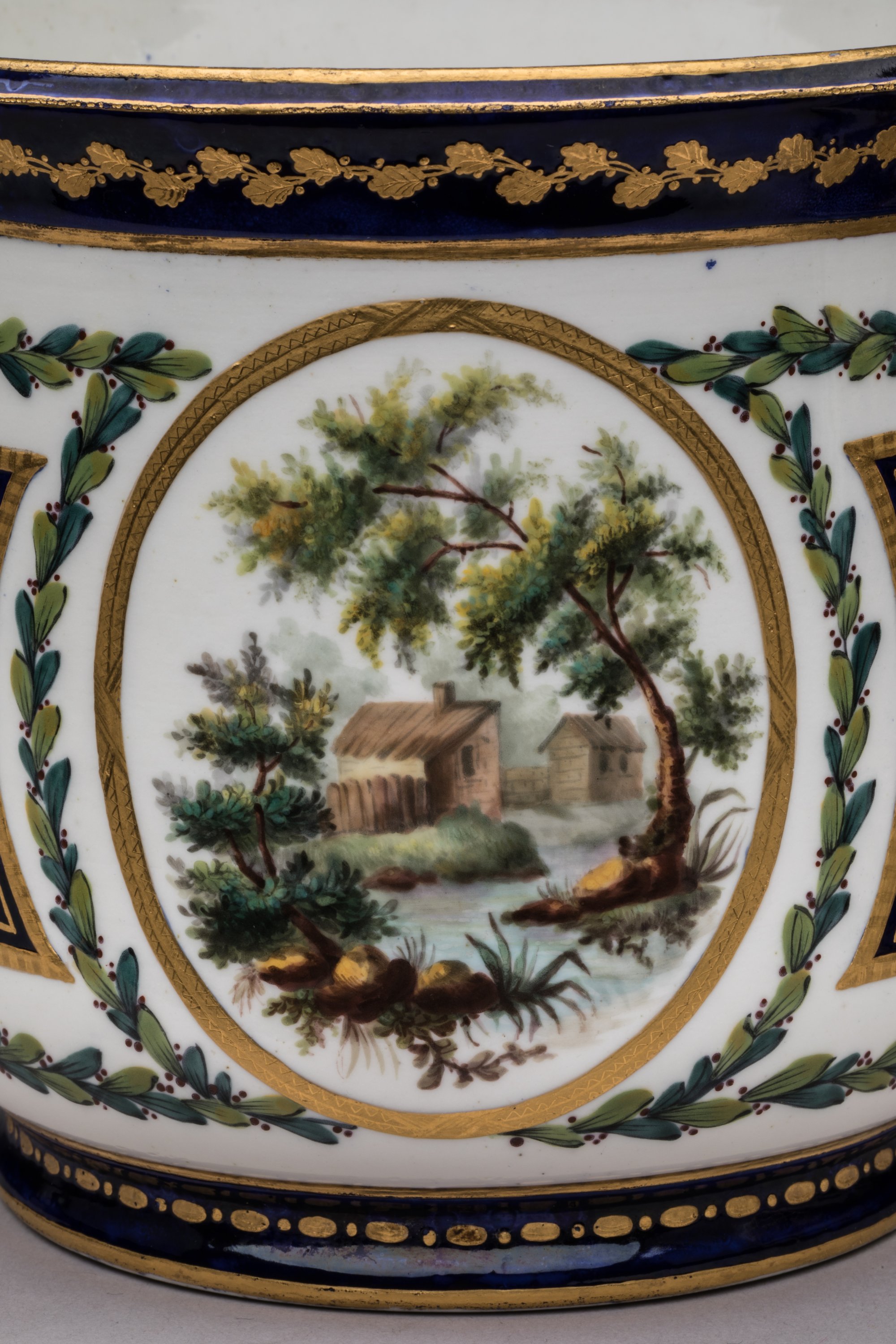en porcelaine tendre à décor polychrome et or, sur chaque face de cartouches ornés de paysages champêtres cernés d'un épais filet or, d'une large guirlande de feuilles de laurier et jetés de rose, croisillons or sur fond bleu, filets et peignés or sur les prises et les bords.